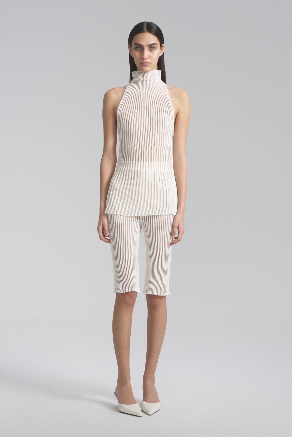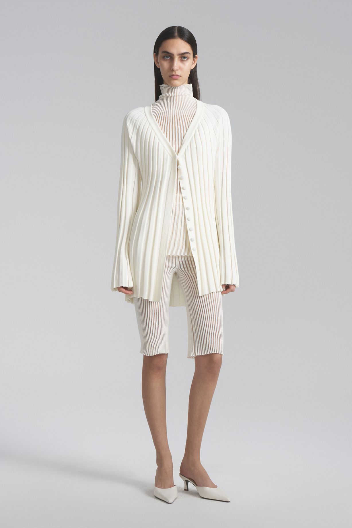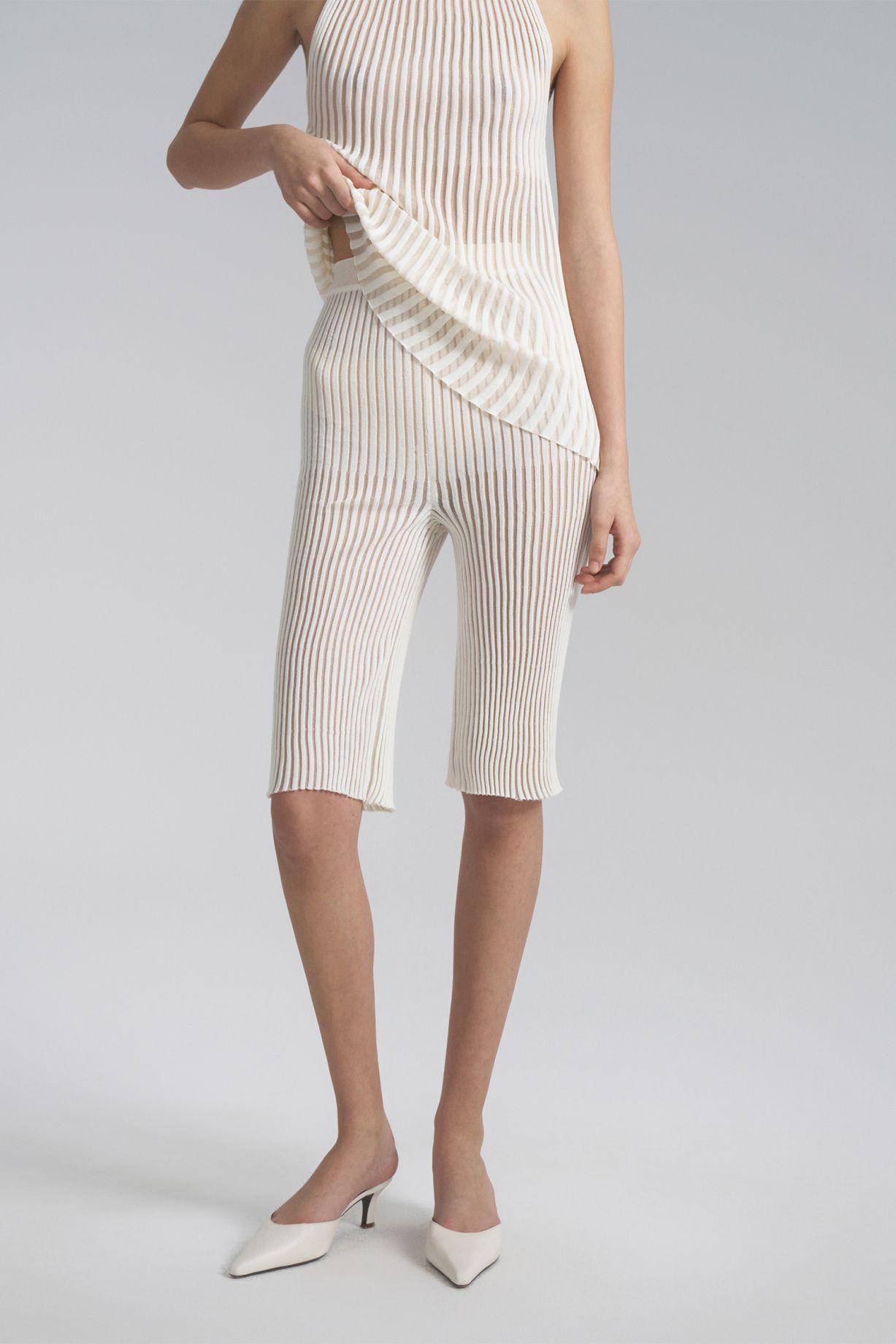 Бермуды из невесомой премиальной итальянской пряжи прямого кроя с поясом. Связаны из двух видов пряжи - более плотная в зоне бедер и расширение книзу.Состав: 61% вискоза, 30% нейлон, 9% эластан