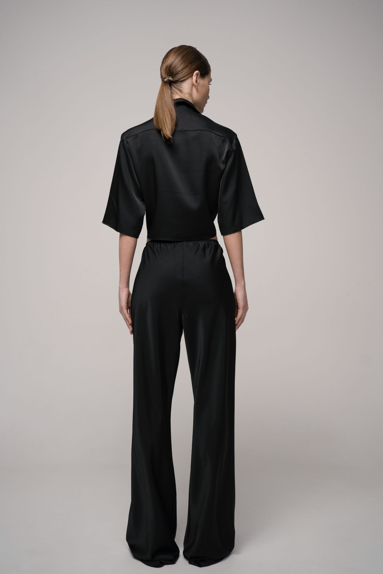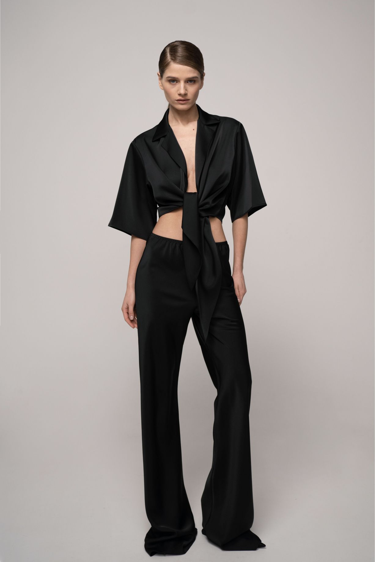 Блузка из натурального шелка, отложной воротник, широкий рукав и удлиненный передний край для возможности разных стилизаций изделия.Состав: 70% вискоза, 30% шелк