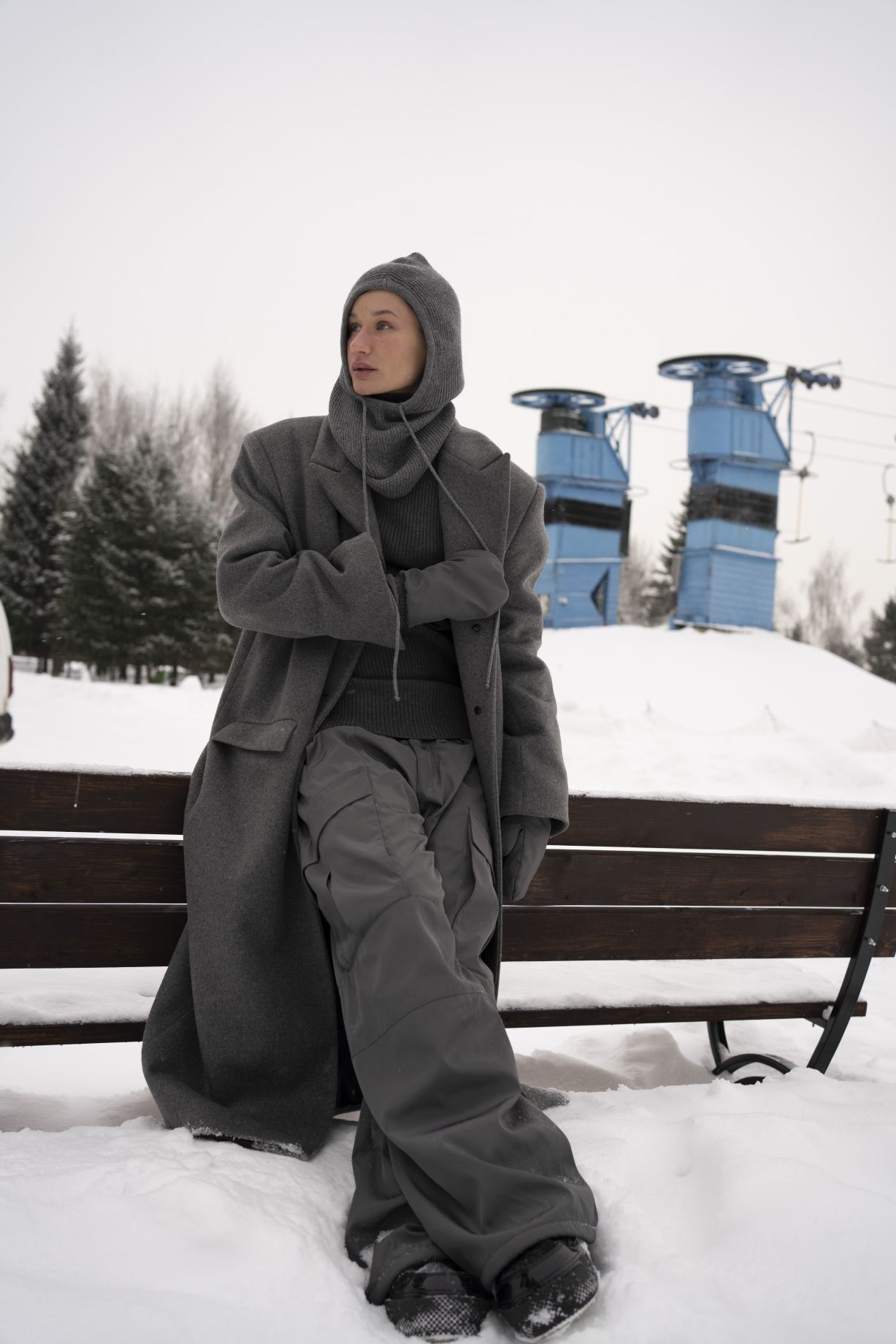 Объемные брюки свободного кроя, прямого кроя, с крупными накладными карманами и регулируемой кулиской снизу, с добавлением утеплителя.