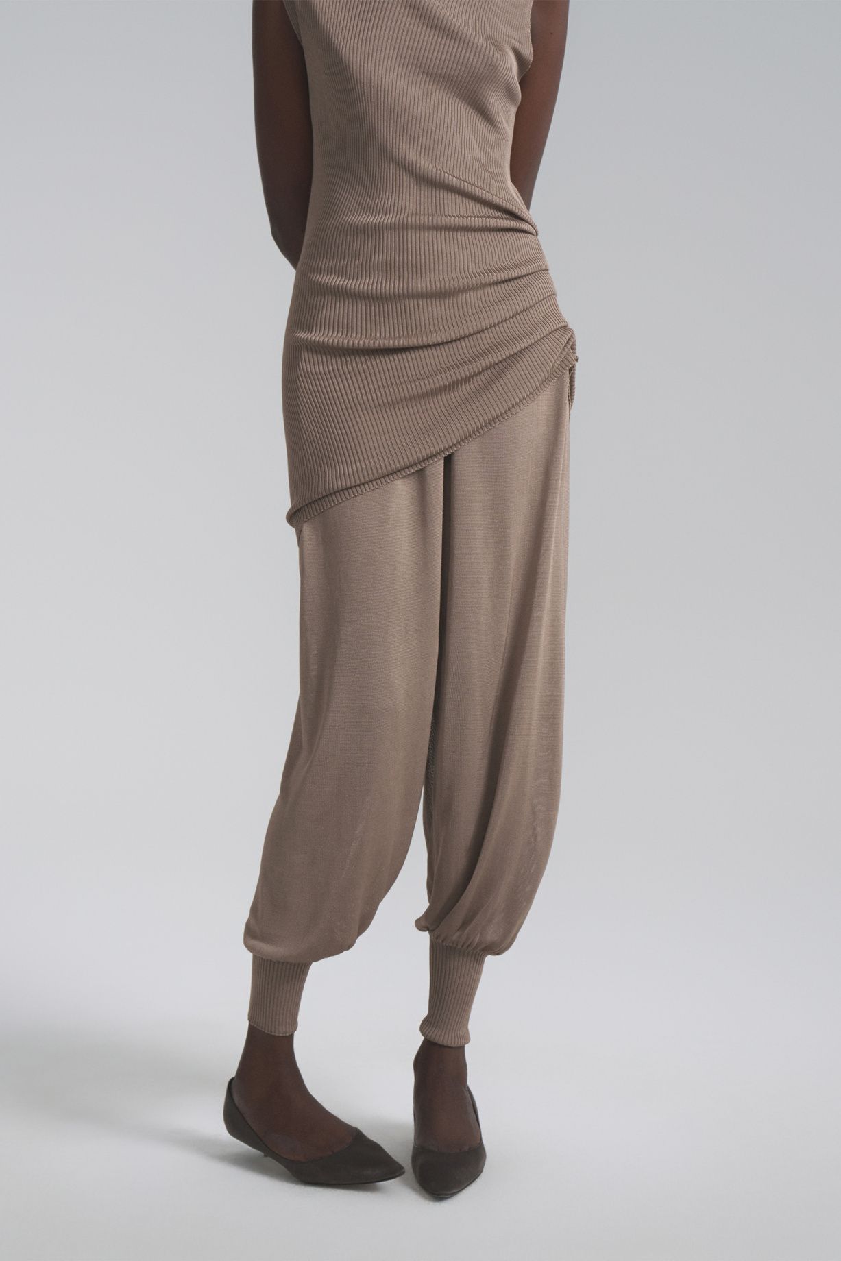 Брюки - шаровары со сборками из шелковой вискозы с охлаждающим эффектом на средней посадке и манжетами.Состав: 20% шелк, 80% вискоза