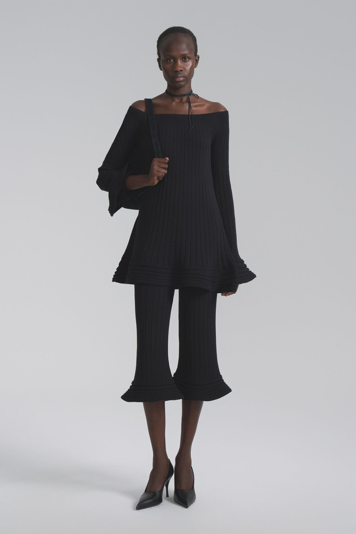Укороченные трикотажные брюки полуприлегающего кроя, цельновывязанные манжеты с поперечной вязкой и формой в виде волны, высокая посадка и эластичный пояс для большего комфорта.Состав: 72% вискоза, 28% эластан