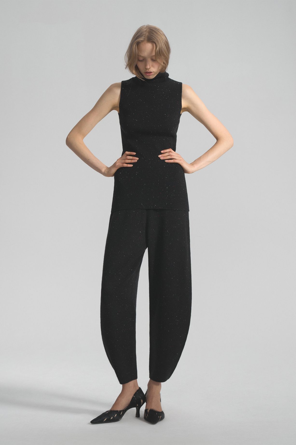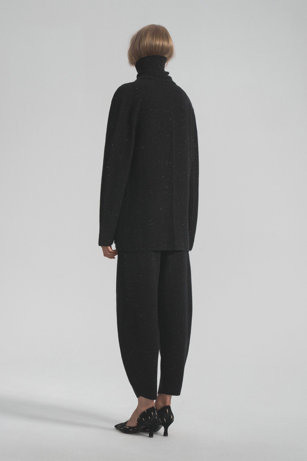 Трикотажные брюки-галифе из шерсти австралийского мериноса. Линия силуэта плавно сужается к низу, создавая естественные пропорции. Бандажный пояс обеспечивает комфортную посадку и мягкую поддержку. В пряжу вплетены крошечные шарики волокон разного оттенка — они создают выразительную фактуру и глубину цвета.Состав: 80% шерсть мериноса, 15% вискоза, 5% эластан