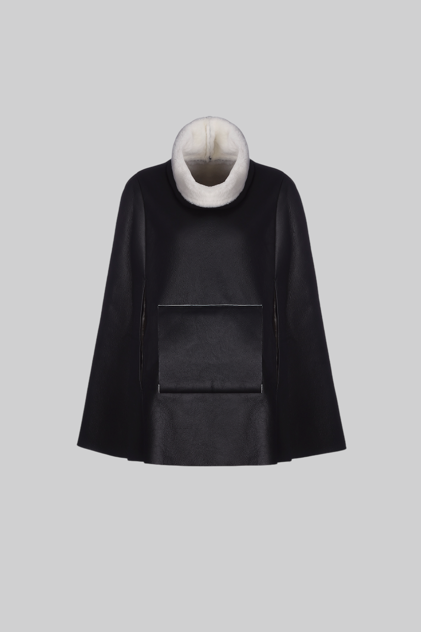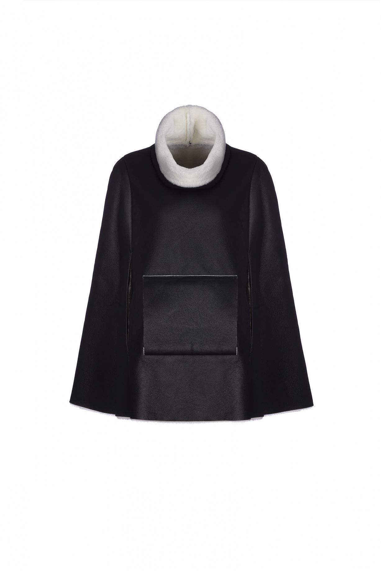 Дубленка - накидка из гладкой кожи. При создании изделия использовался натуральный мех овчины. Модель объемного расклешенного силуэта дополнена муфтой и высоким воротником.Состав: 100% натуральная овчина