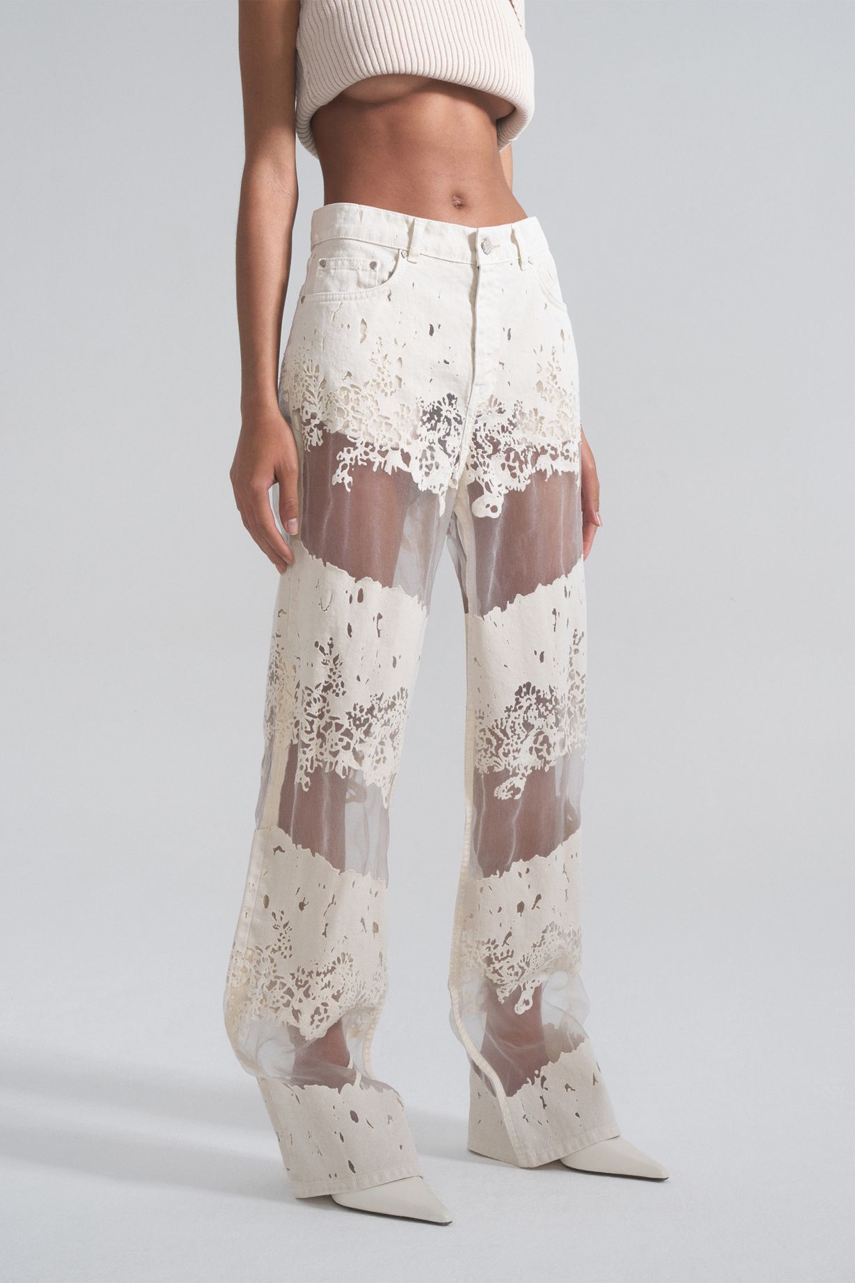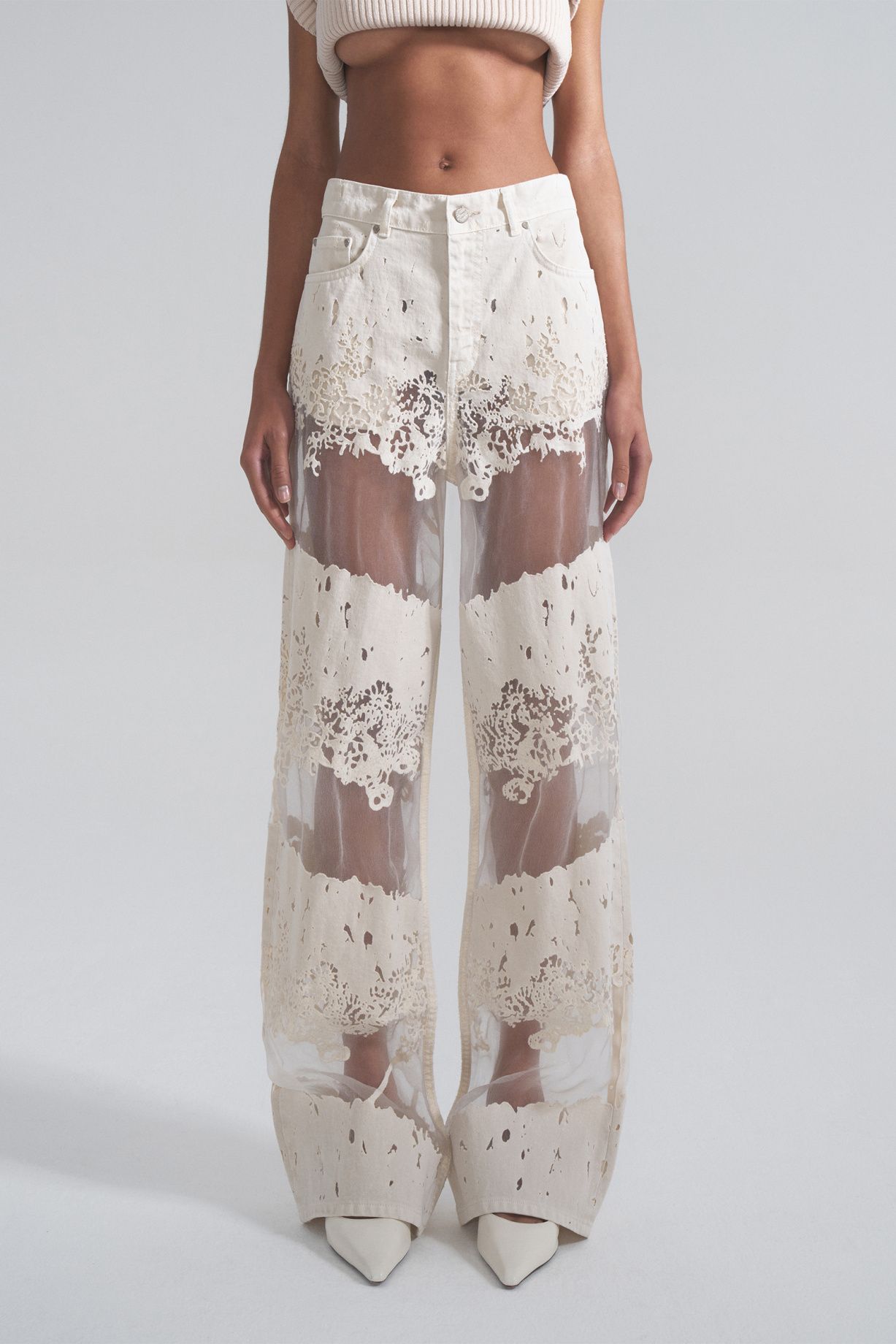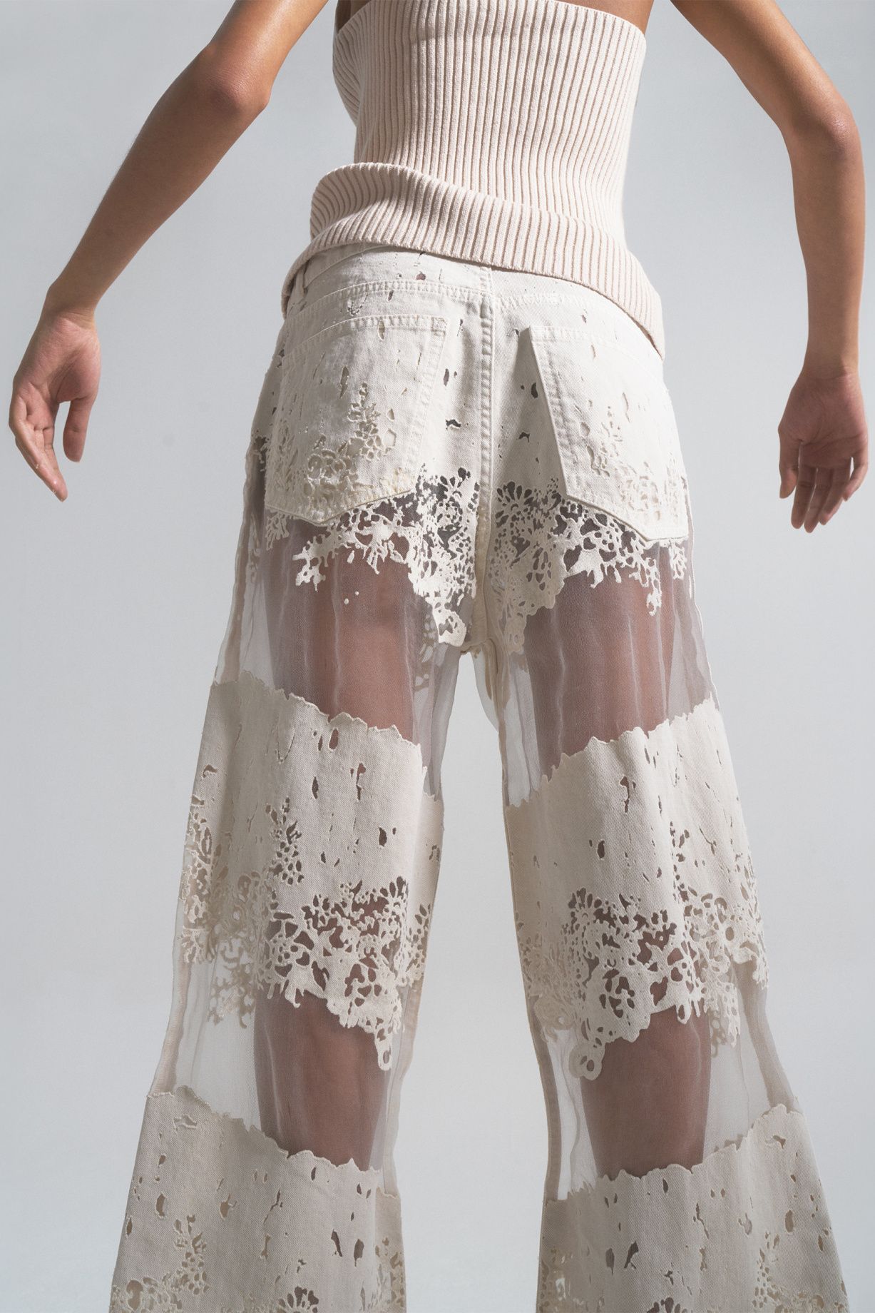 Джинсы свободного кроя, выполнены по уникальной технологии, авторский ажурный принт и прозрачная основа, имитирующая шелковую плотную органзуСостав: 90% хлопок,10% нейлон