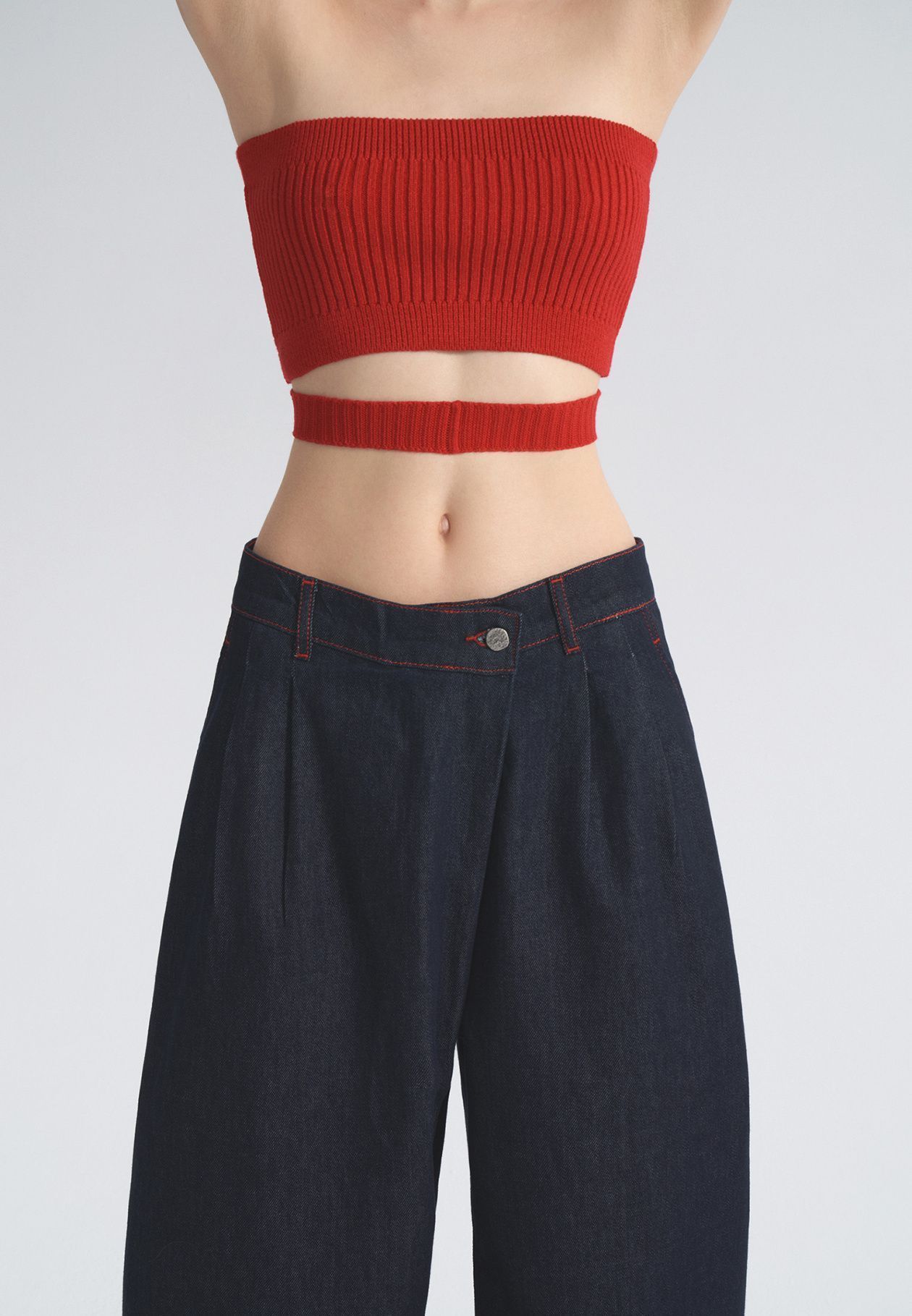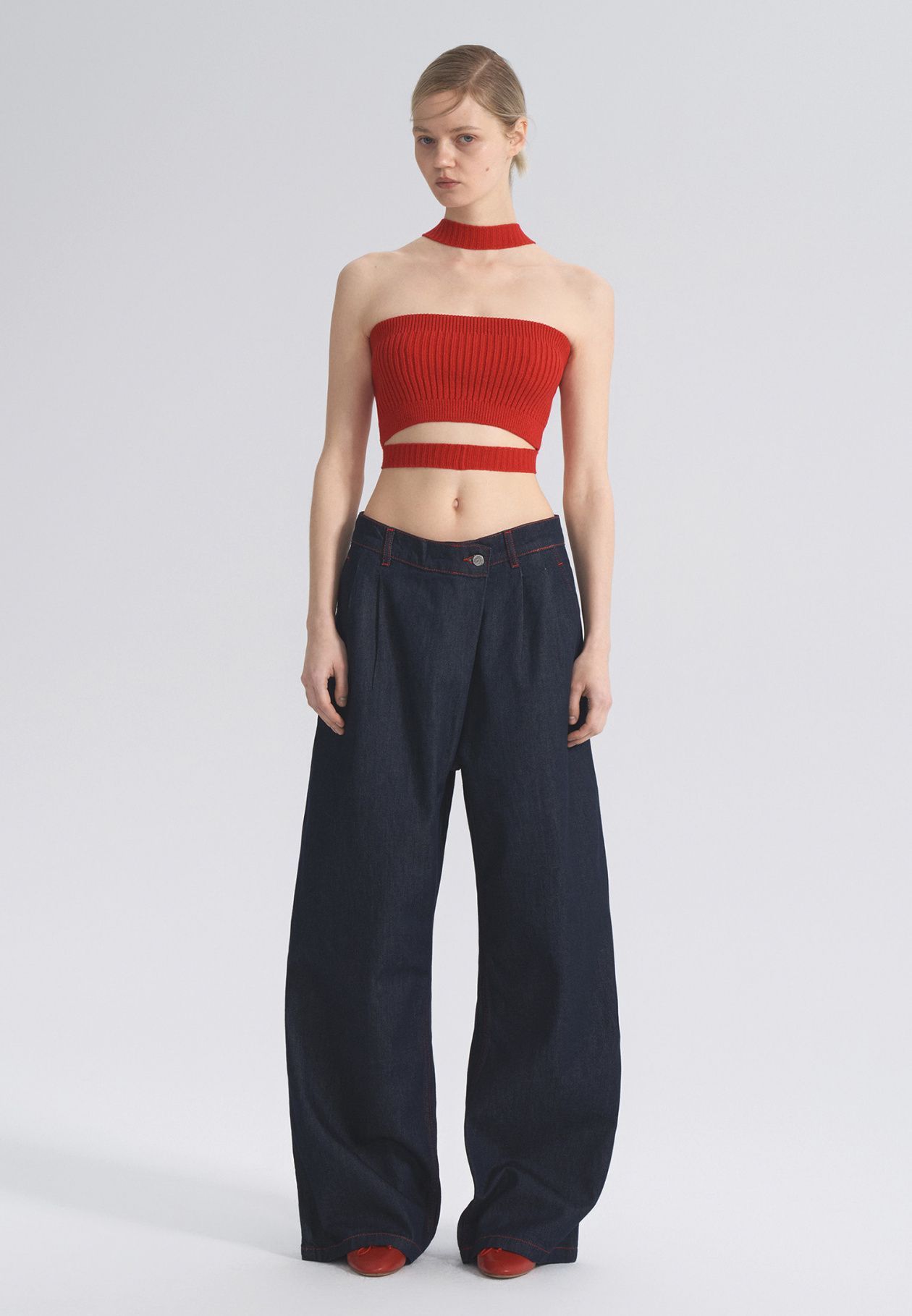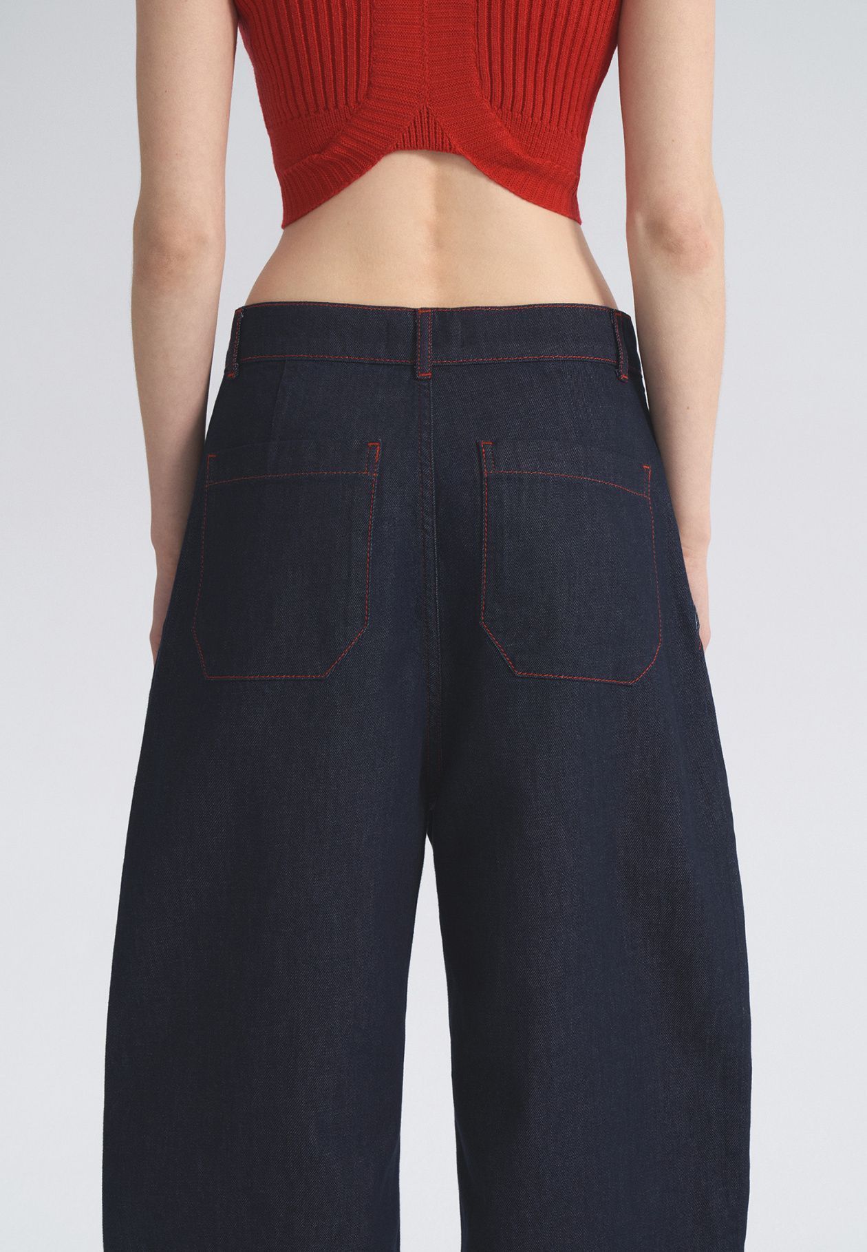 Джинсы объемного кроя, с асимметричной застежкой, складками и контрастной строчкой из плотного денима.Состав: 100% хлопок