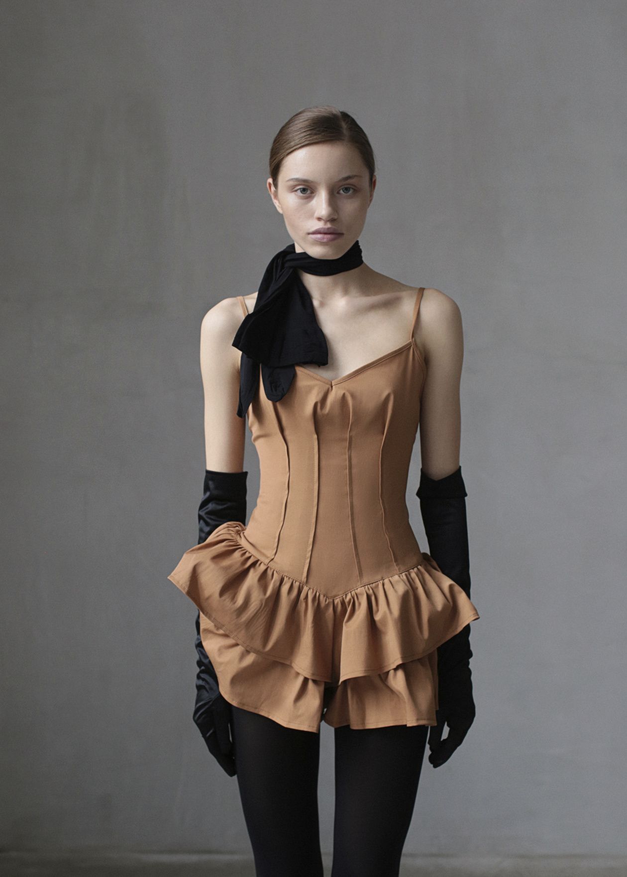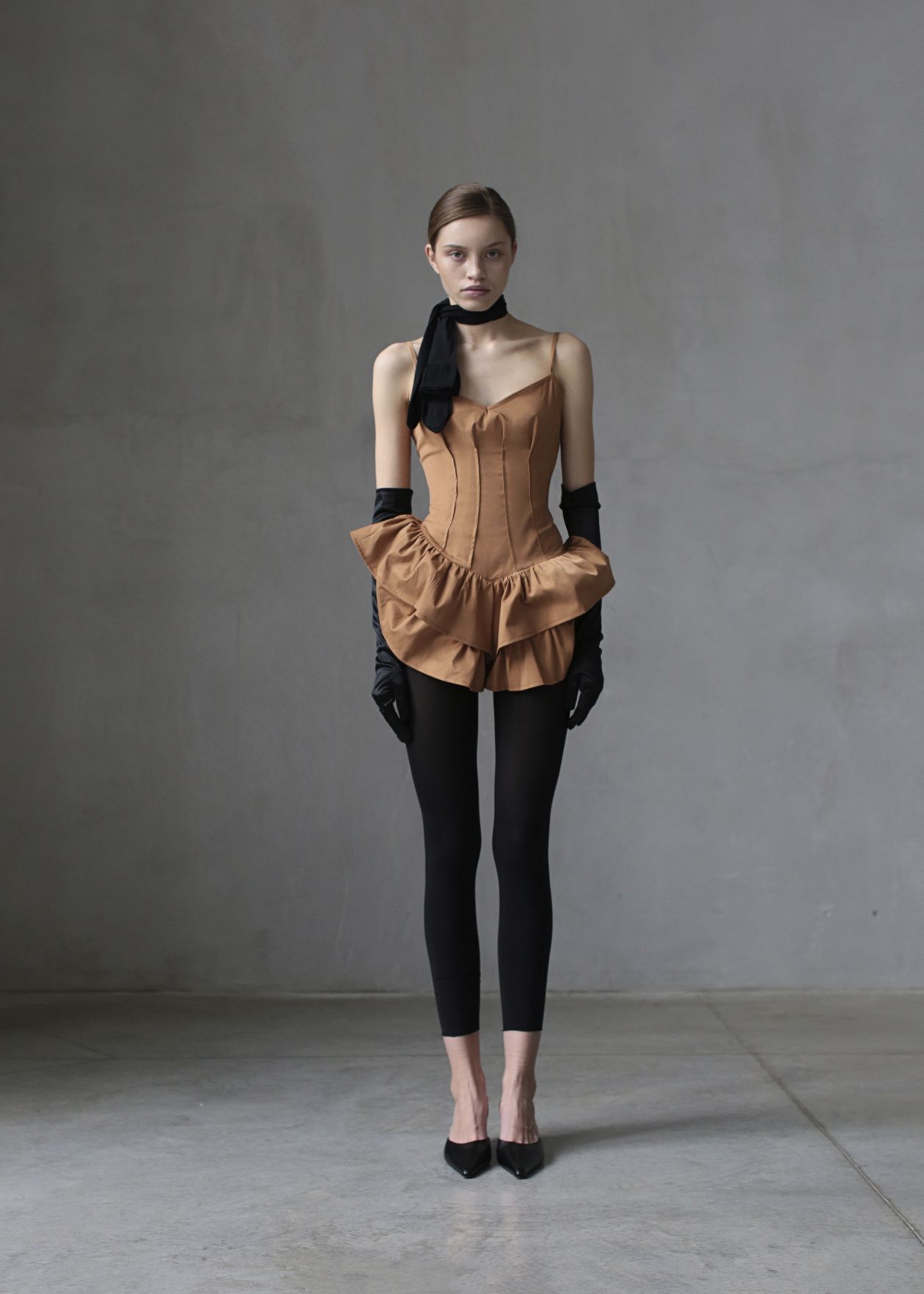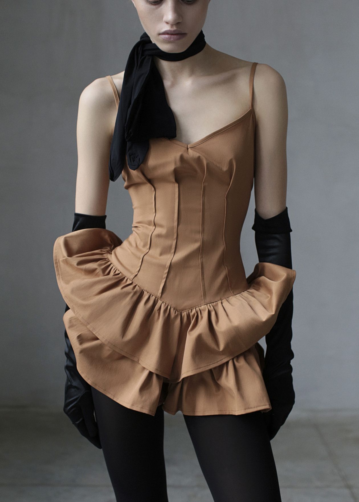 Комбинезон мини сшит, как корсет на тонких бретелях, юбка с двойными воланами.Состав: 80% вискоза, 10% хлопок, 10% эластан