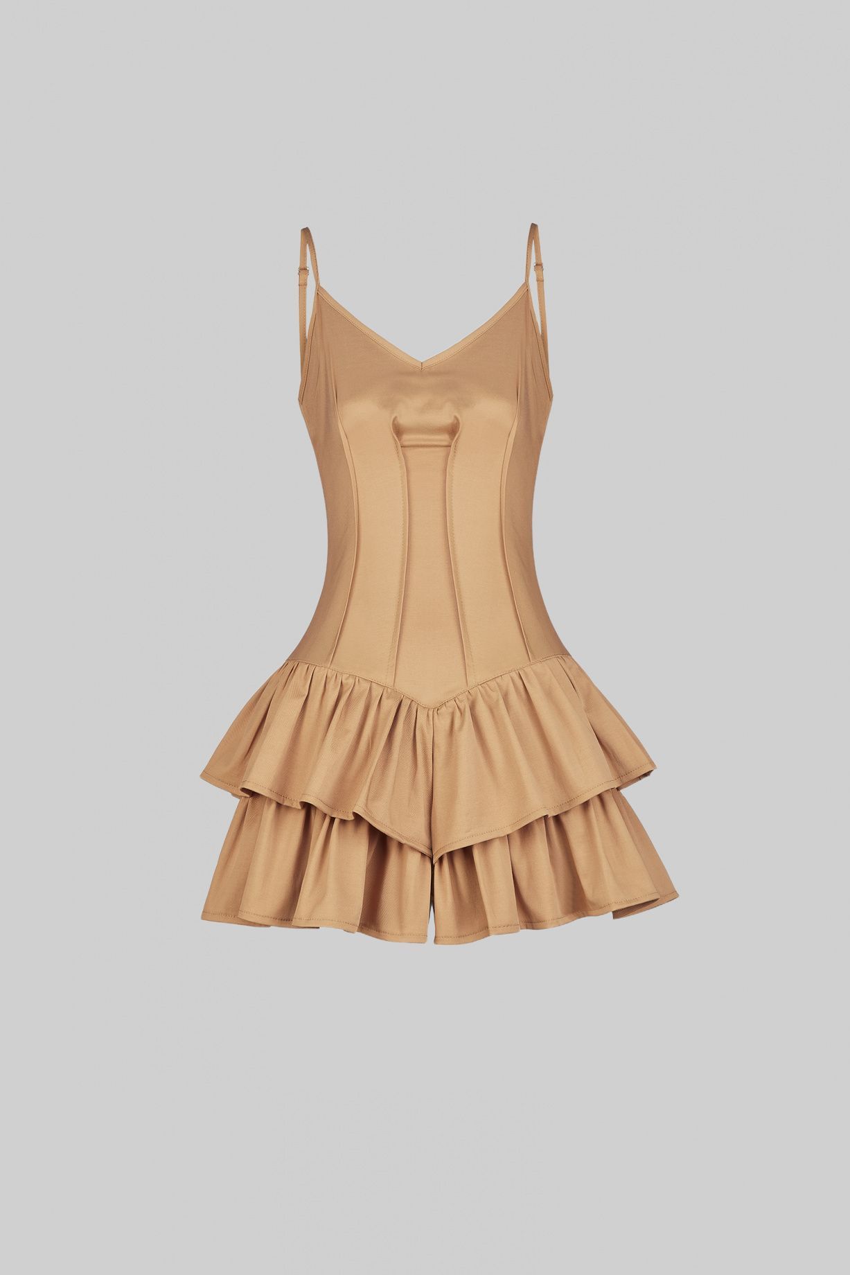 Комбинезон мини сшит, как корсет на тонких бретелях, юбка с двойными воланами.Состав: 80% вискоза, 10% хлопок, 10% эластан