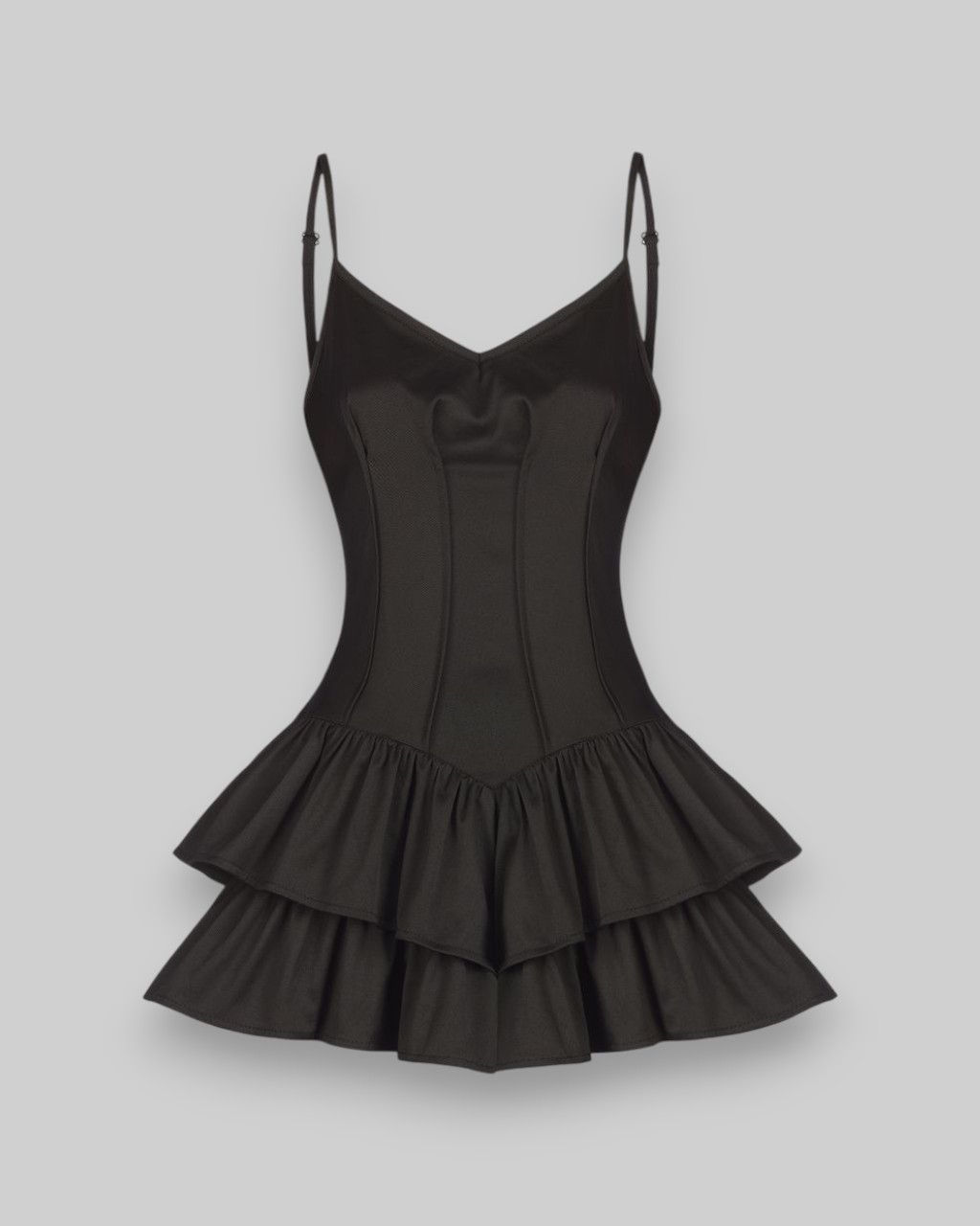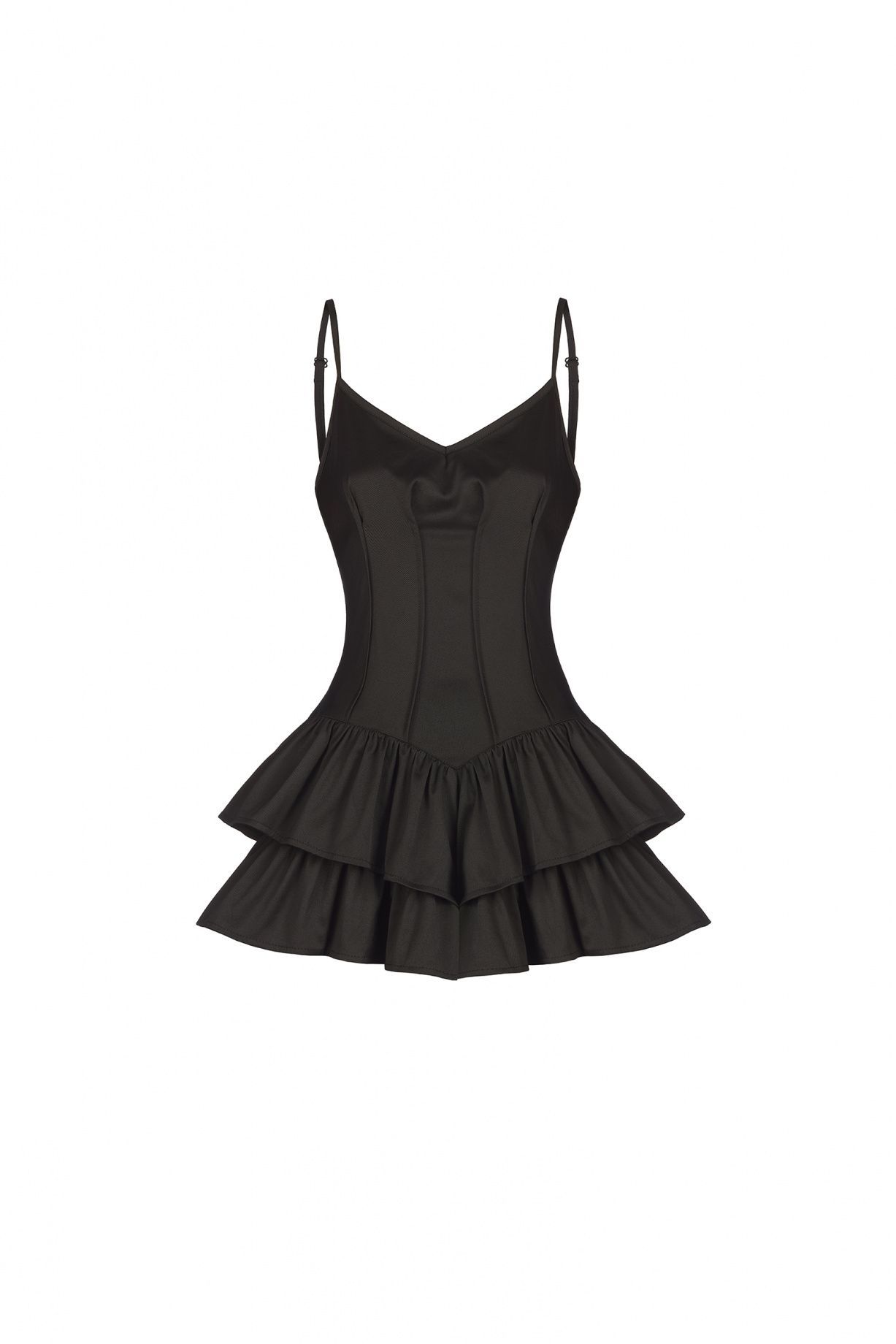 Комбинезон мини сшит, как корсет на тонких бретелях, юбка с двойными воланами.Состав: 80% вискоза, 10% хлопок, 10% эластан