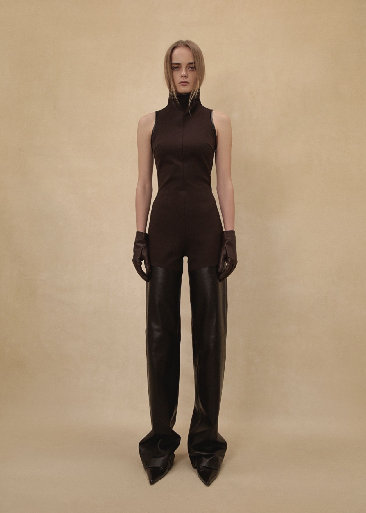 Состав: 70% вискоза, 20% эластан, 10% хлопок. Брюки - 100% кожа