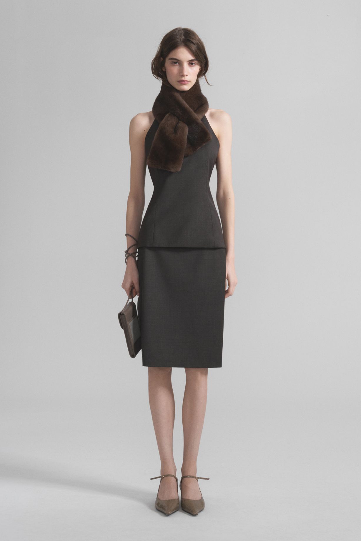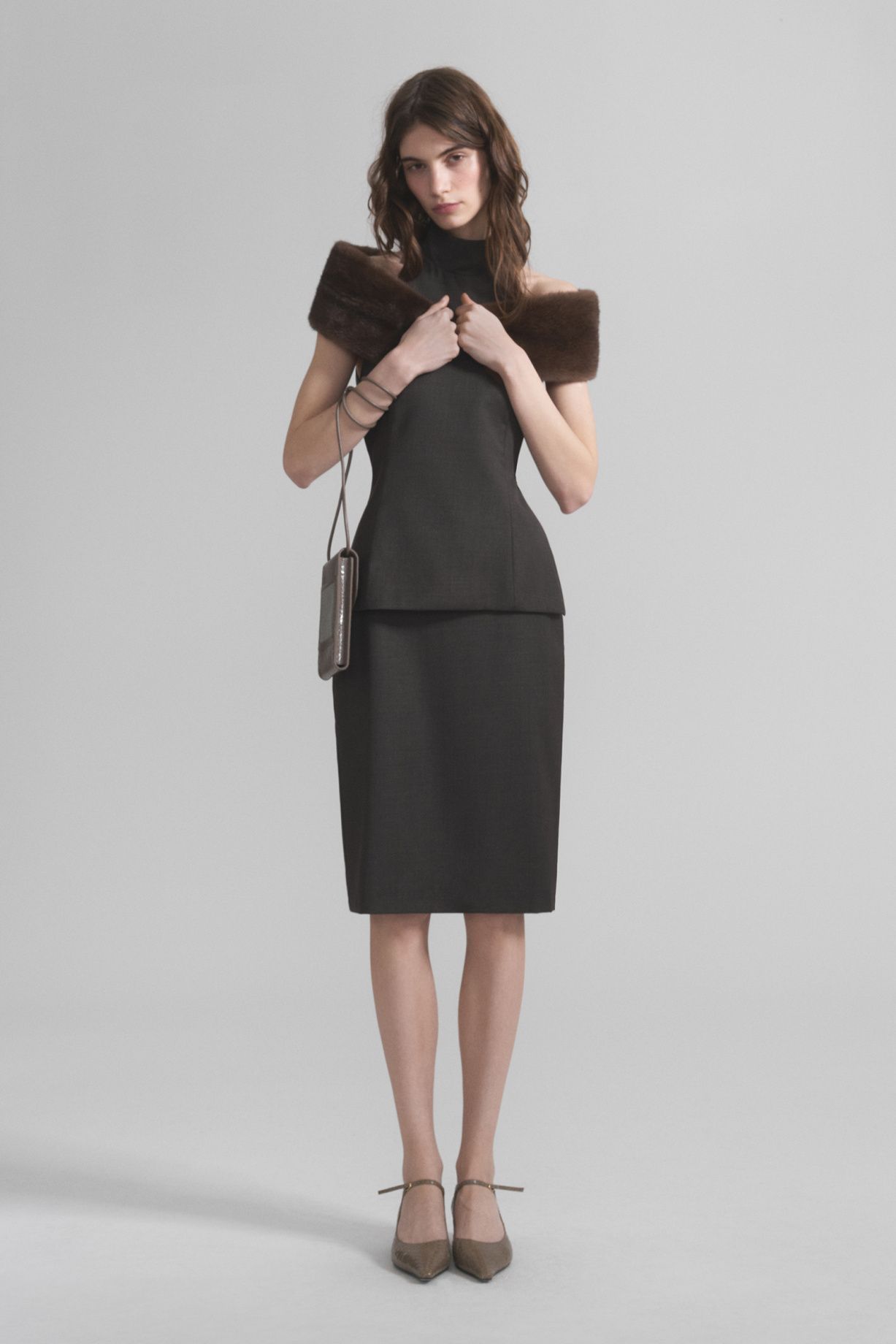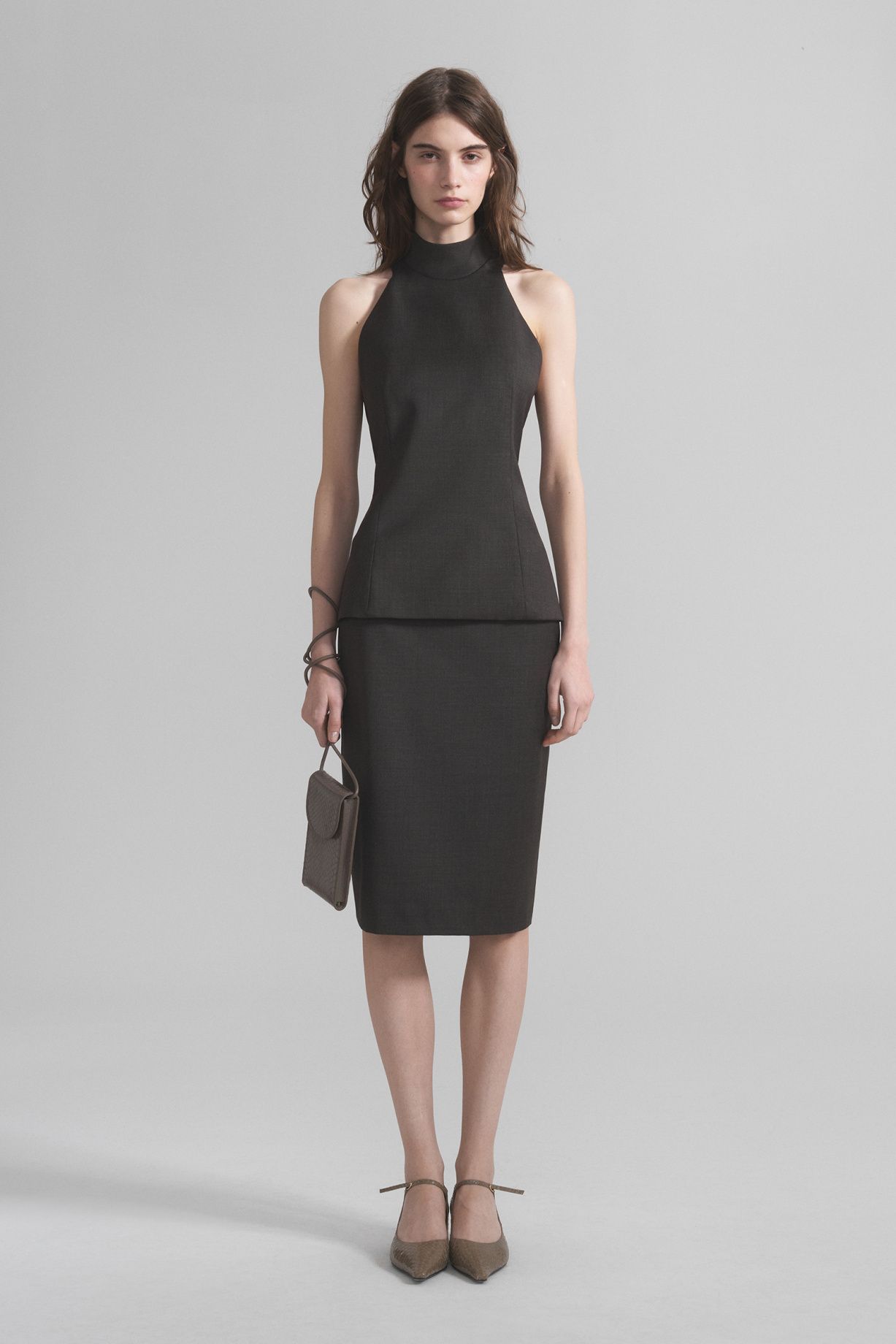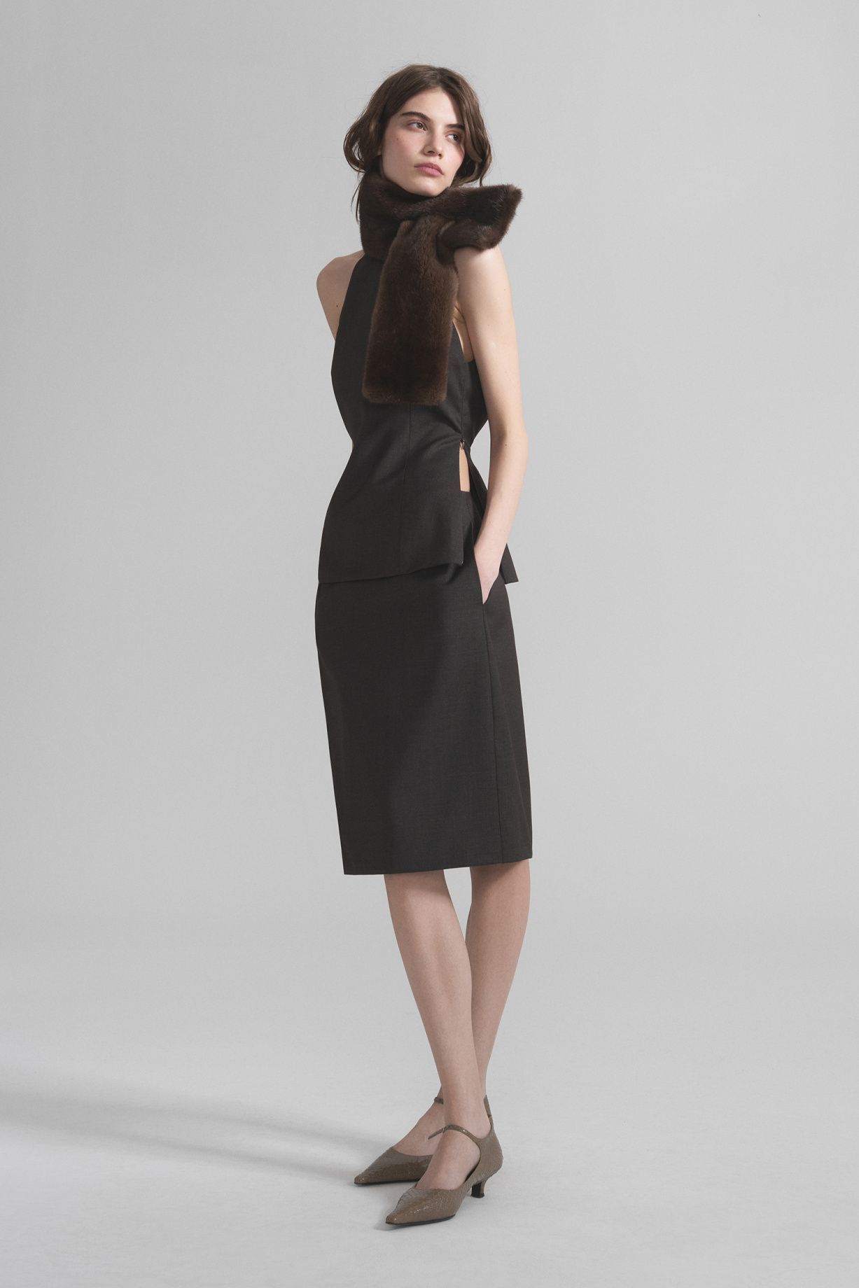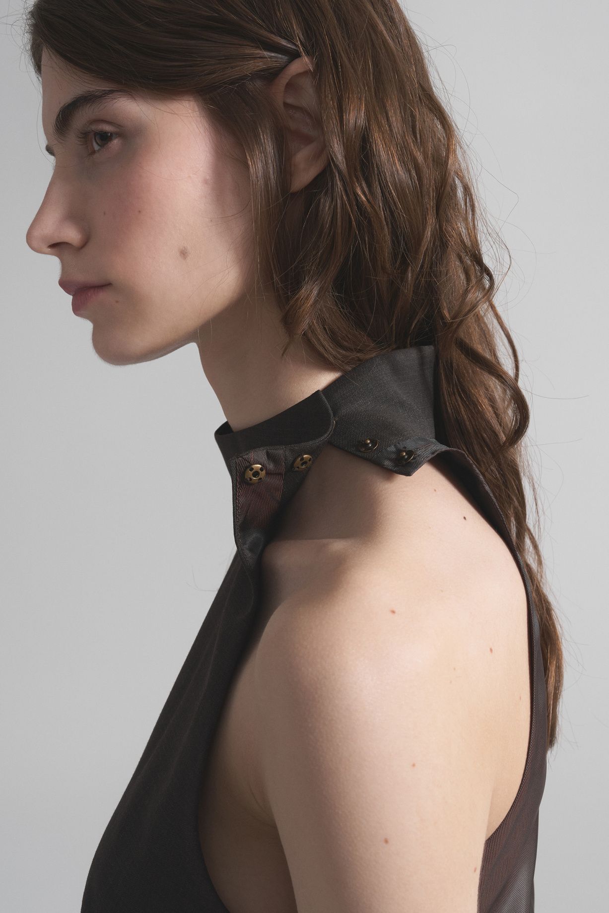 Костюмный топ-жилет из тончайшей шерстяной ткани. Плечевой крой выполнен с диагональной линией, которая мягко соединяет горловину и боковой шов, оставляя плечи открытыми. Спинка из гладкого шелка. В левом боковом шве спрятана застежка на молнии, а посадка по талии регулируется за счёт узкой ленты на спинке. Воротник-стойка с застежкой на трех кнопках по левому плечу.Состав: 80% натуральная шерсть, 20% вискоза