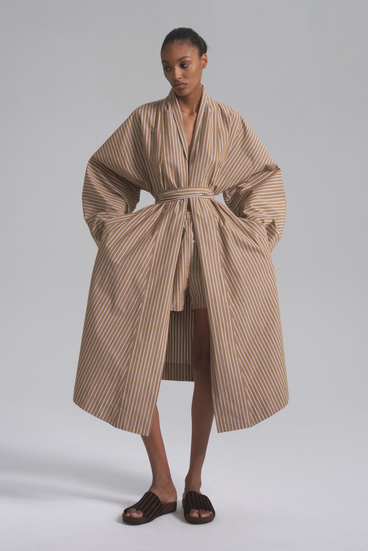 Летний костюм-кимоно свободного кроя с шортами. Модель выполнена из натурального дышащего хлопка, изделие имеет свободный удлинённый силуэт с широкими рукавами. Дополнено широким поясом, по бокам расположены удобные карманы. По низу изделия и рукавов проходит декоративная отделочная строчка, а все внутренние швы аккуратно обработаны для комфорта при носке. В комплекте идут хлопковые шорты из той же ткани, что создаст гармоничный образ.