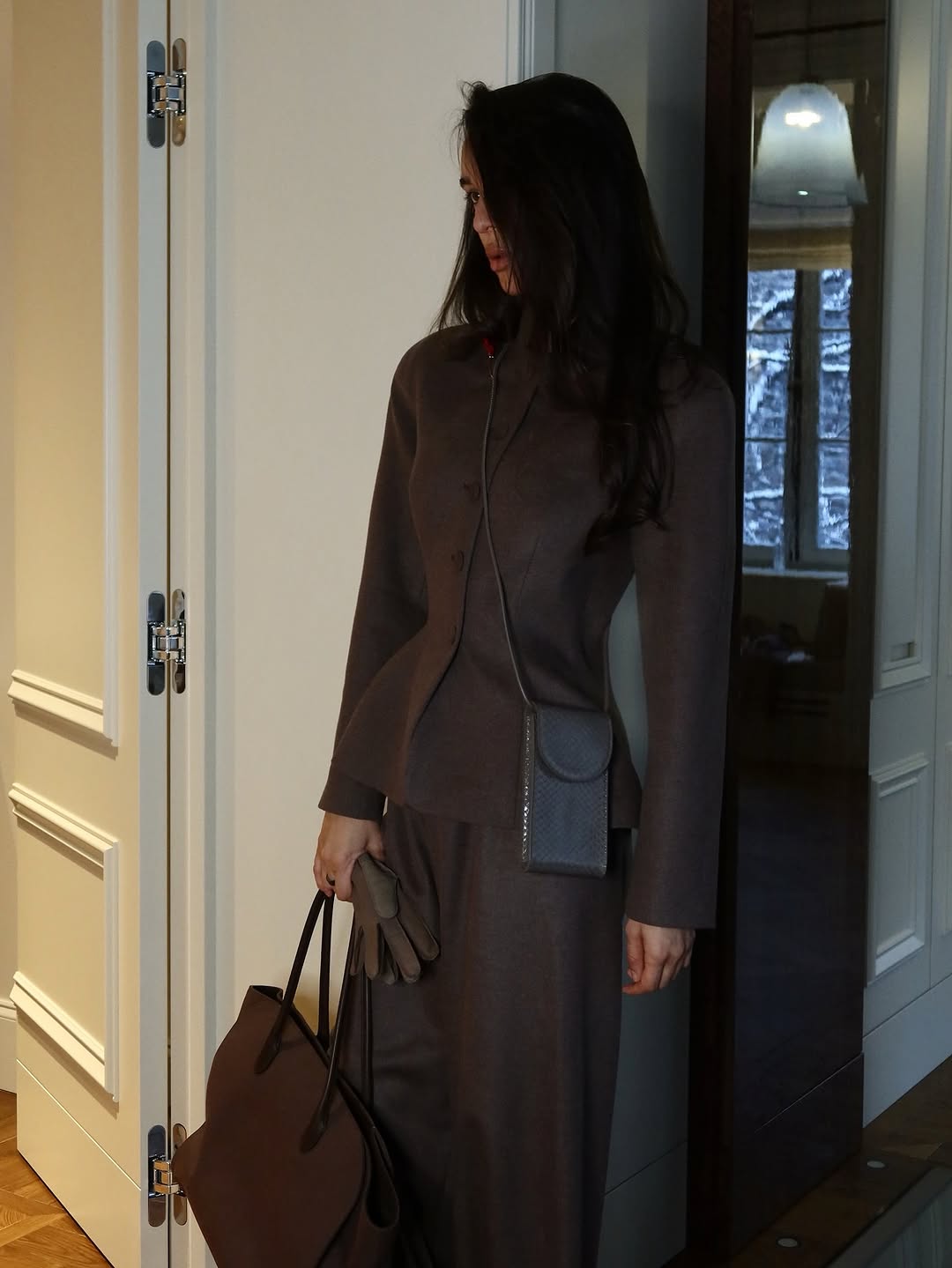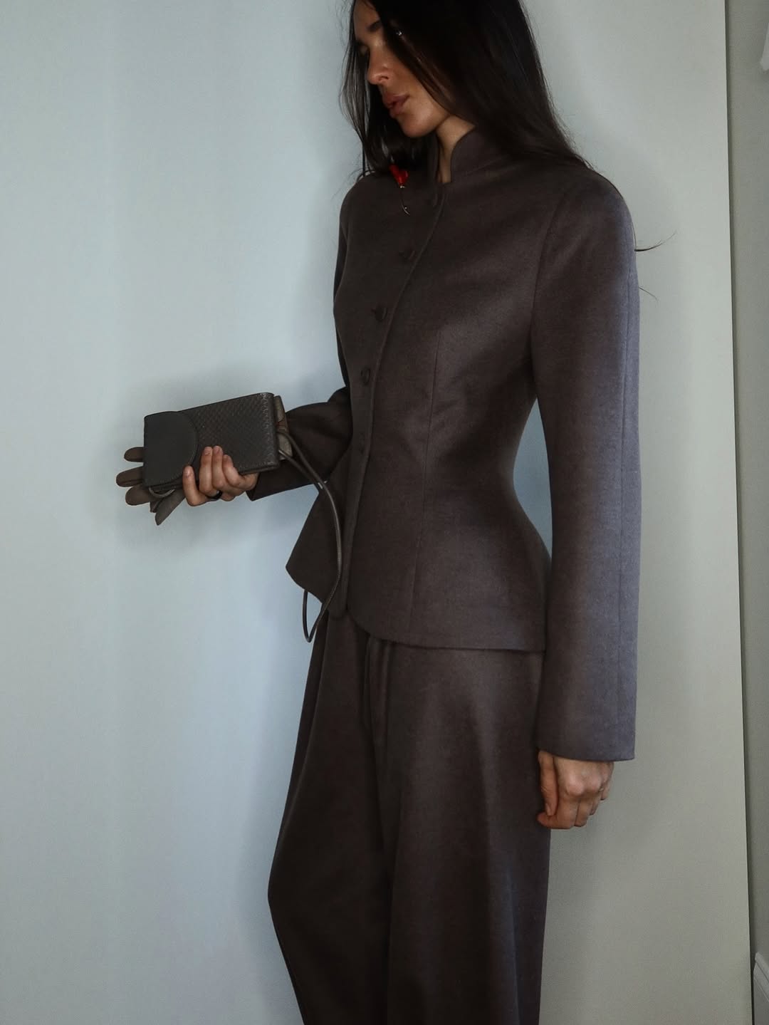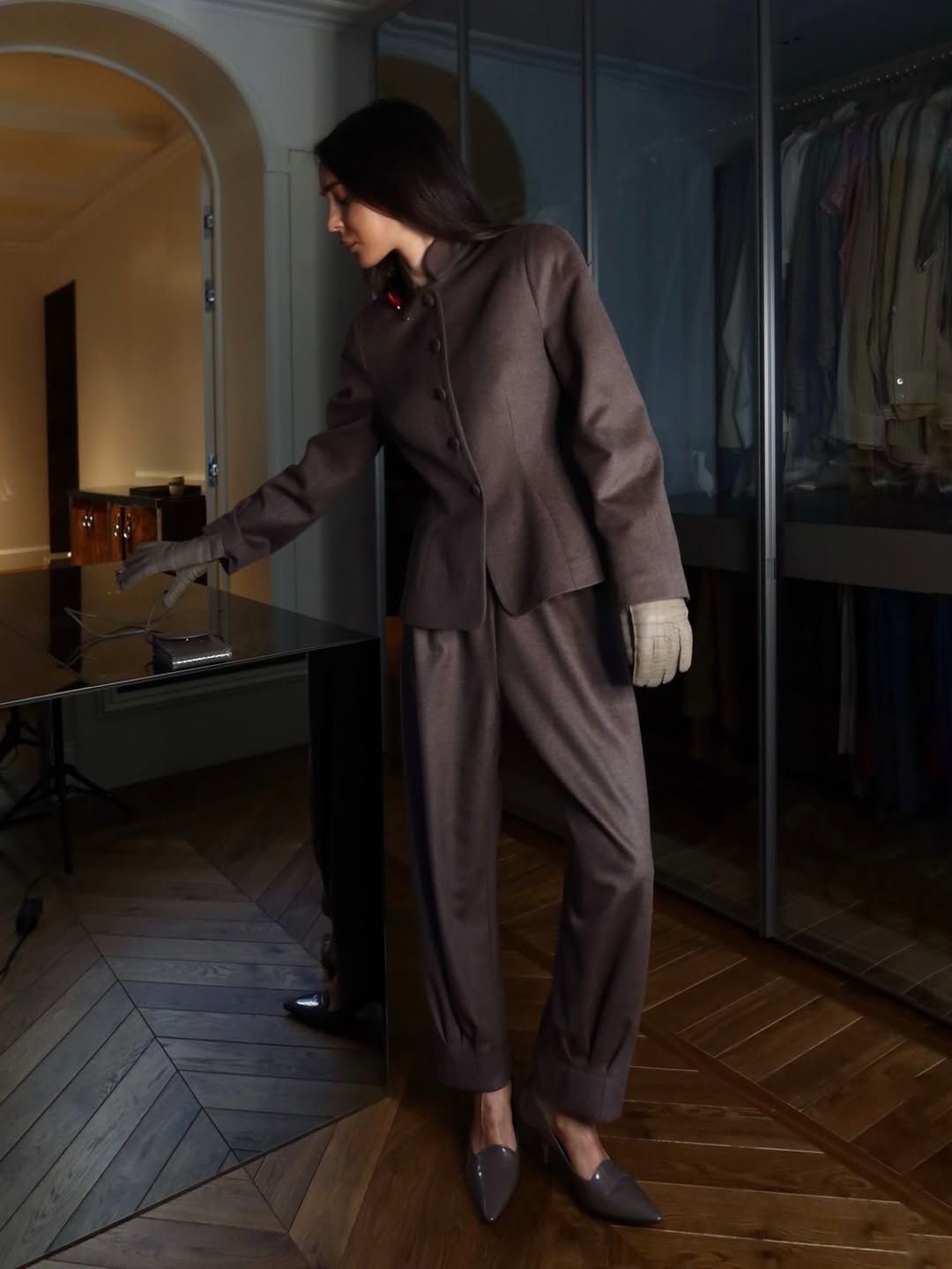 Костюм из премиального кашемира с добавлением натурального шелка. Кашемир естественным образом регулирует тепло и прекрасно держит форму, а шелк придаёт ткани нежную шелковистость и предотвращает пиллингуемость. Приталенный жакет с воротником стойкой и обтянутыми пуговицами ручной работы. Силуэт костюма подчеркивает изгиб талии, зрительно ее сужая. Брюки на мягкой эластичной резинке можно носить как на талии, так и на бедрах. По передней части брюк проходят декоративные складки. Костюм создан для максимальной универсальности: его элементы гармонично сочетаются как между собой, так и с другими предметами гардероба. Жакет легко надеть с джинсами, юбкой или брюками, а брюки - с блузой, водолазкой или даже лёгким топом, сохраняя единую линию стиля и изысканности в любое время года.