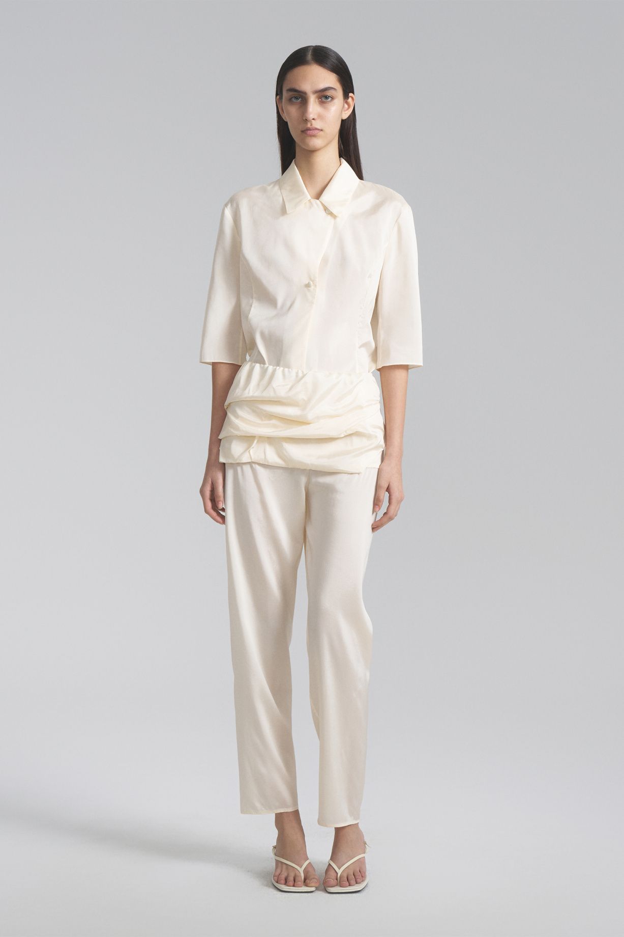 Приталенная блуза-жакет с укороченным рукавом. Сложнокройные легкие брюки, с декоративной имитацией юбки-мини, оформленной ассиметричными складками.Состав: 100% шелк