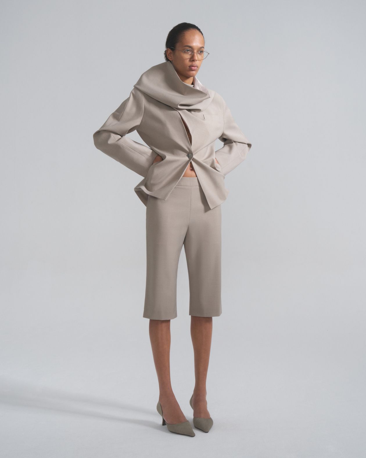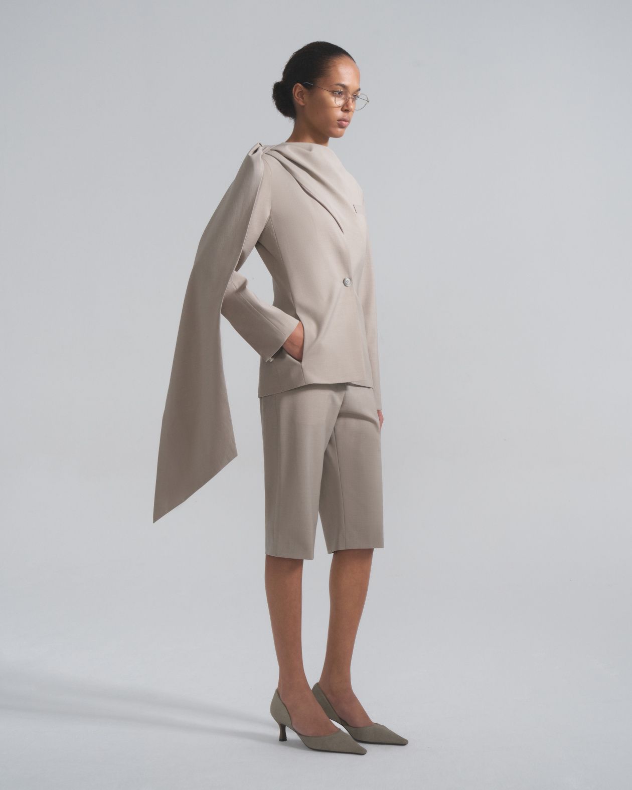 Костюм из тонкой премиальной итальянской шерсти на шелковом подкладе, пиджак с цельнокроенным шарфом-воротником и карманами в рельефном шве, бриджи прямого кроя с карманами.Состав: 55% шерсть, 45% вискоза