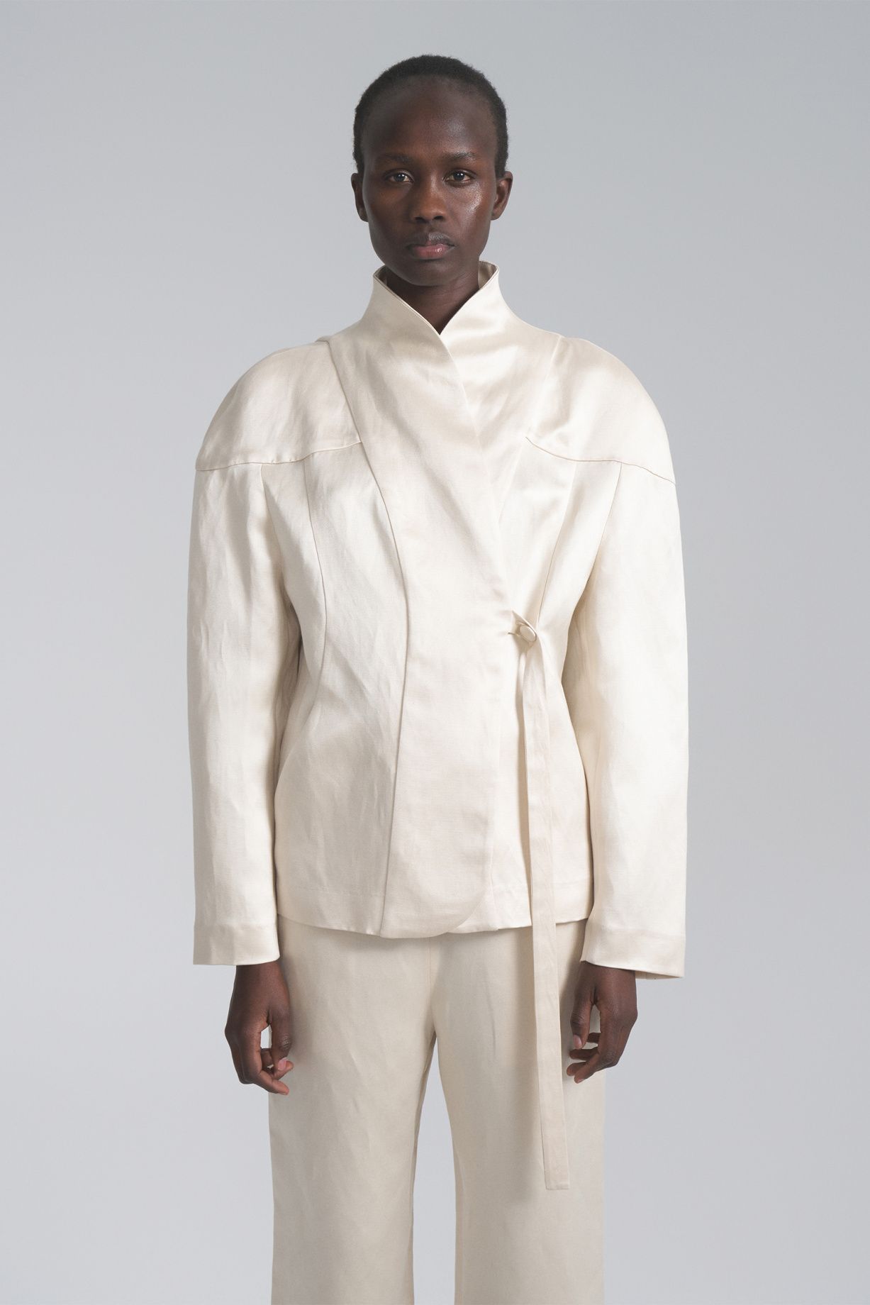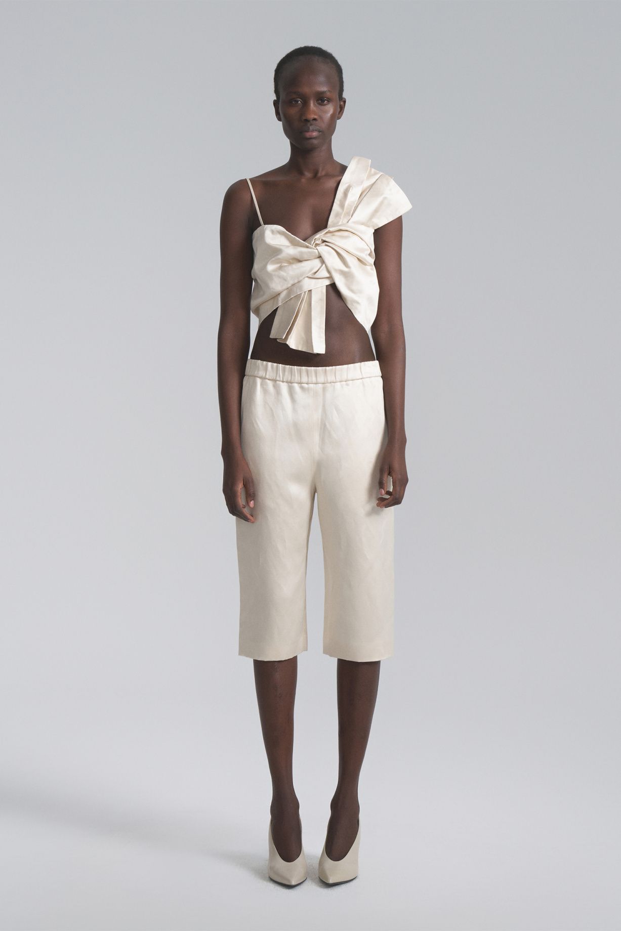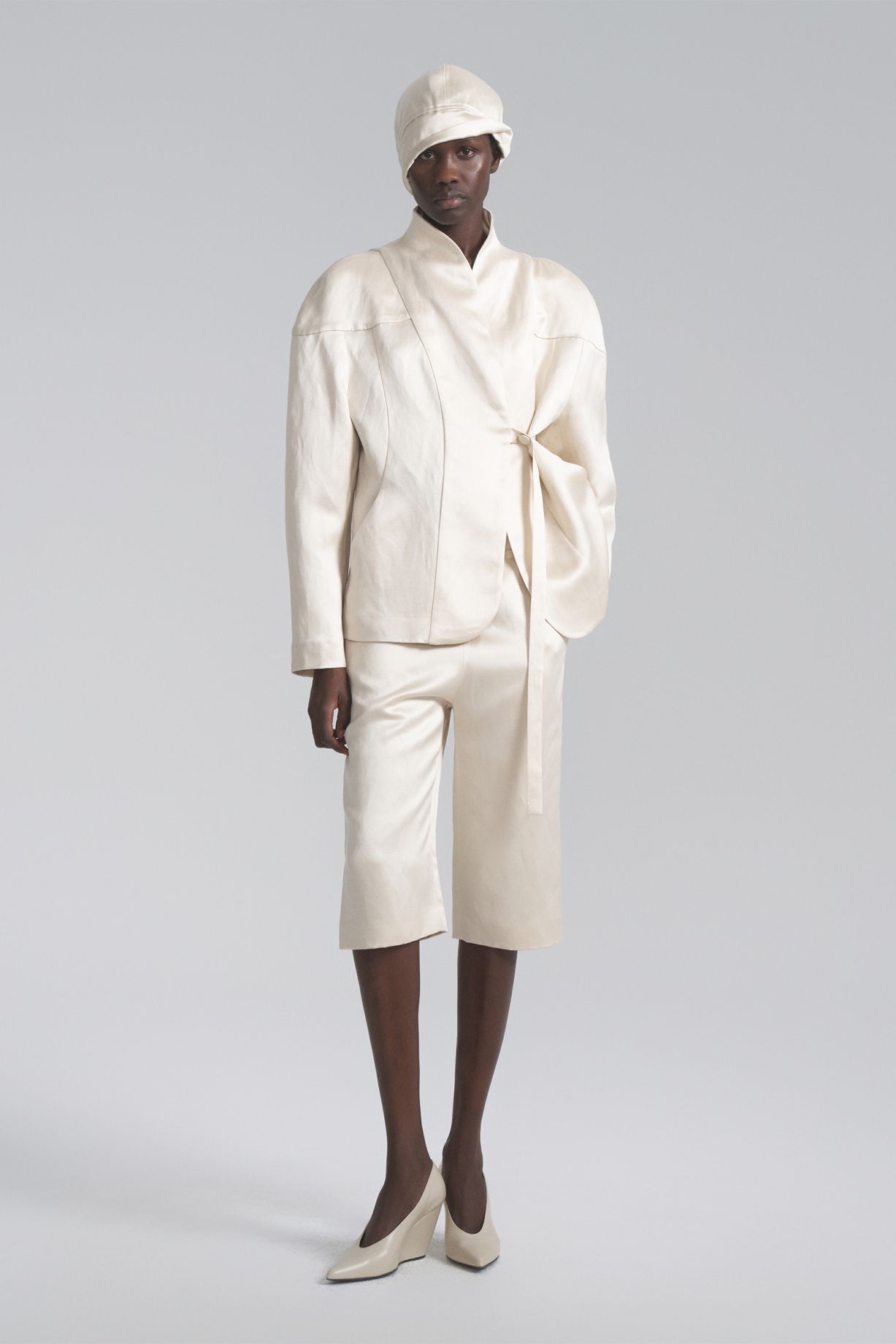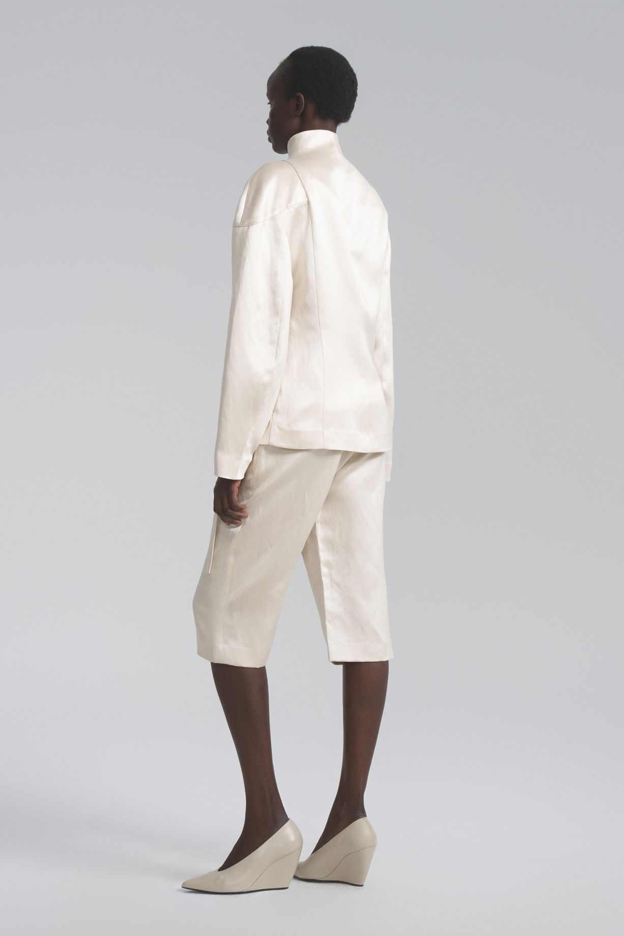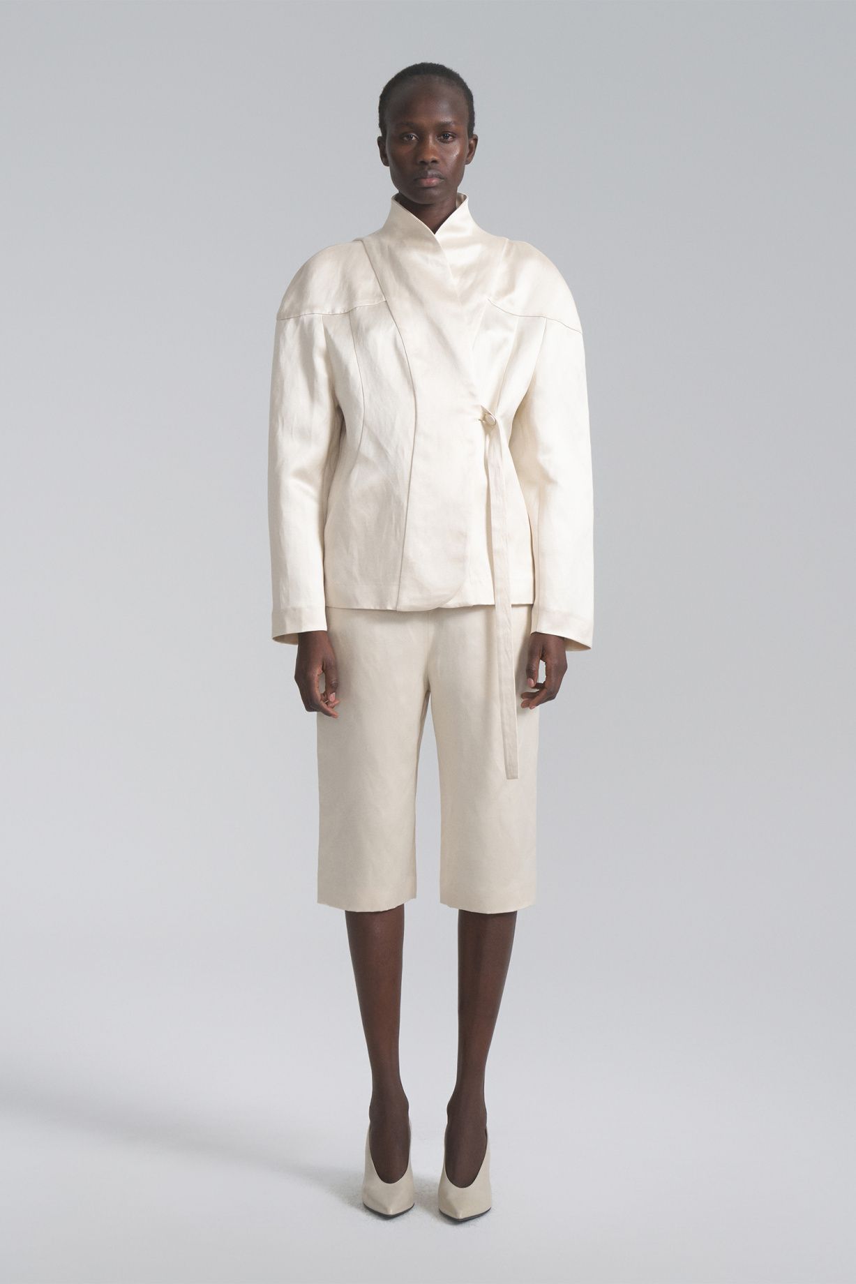 Жакет свободного кроя из льна и шелка на двух пуговицах с поясом с цельнокроеным воротником стойкой, дополненный рельефными складками на спине. Жакет возможно приталить за счет пуговиц и пояса. Бермуды прямого кроя на резинке с карманами внутри шва, длиной ниже колена.Состав: 78% эвкалипт, 12% дикий лен, 10% шелк