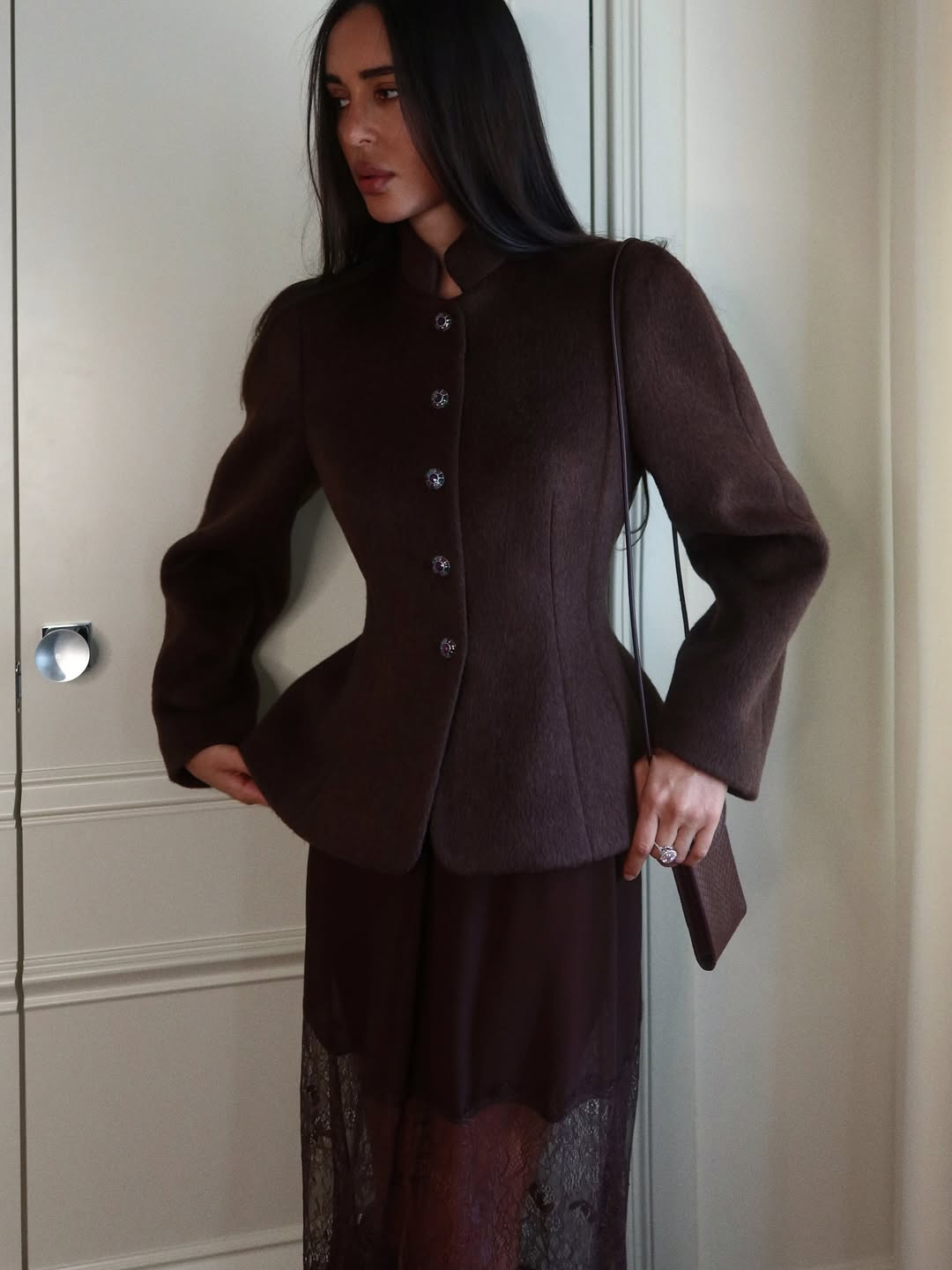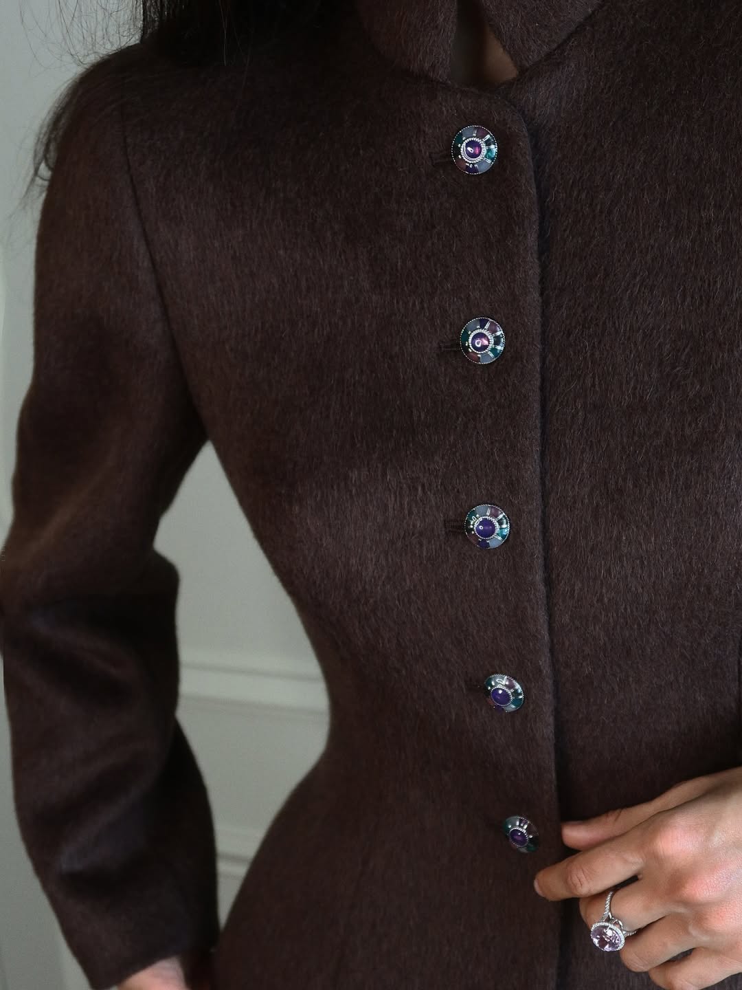 Утепленный жакет с воротником-стойкой и винтажными пуговицами ручной работы. Главная особенность изделия в том, что и с лицевой и с нательной стороны два слоя ткани - шерсть и кашемир, благодаря этому жакет можно использовать в качестве альтернативы верхней одежды в межсезонье. При этом останется актуальным и теплой весной и летом, если надеть его с легкой майкой или топом. Приталенный крой подчеркивает изгиб талии и визуально стройнит. Витражные пуговицы становятся ювелирным акцентом образа и придают жакету винтажный шарм.