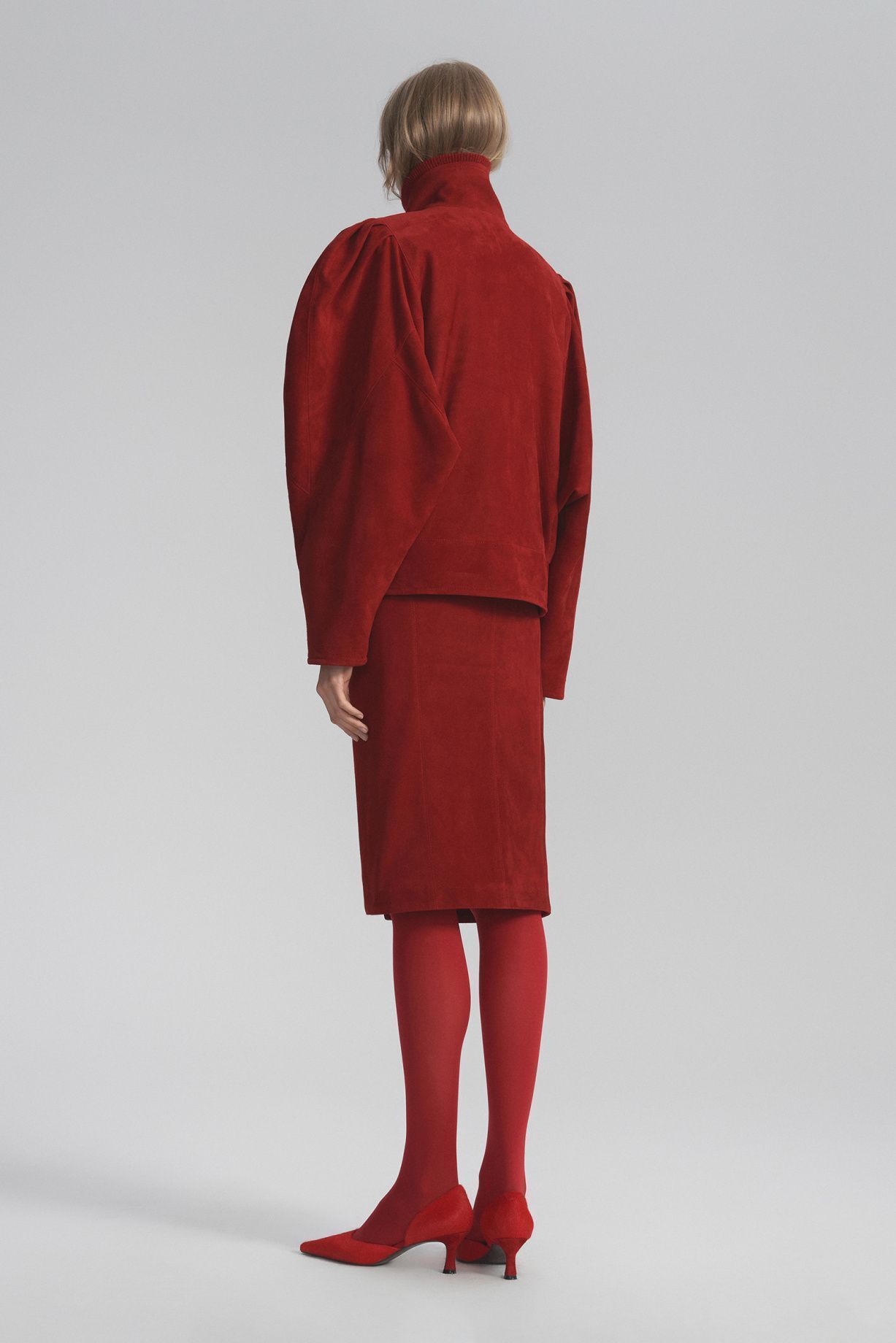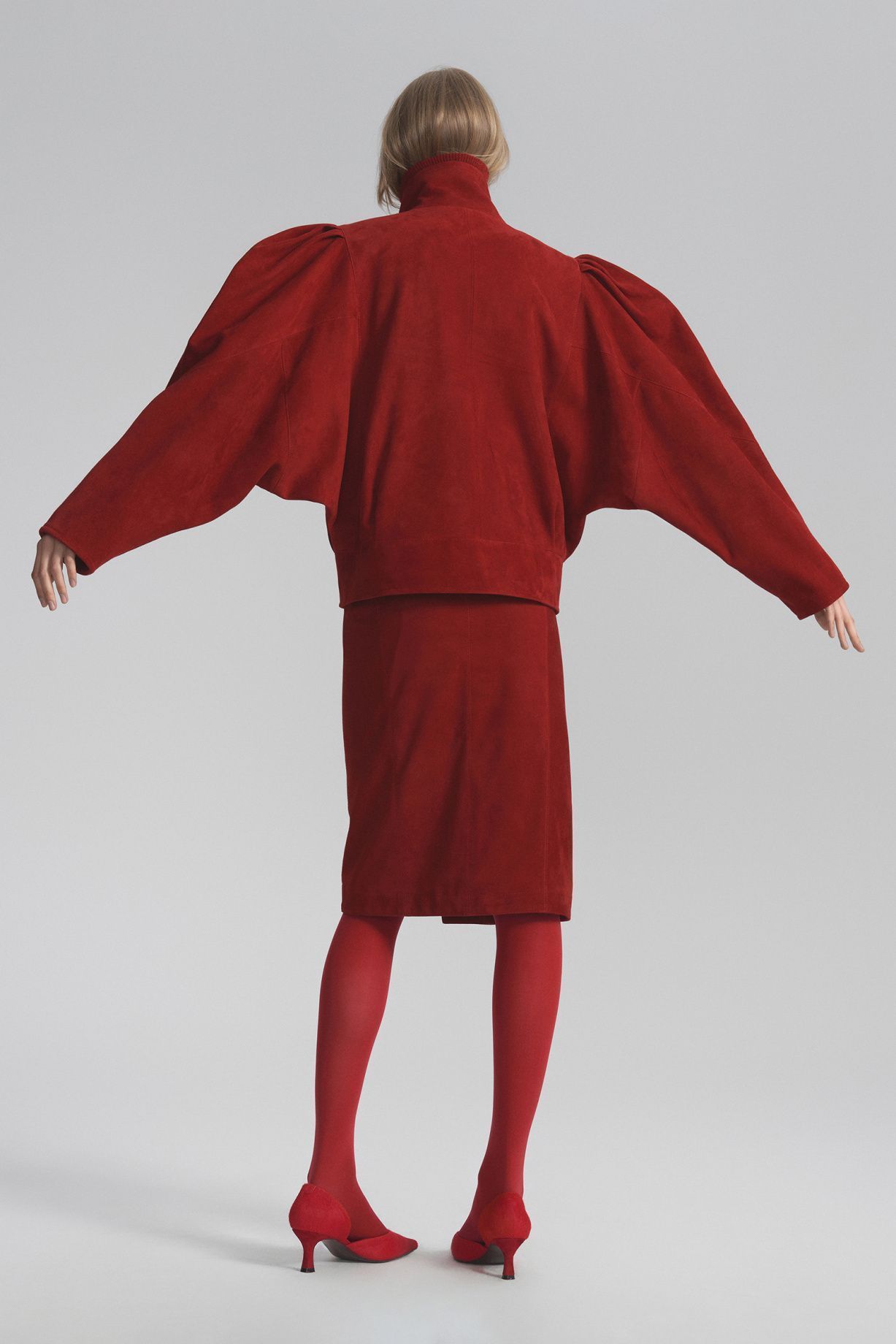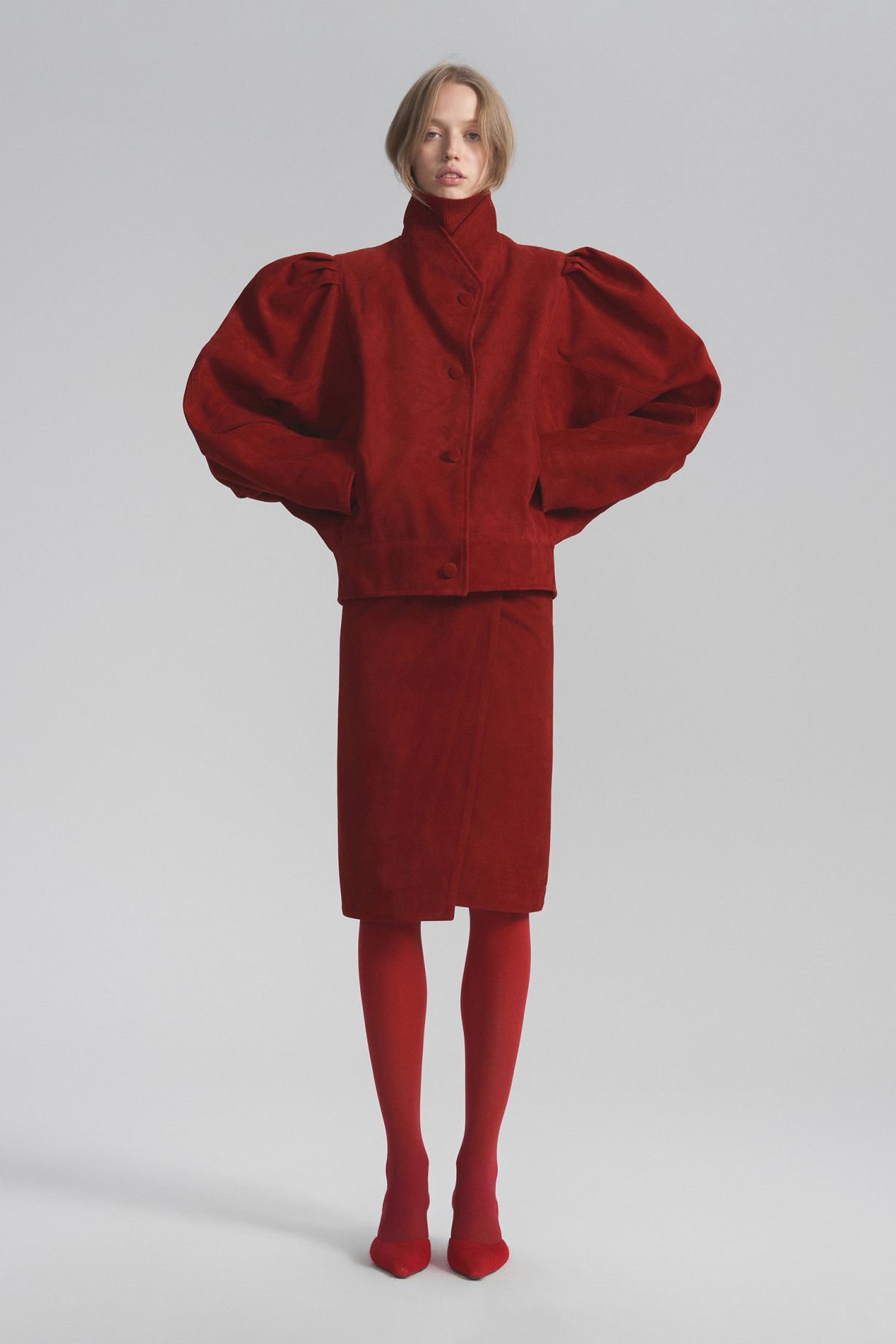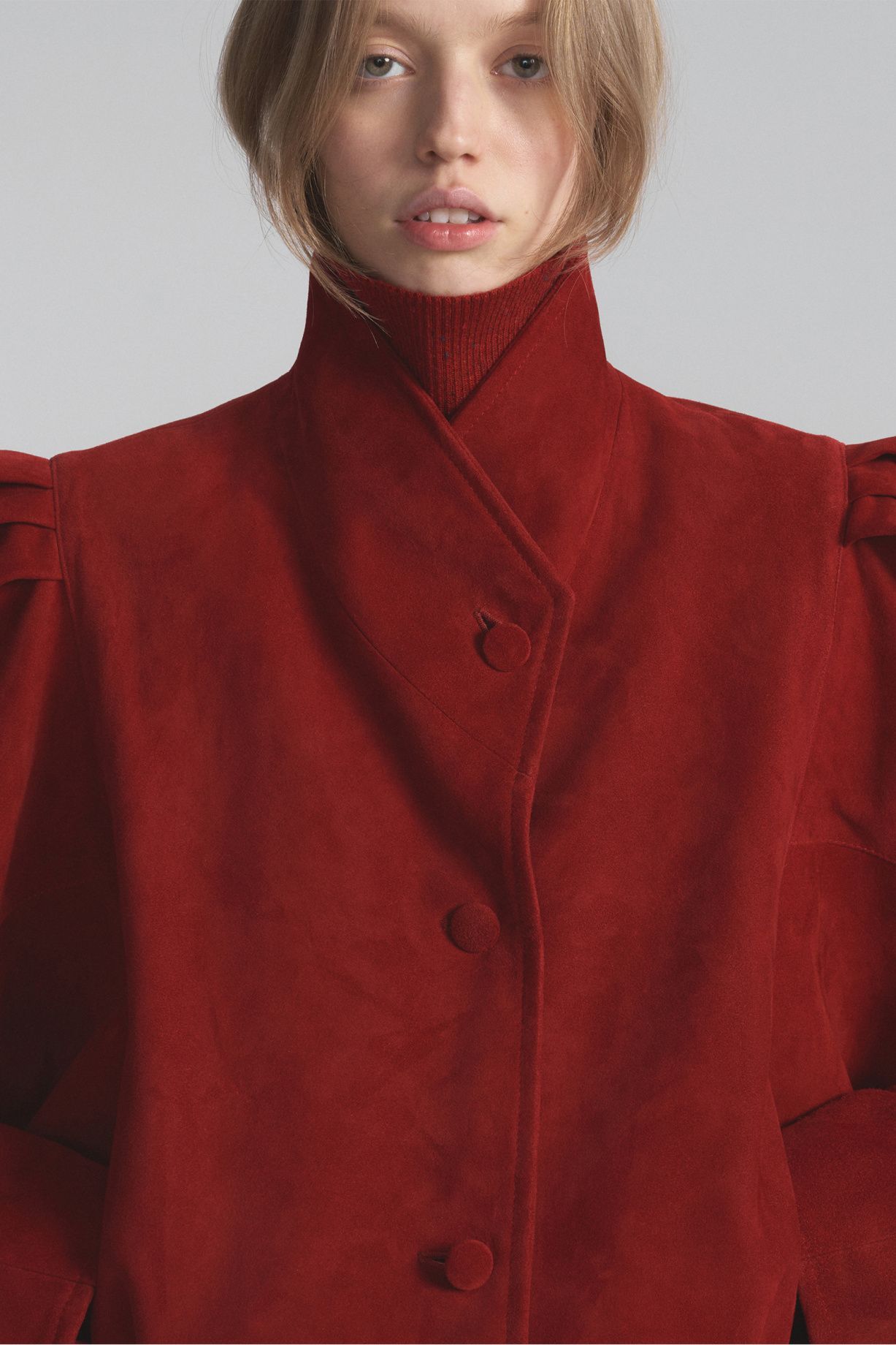 Замшевый жакет в стиле 80-х ручной работы классического красного цвета, с высоким воротом, объемными рукавами с защипами и обтянутыми замшей пуговицами — уникальное изделие ручной работы из премиального материала.Состав: 100% натуральная кожа, подклад 100% вискоза