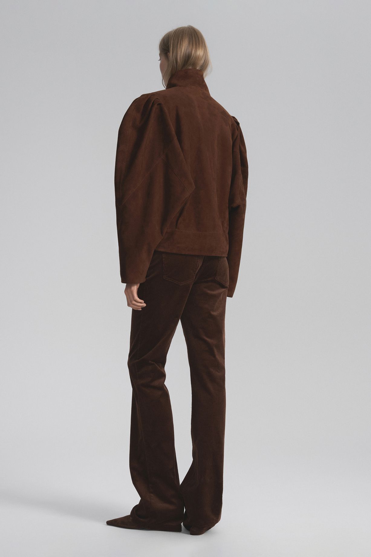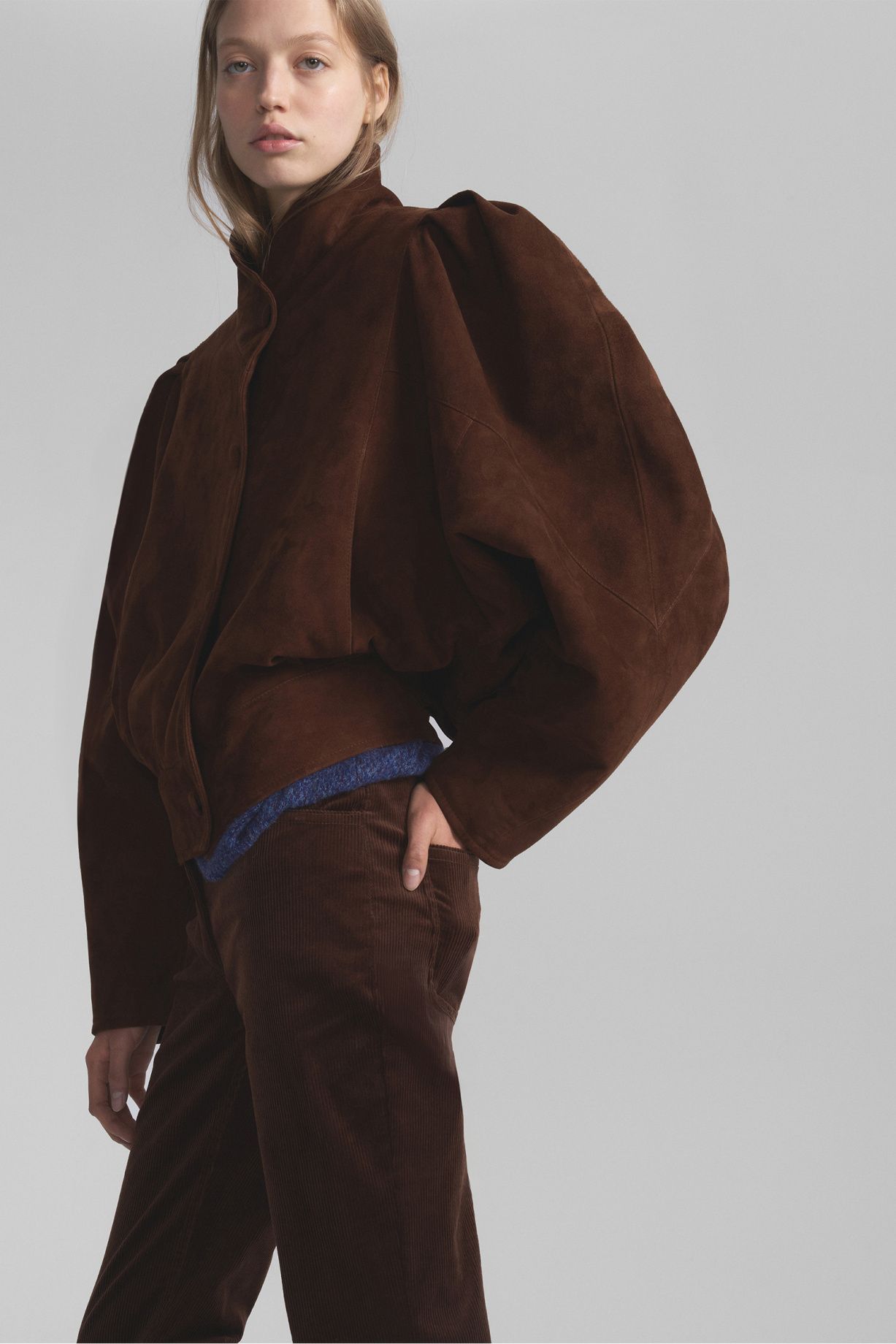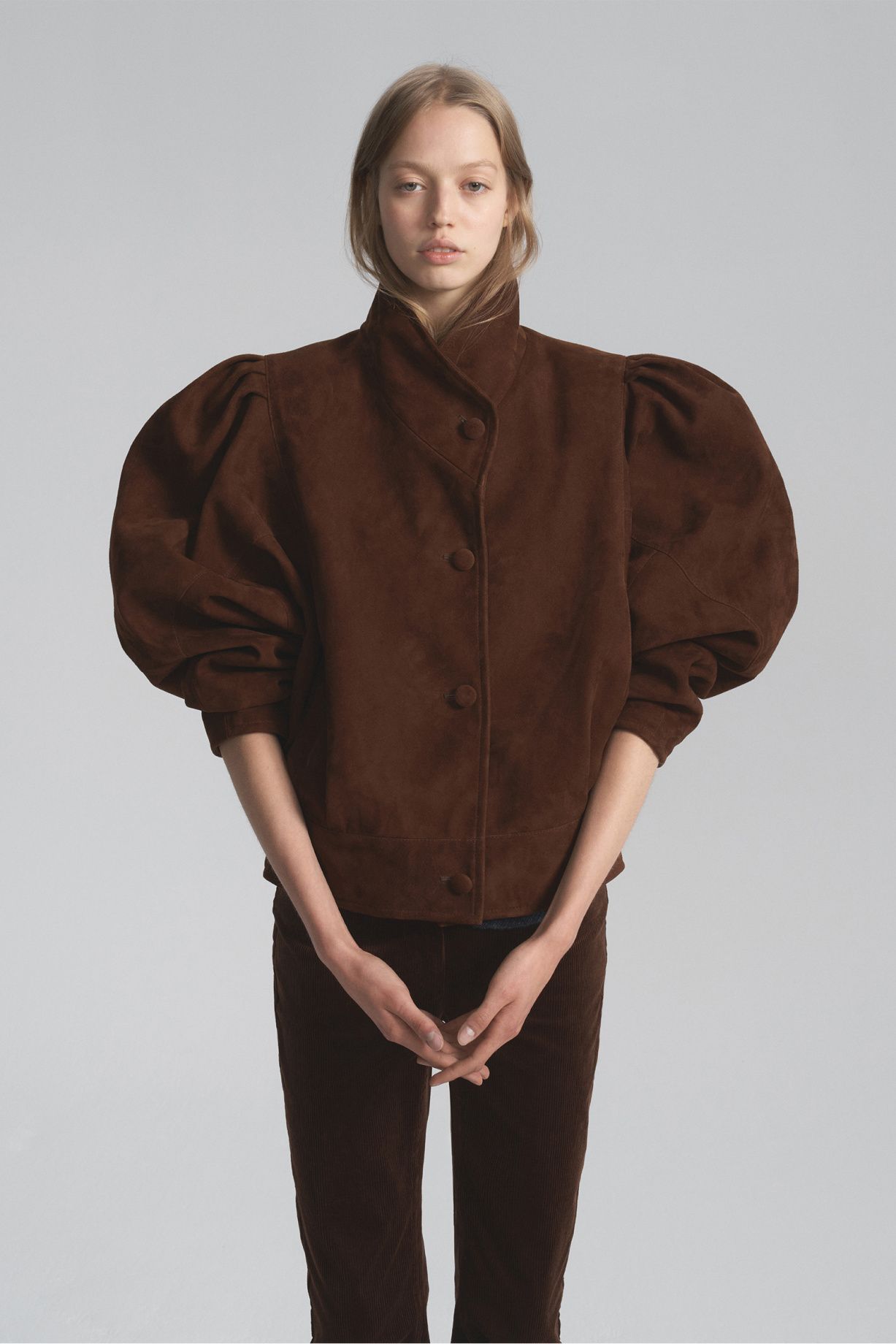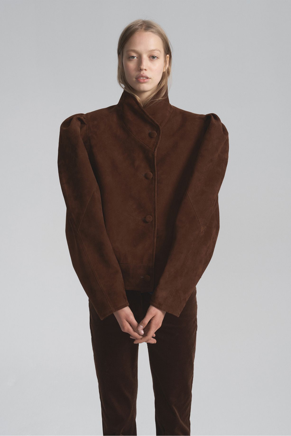 Замшевый жакет с высоким воротником без стойки. Выполнен из натуральной замши коричневого цвета. Дополнен объемными рукавами с крупными декоративными складками и застежками на пуговицах, обтянутых замшей.Состав: 100% натуральная кожа, подклад 100% вискоза
