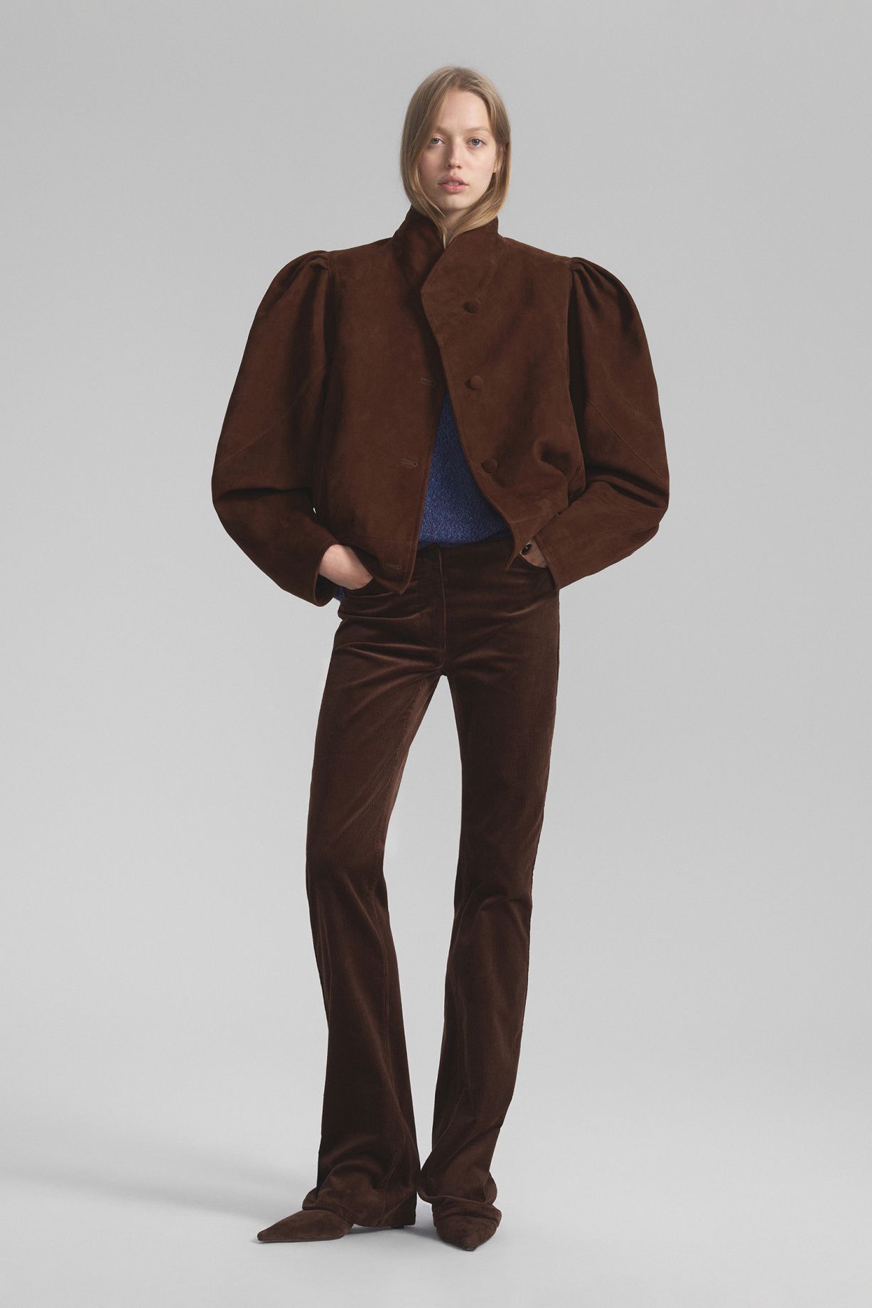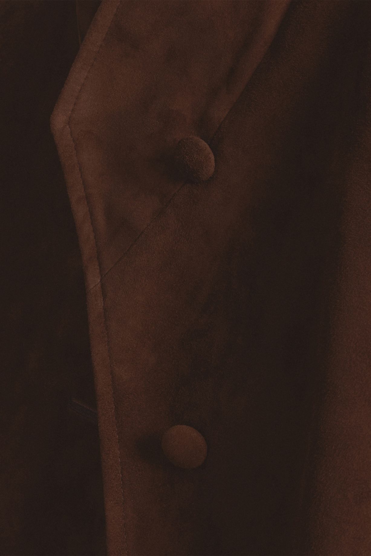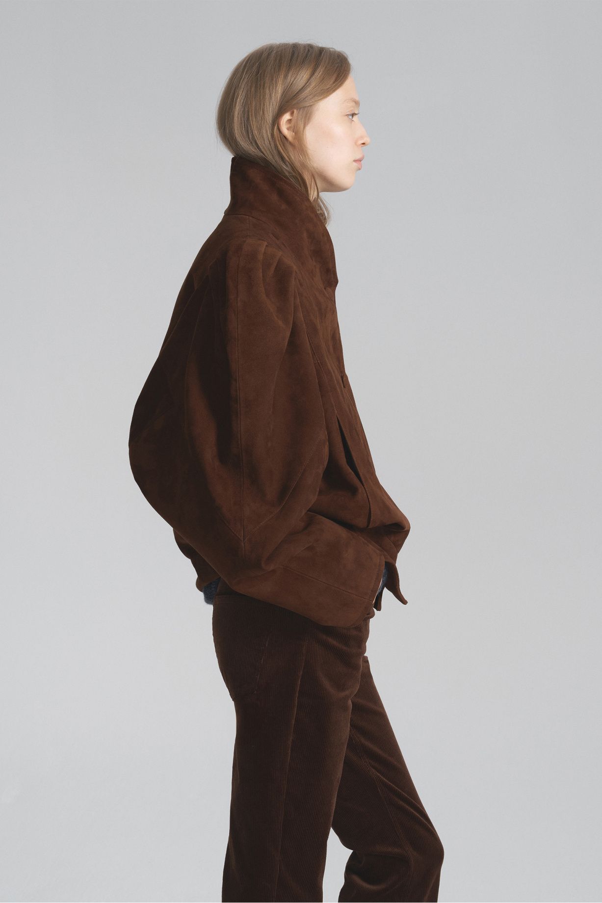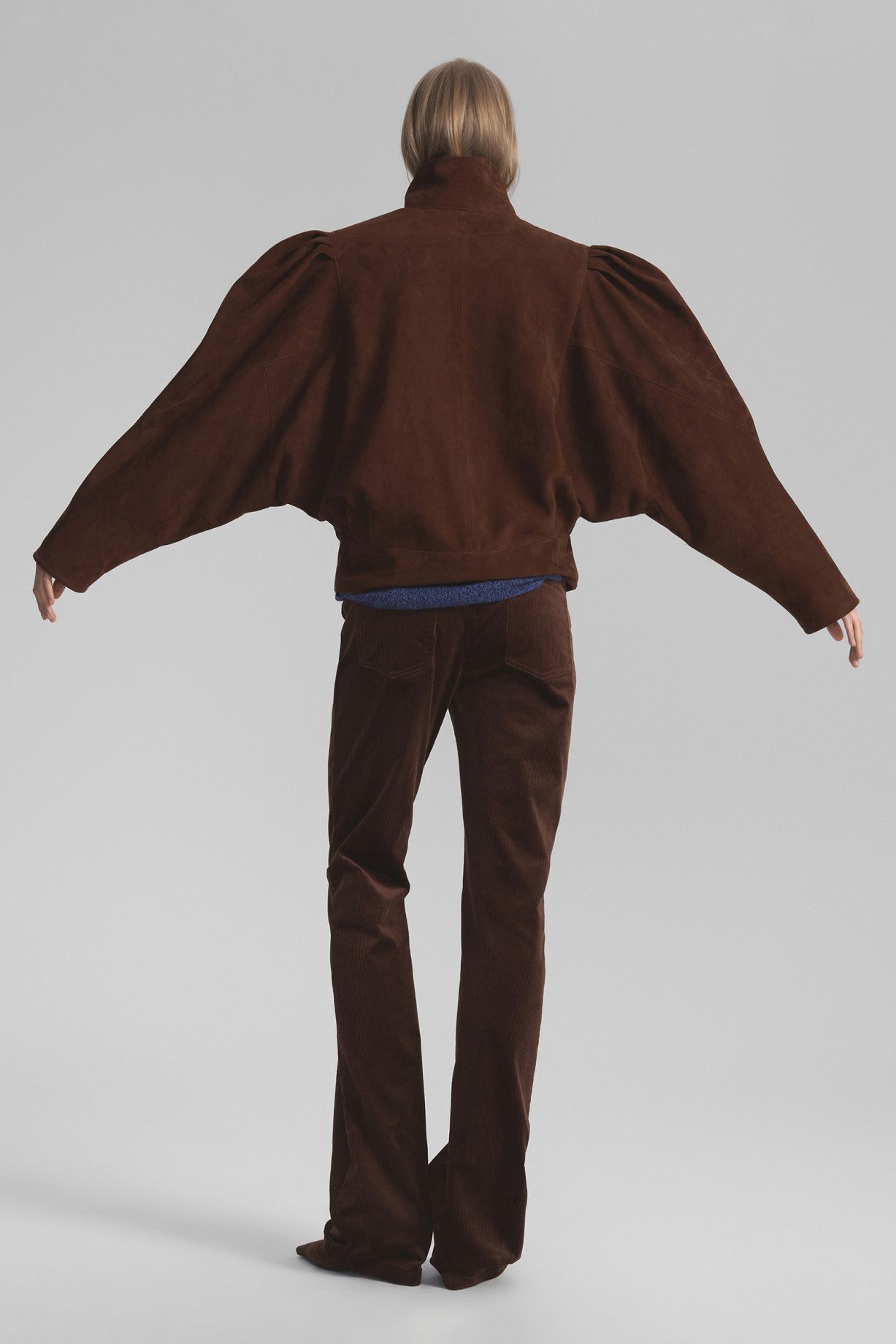 Замшевый жакет с высоким воротником без стойки. Выполнен из натуральной замши коричневого цвета. Дополнен объемными рукавами с крупными декоративными складками и застежками на пуговицах, обтянутых замшей.Состав: 100% натуральная кожа, подклад 100% вискоза