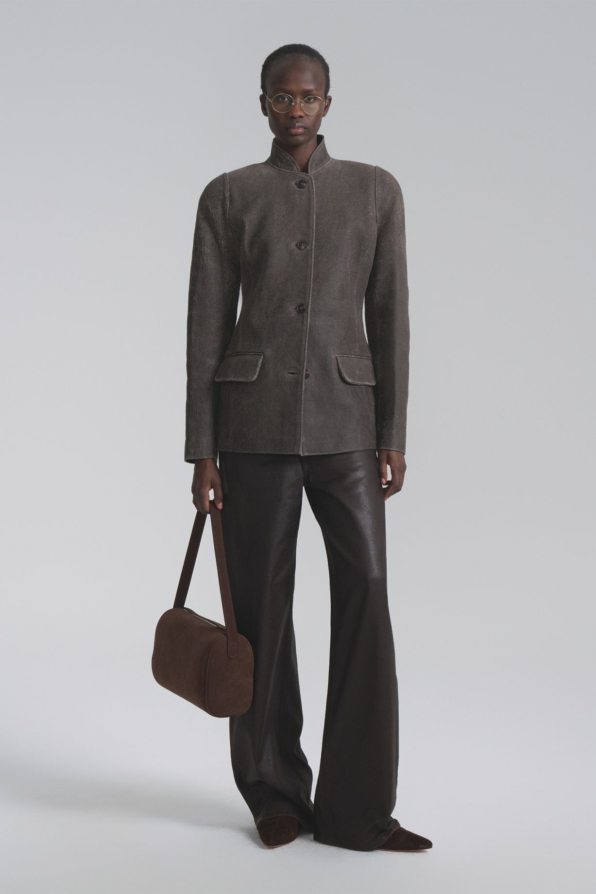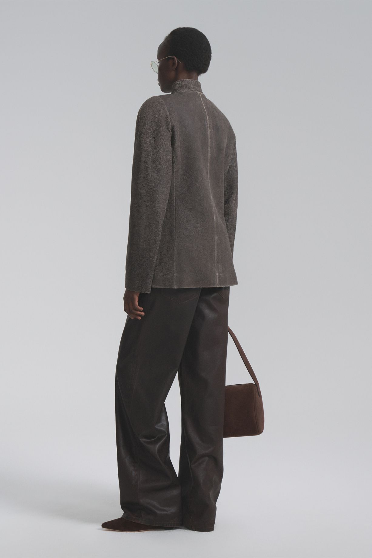 Приталенный жакет из натуральной кожи премиального качества с мраморным эффектом ручной работы, воротник-стойка, объемные плечи, свободный рукав , однобортная застежка на пуговицы.Состав: 100% овечья кожа, подклад - 75% хлопок, 25% полиэстер