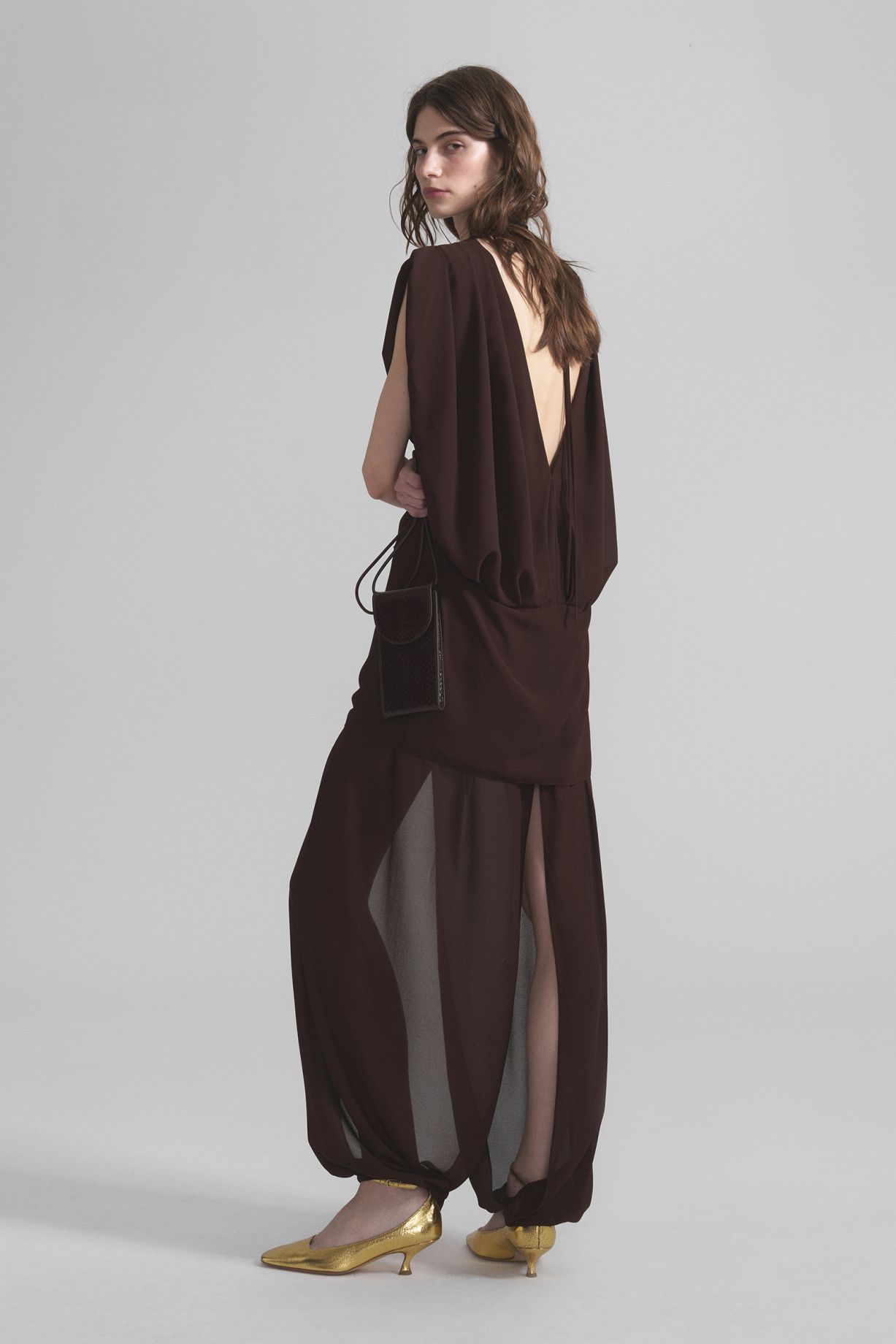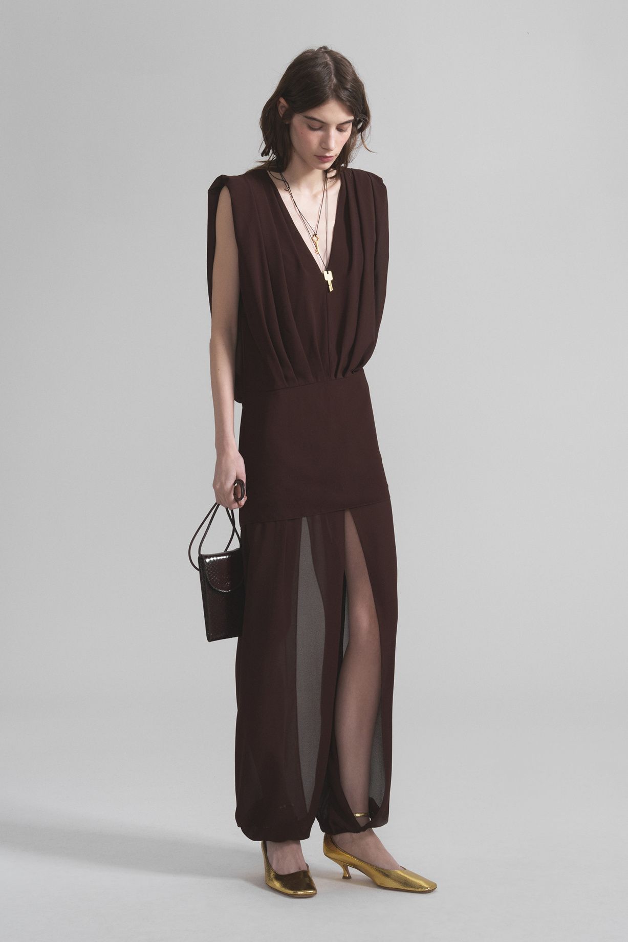 Воздушное платье-комбинезон из струящегося креп-шифона с оригинальным двойным кроем: изысканные складки верхней части сочетаются с укороченной юбкой на элегантном поясе, дополнено брюками на подкладке с мягкими резинками.