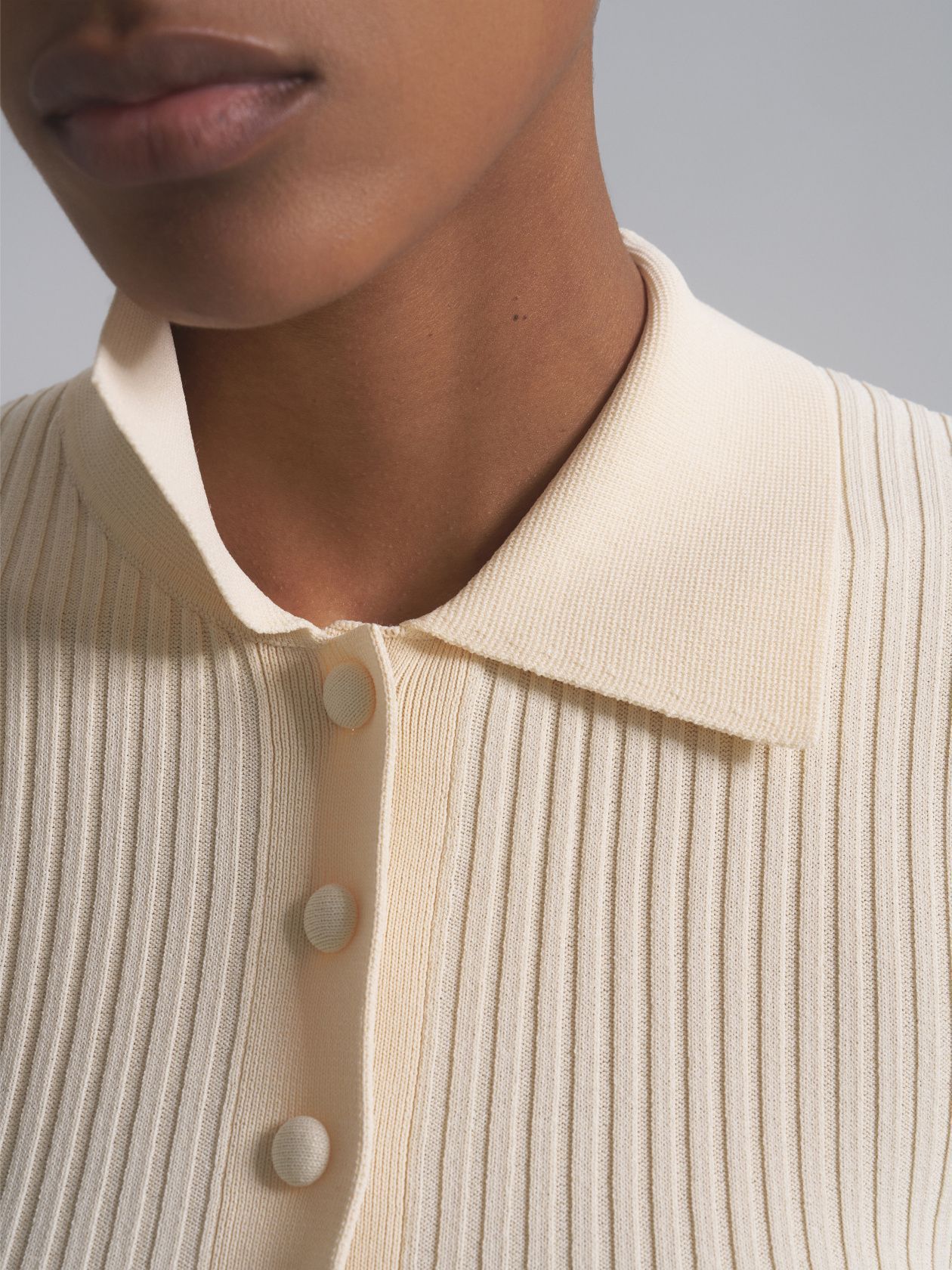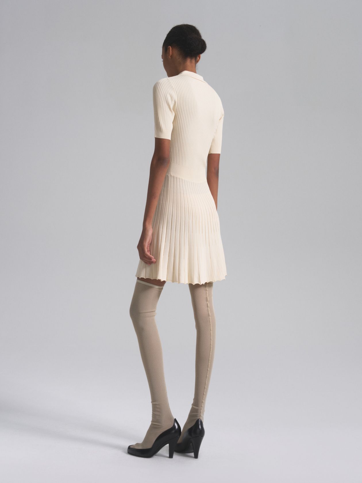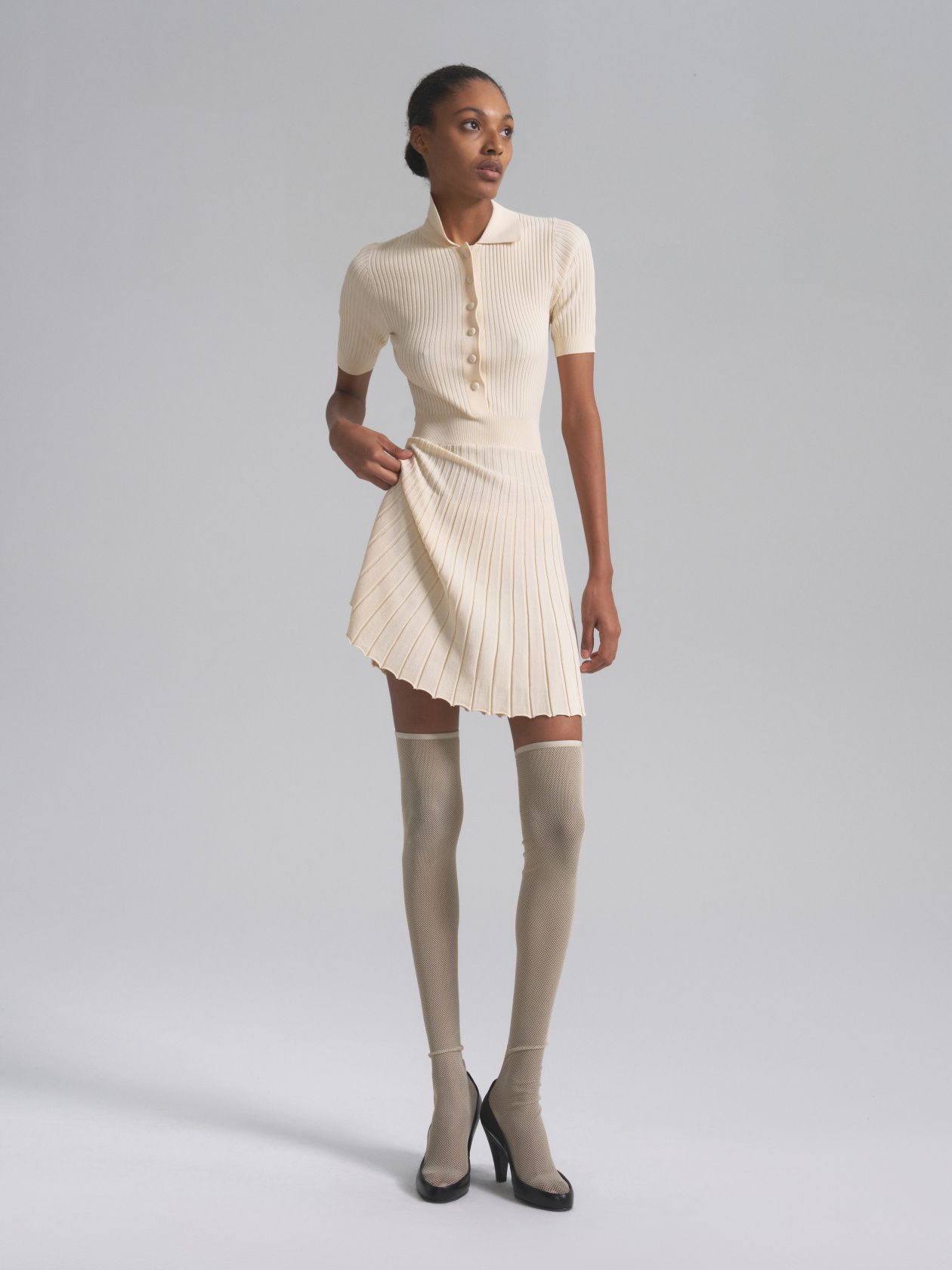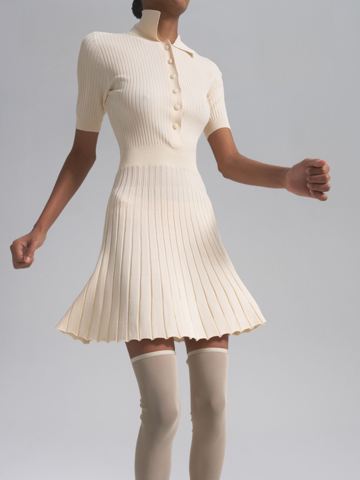 Платье мини приталенного силуэта из трикотажа с застёжкой-планкой на 6 пуговиц, воротником поло, короткими рукавами и юбкой в складку.