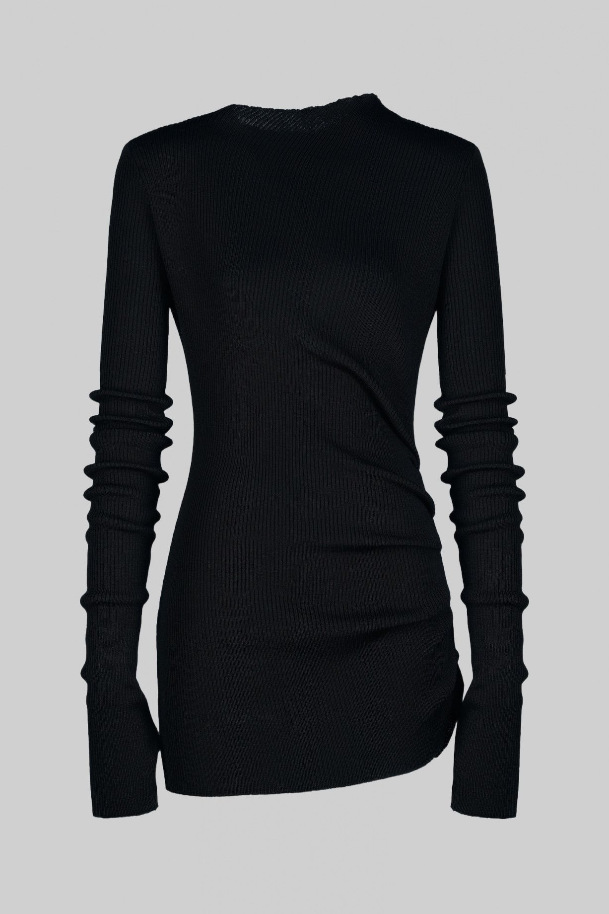 Мини-платье с асимметричным кроем из шерсти австралийского мериноса, сборка по боковому шву, ажурная обработка горловины.Состав: 100% шерсть австралийского мериноса