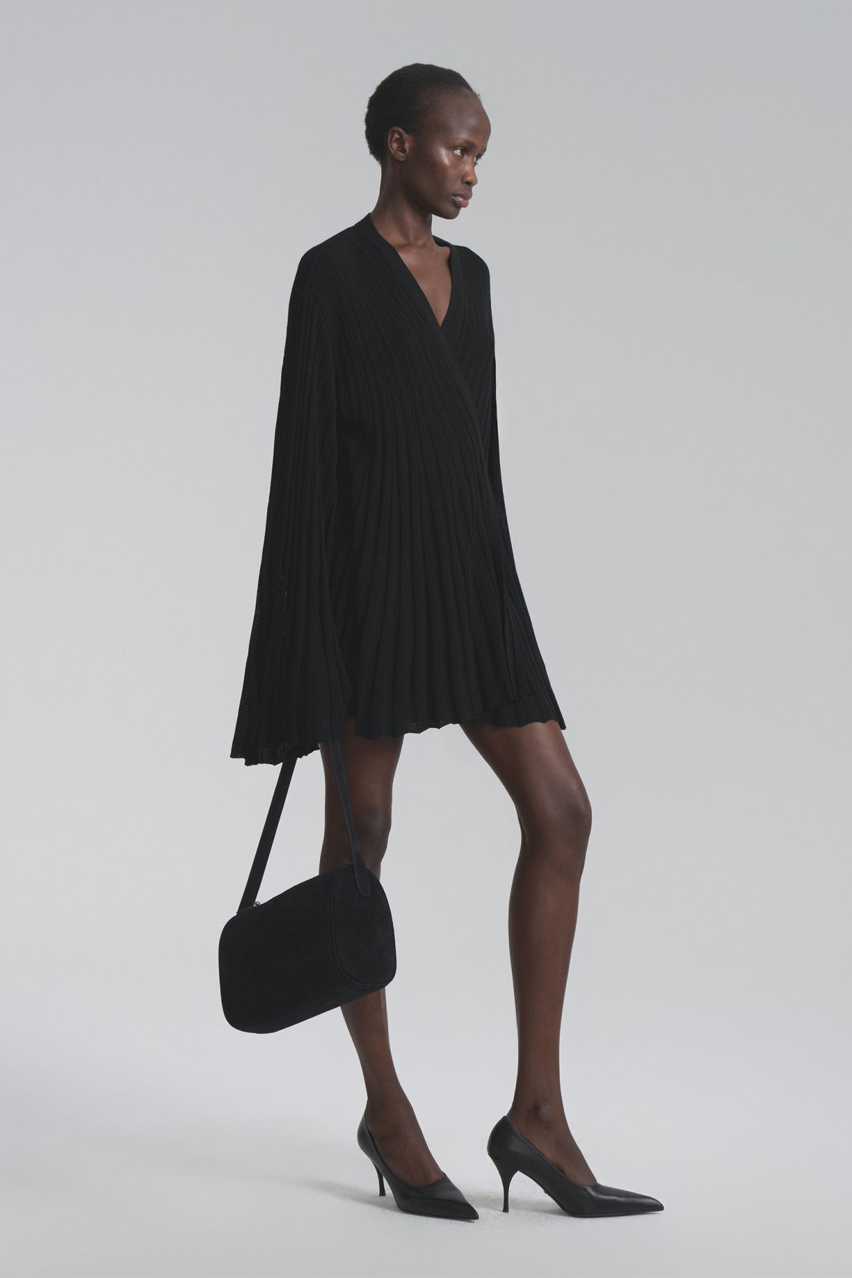 Платье А-силуэта из итальянской пряжи на запах, длины мини, с длинными расклешенными рукавами, совпадающими с линией низа платья, V-образный вырез, пояс для фиксации изделия снаружи и завязками для фиксации изделия изнутри.Состав: 100% вискоза