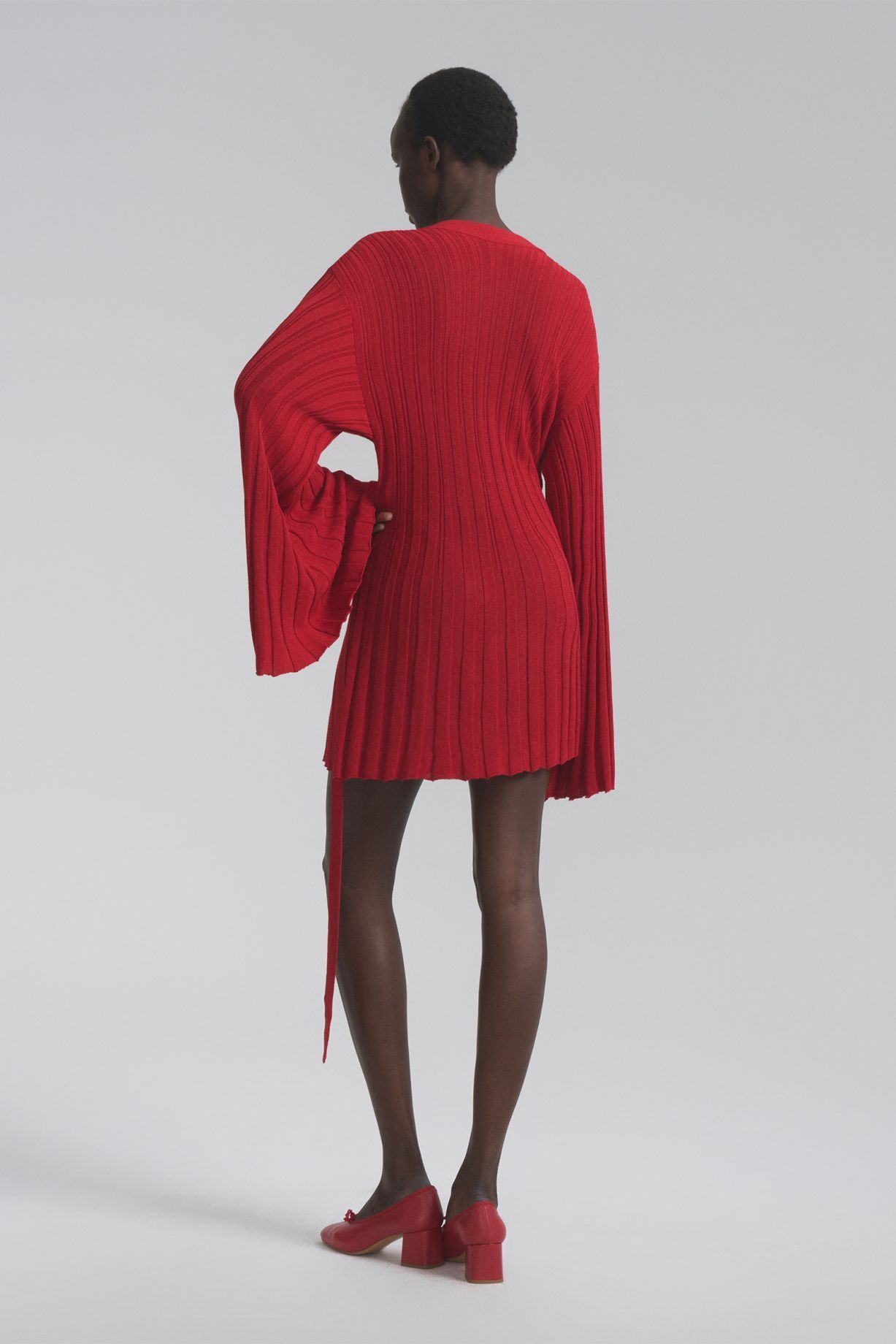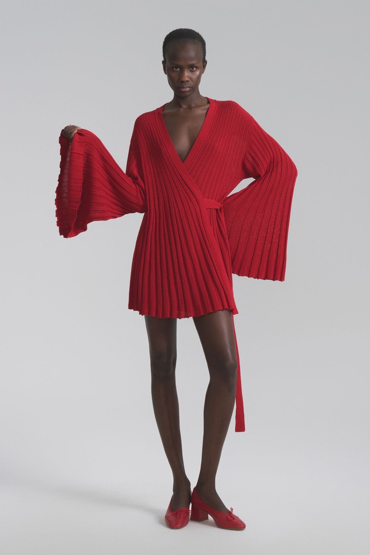Платье А-силуэта из итальянской пряжи на запах, длины мини, с длинными расклешенными рукавами, совпадающими с линией низа платья, V-образный вырез, пояс для фиксации изделия снаружи и завязками для фиксации изделия изнутри.Состав: 100% вискоза