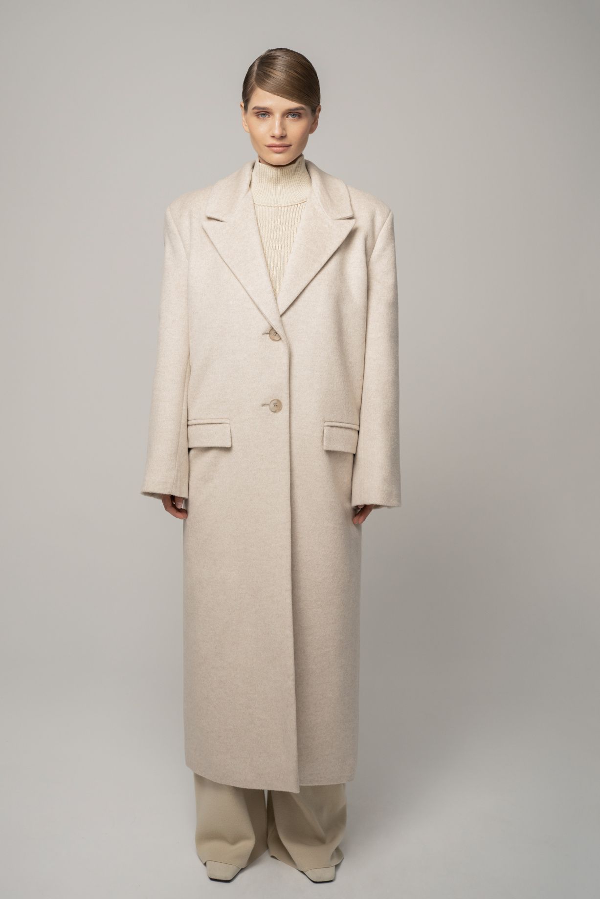 Объемное пальто в цвете бежевый меланж. Oversize модель прямого кроя с высокой шлицей сзади, выполнена из 100% итальянской шерсти. Изделие с геометрически четкими плечами, широкими заостренными лацканами и карманами.Состав: 100% шерсть