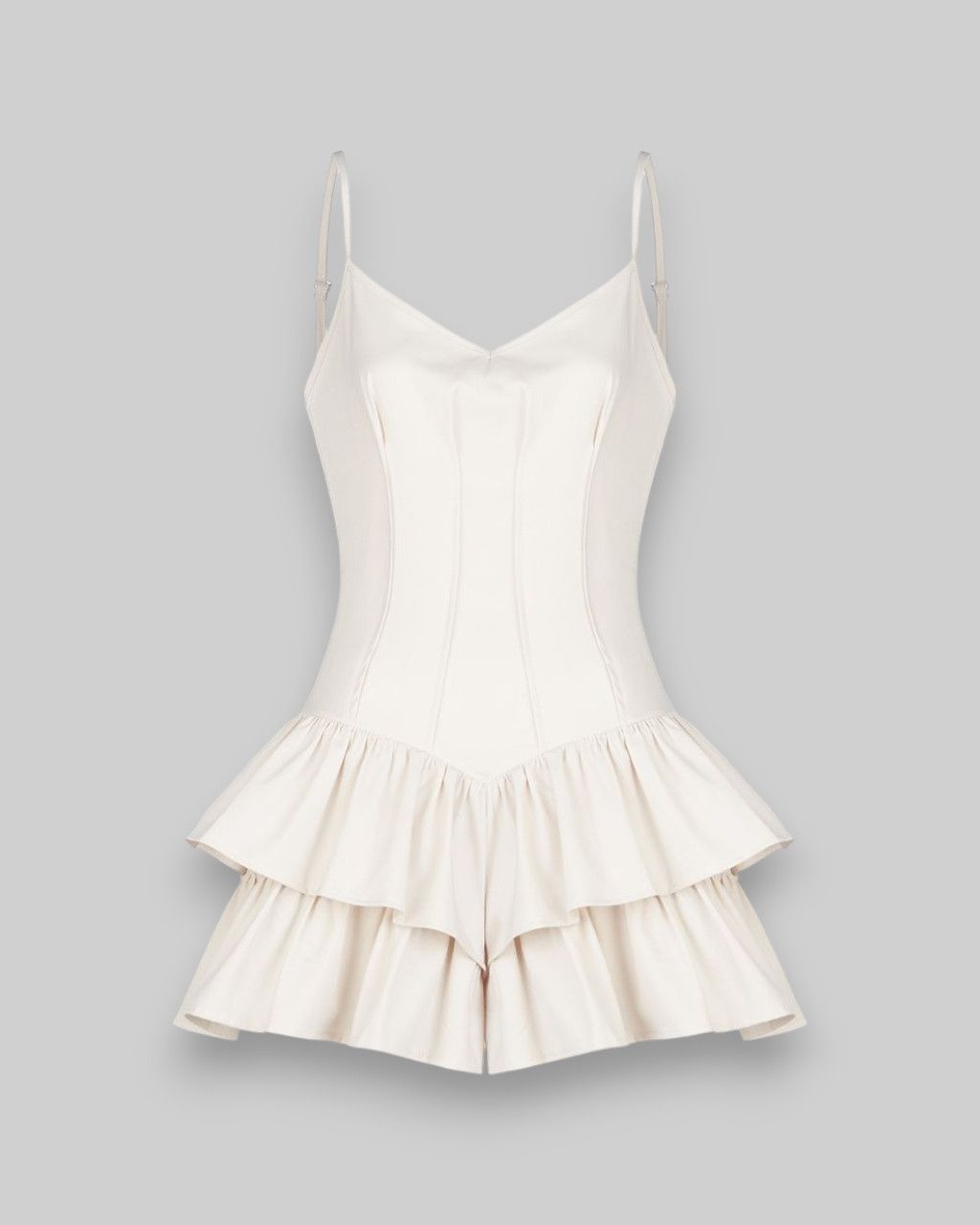 Комбинезон мини сшит, как корсет на тонких бретелях, юбка с двойными воланами.Состав: 80% вискоза, 10% хлопок, 10% эластан