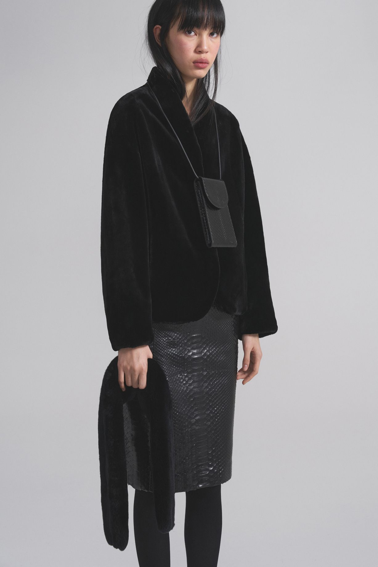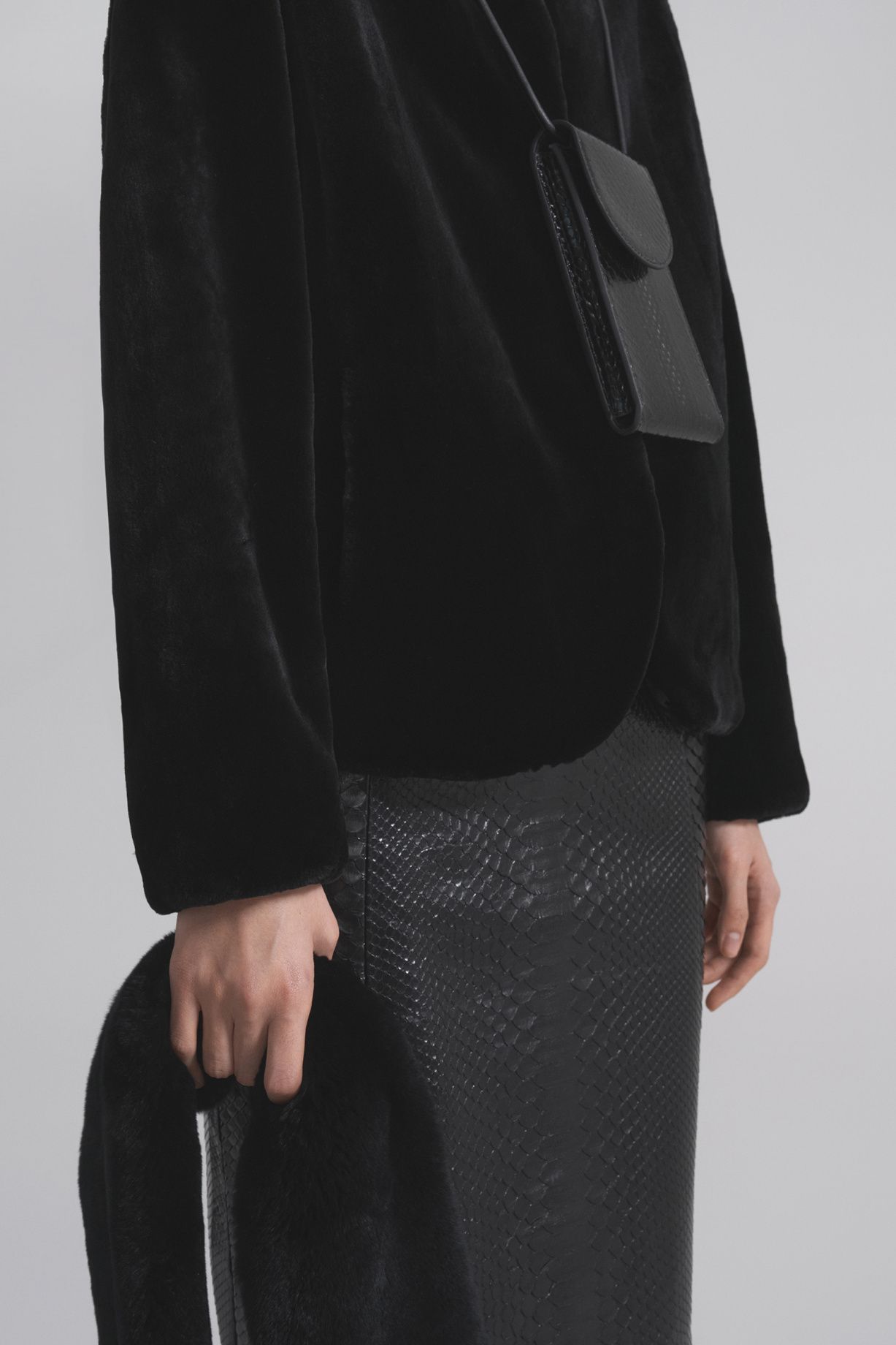 Шуба из премиального натурального аукционного меха норки. Мех глубокого чёрного цвета без посторонних оттенков, с бархатистым матовым блеском и исключительной плотностью. Он мягкий, шелковистый на ощупь и сохраняет форму на протяжении десятилетий. Крой прямой и лаконичный, застёжка на крючки, карманы аккуратно вписаны в силуэт, подчёркивая чистоту линий.