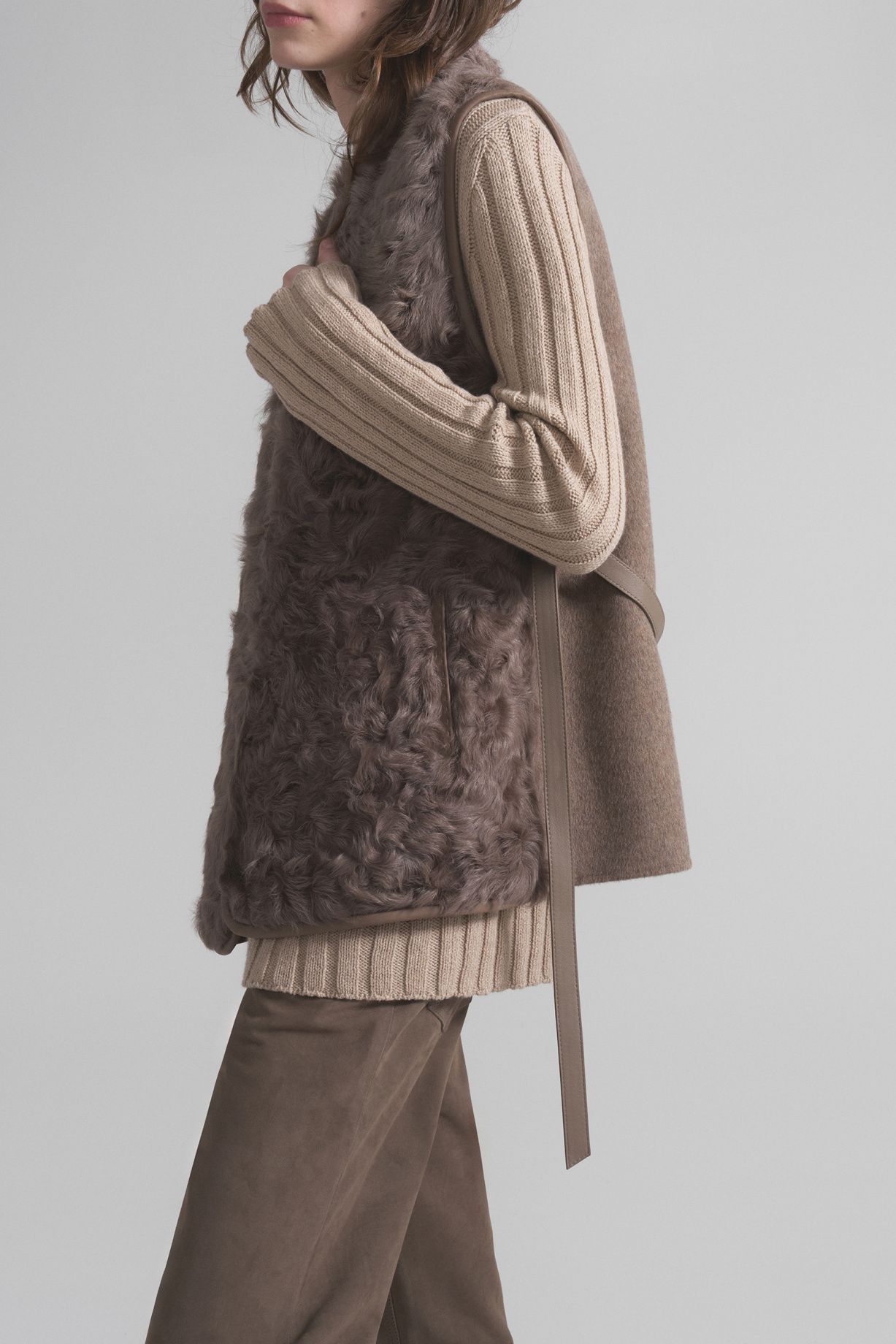 Жилет из натурального каракуля и кашемира. Передняя часть жилета выполнена из густого меха каракуля с естественным завитком, оттенок и рисунок которого уникальны в каждом изделии. Спинка из кашемира. Проймы и вырез горловины окантованы тонкой кожей. Прорезной карман со строчкой ручной работы. Жилет дополнен поясом с декоративным колечком для стилизации образа.