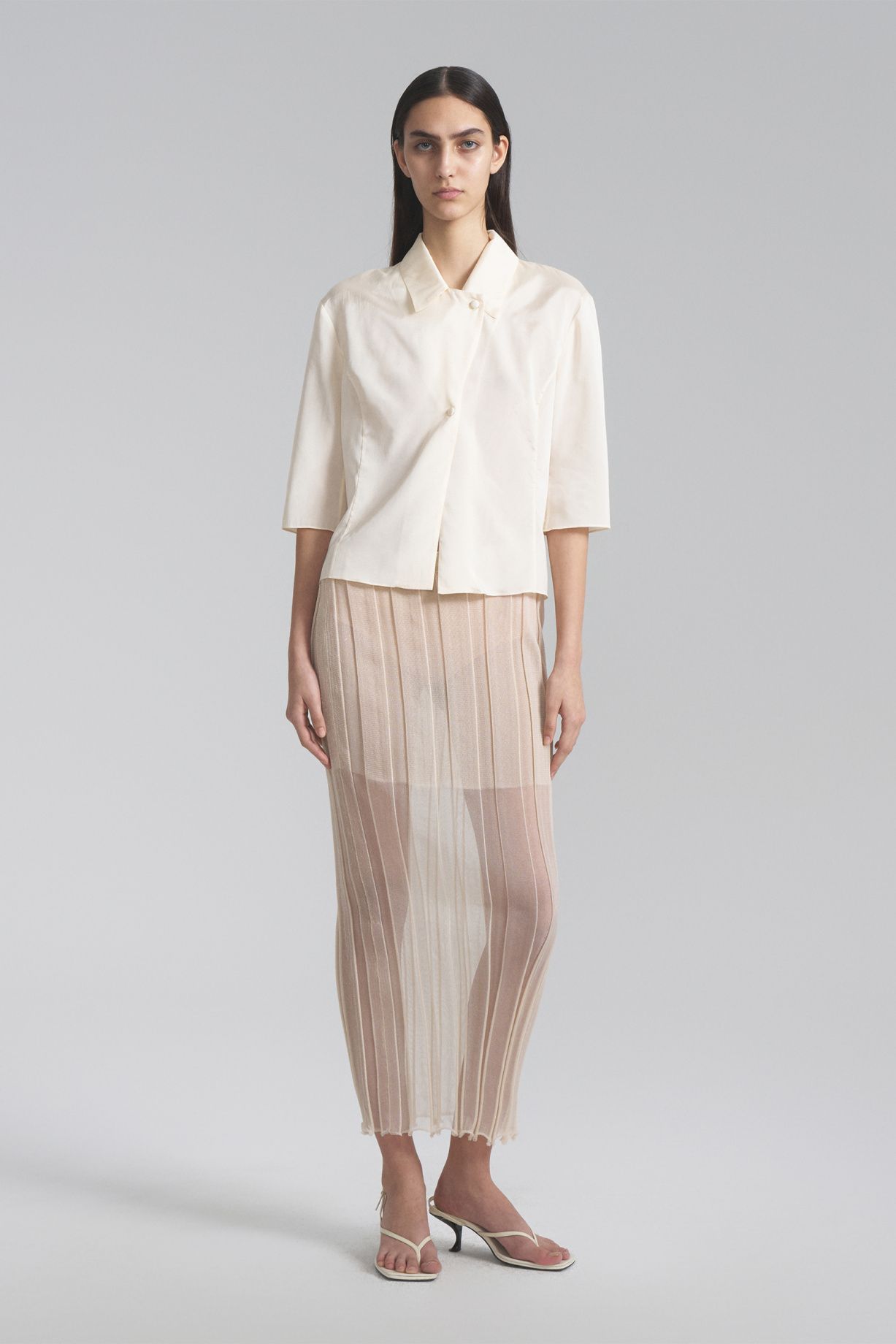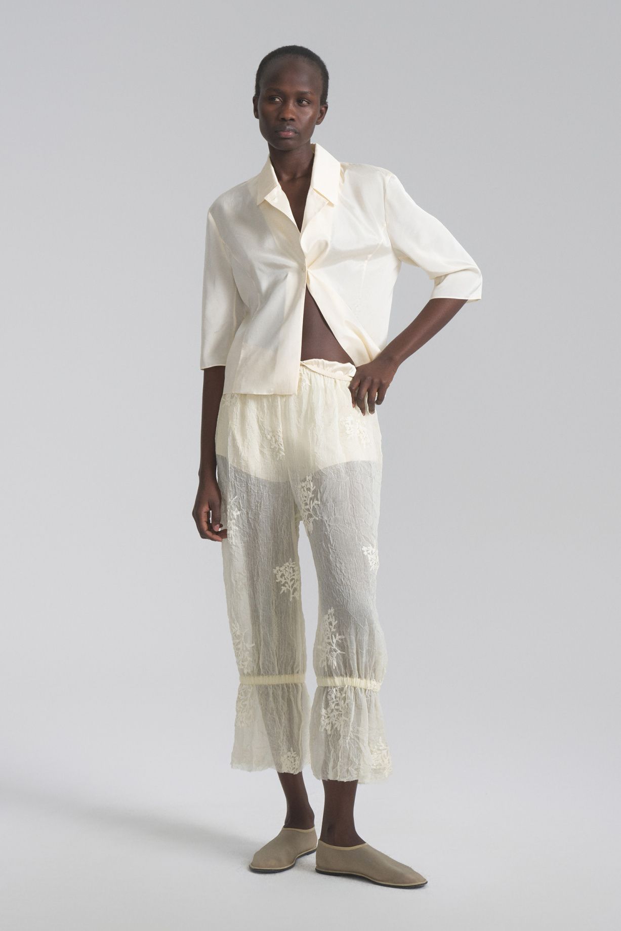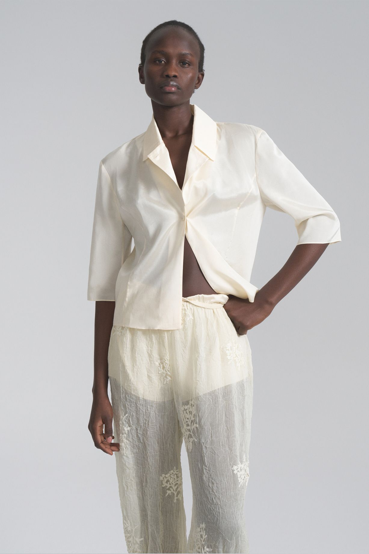 Приталенная блуза-жакет с укороченным рукавом. Сложнокройные легкие брюки, с декоративной имитацией юбки-мини, оформленной ассиметричными складками.Состав: 100% шелк