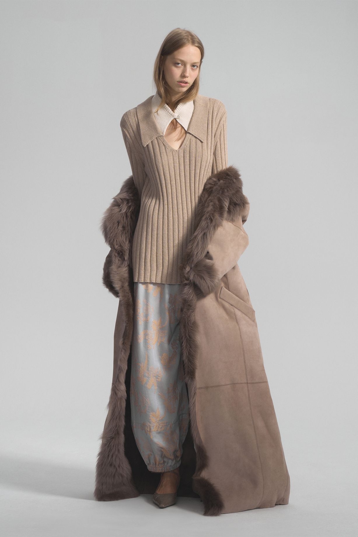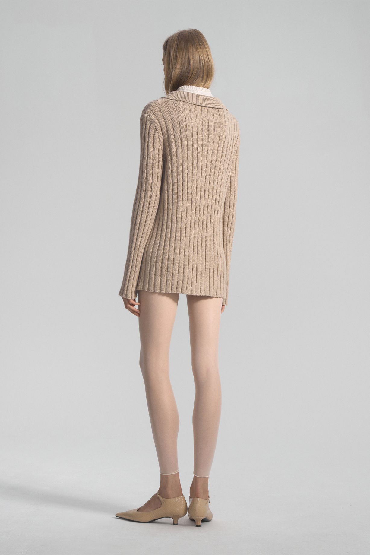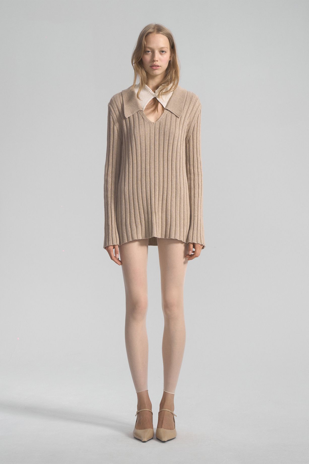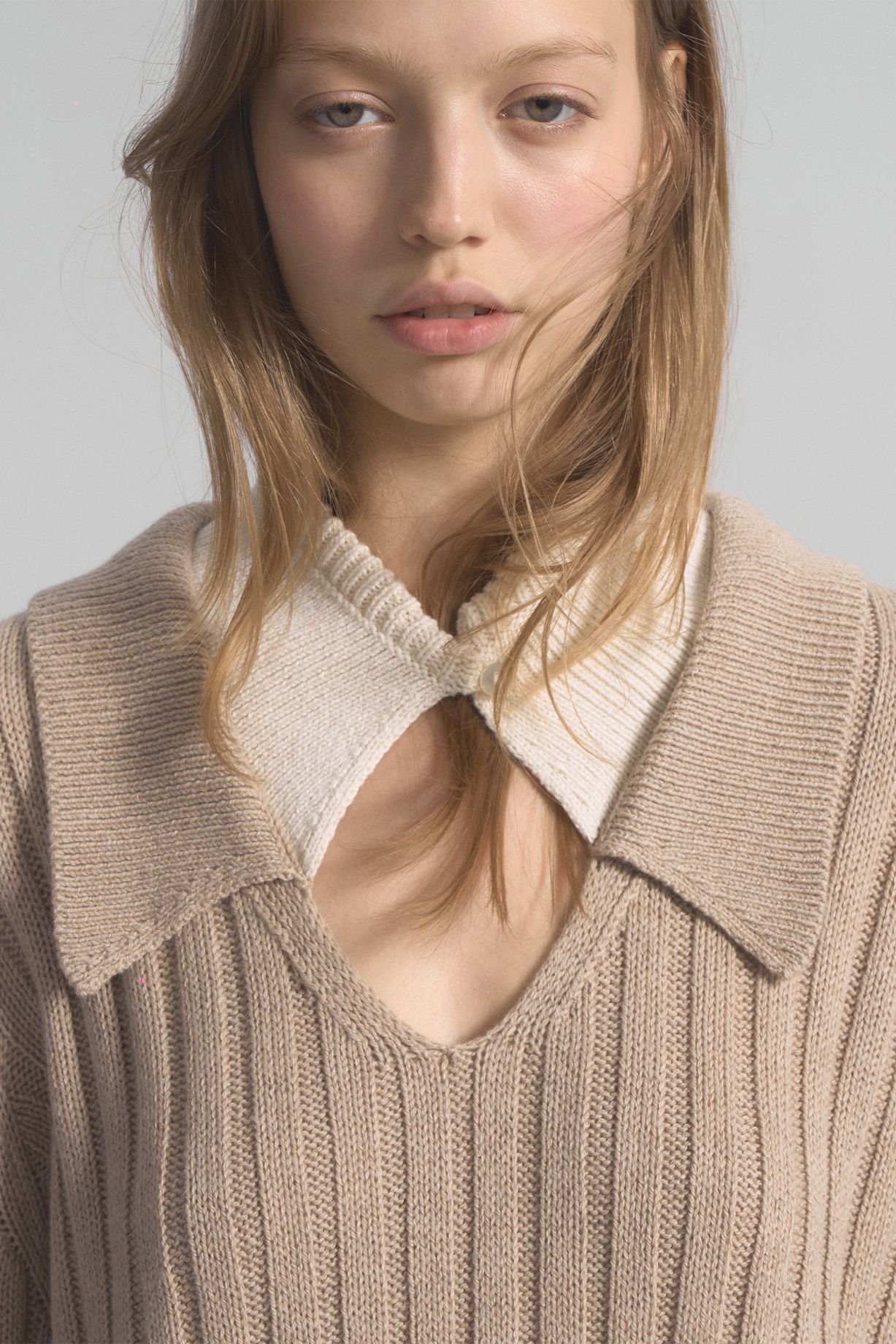 Свитер из кашемира и перуанского хлопка в крупный рубчик, с контрастным воротником, прямого силуэта, с мягкой линией плеч, ровными длинными рукавами и горловиной, оформленной классическим V-образным вырезомСостав: 50% кашемир, 50% хлопок