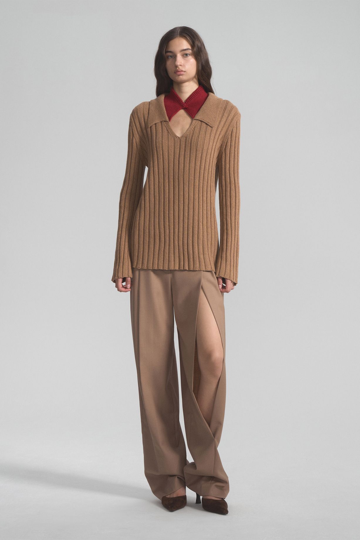 Свитер из кашемира и перуанского хлопка в крупный рубчик, с контрастным воротником, прямого силуэта, с мягкой линией плеч, ровными длинными рукавами и горловиной, оформленной классическим V-образным вырезомСостав: 50% кашемир, 50% хлопок