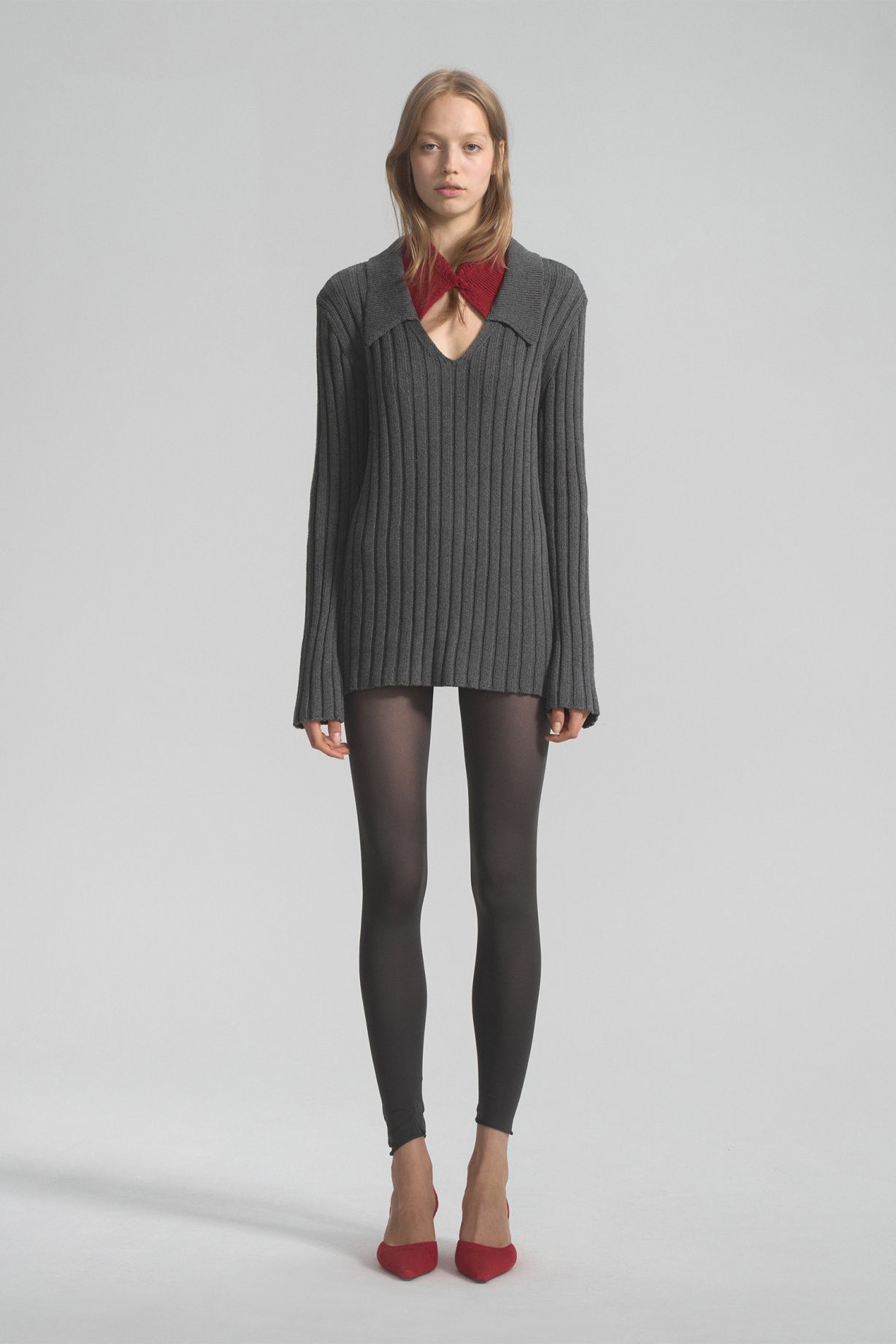 Свитер из кашемира и перуанского хлопка в крупный рубчик, с контрастным воротником, прямого силуэта, с мягкой линией плеч, ровными длинными рукавами и горловиной, оформленной классическим V-образным вырезомСостав: 50% кашемир, 50% хлопок
