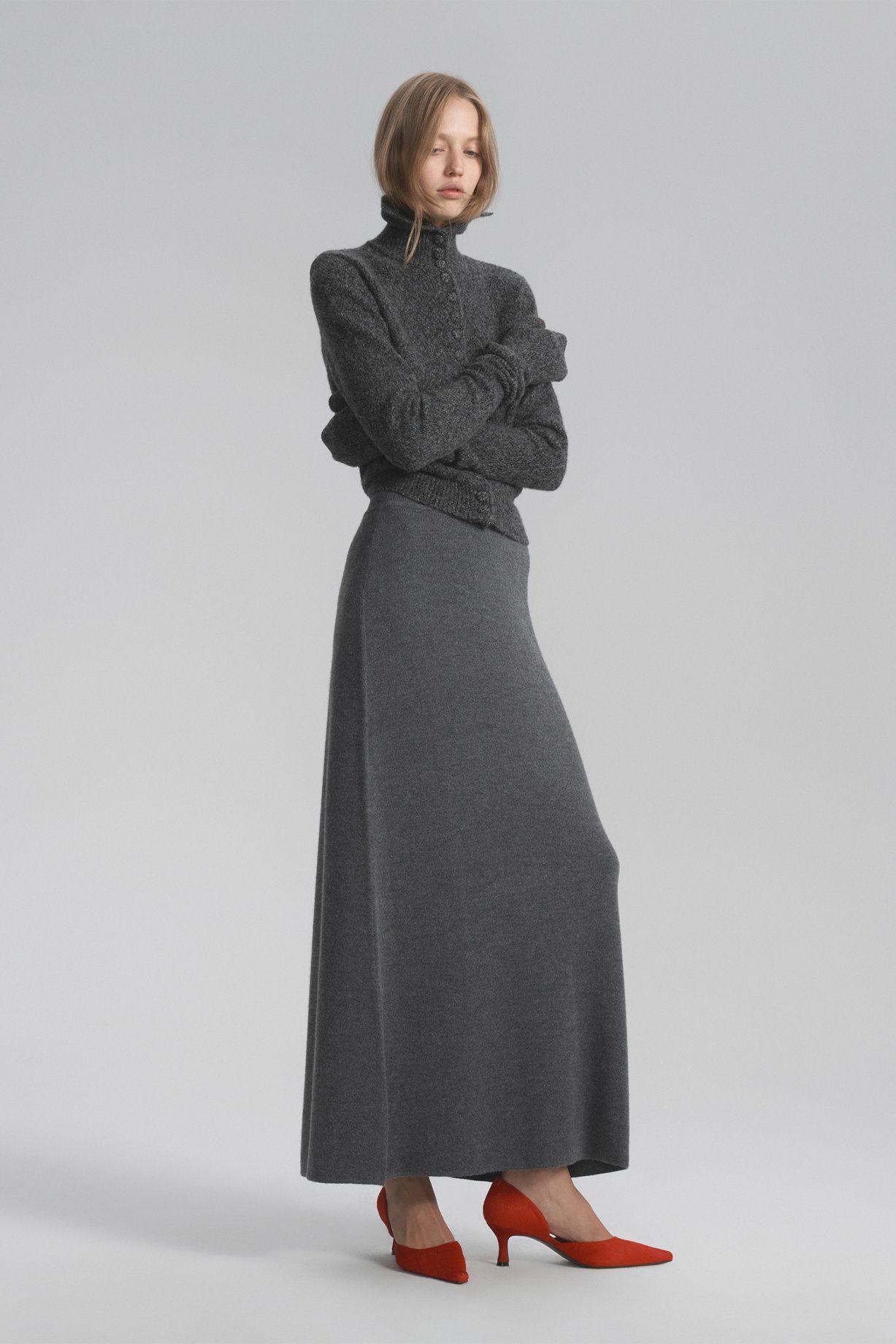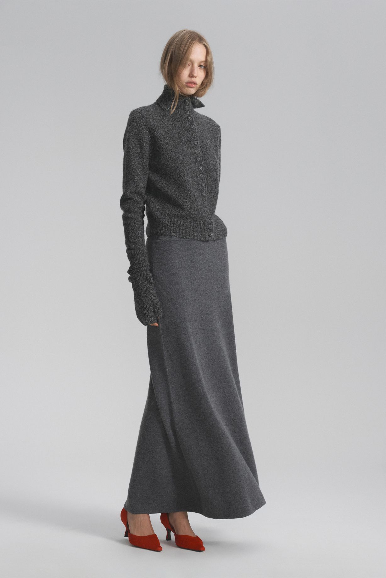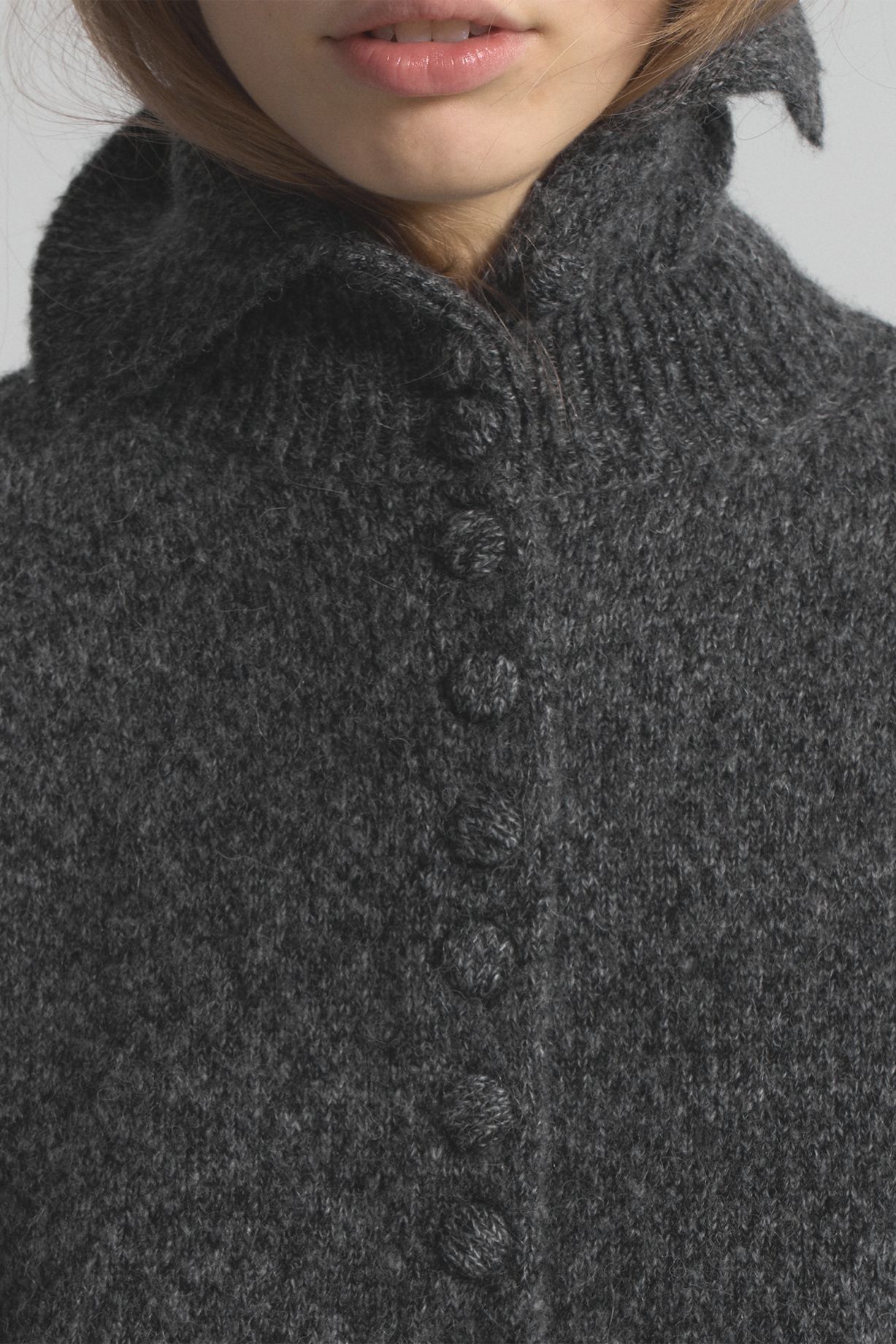 Трикотажный свитер из мягкой шерсти альпаки с обтянутыми пуговицами, длинным рукавом и высоким воротником - стойкой. По низу изделия и рукавов вывязаны манжеты-резинки. Основное переплетение кулирная гладь - где тонкое, гладкое и эластичное трикотажное полотно вяжется из смешанных нитей, создавая приятную на ощупь ткань.Состав: 80% шерсть мериноса 15% вискоза 5% эластан