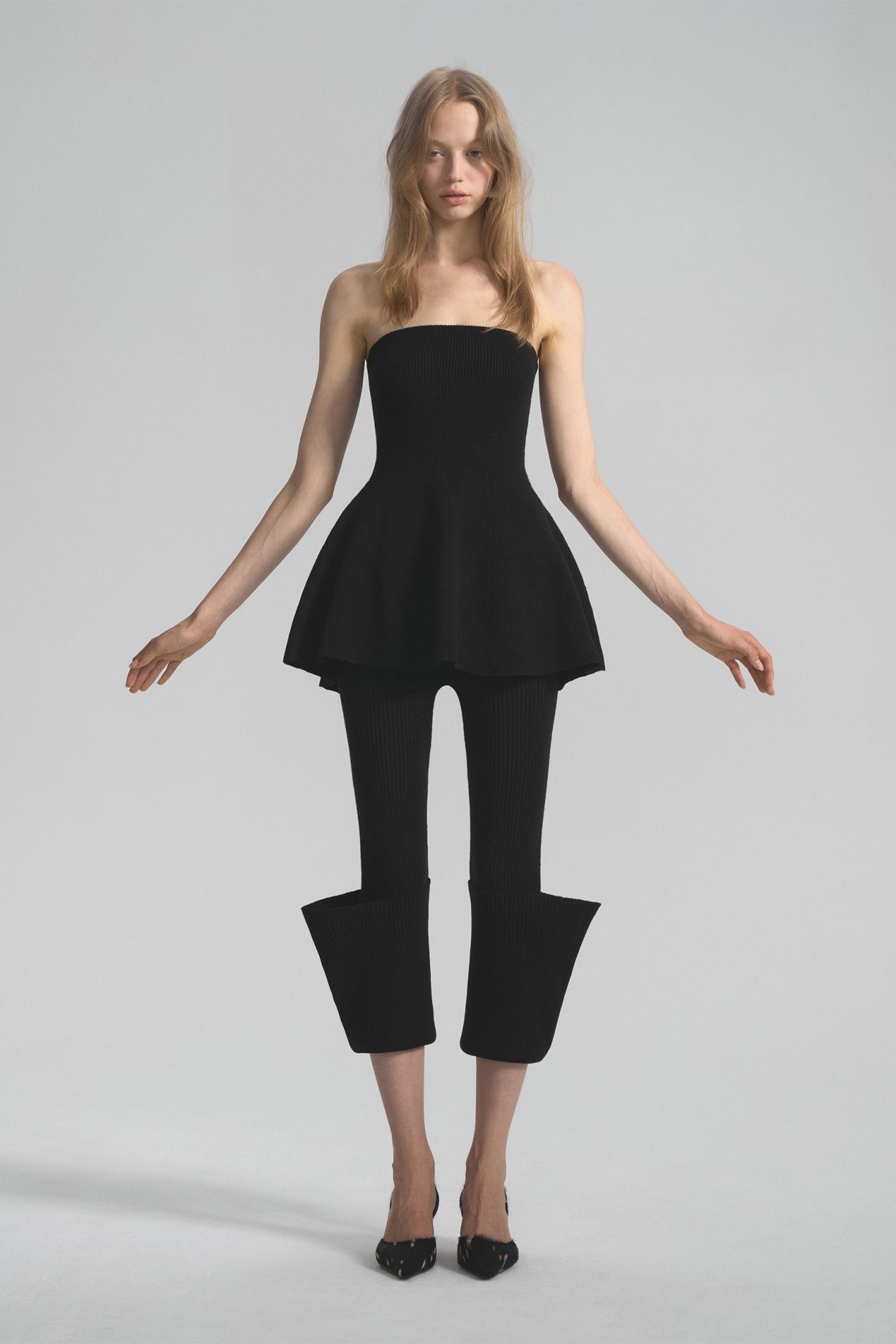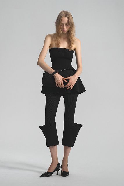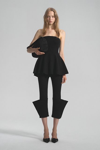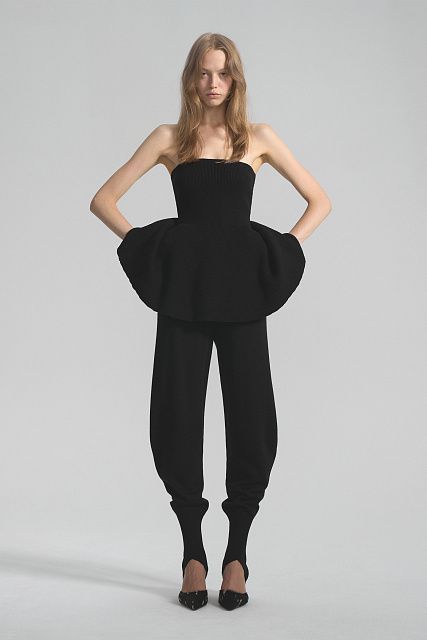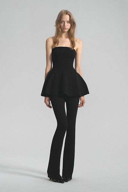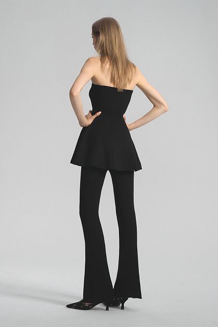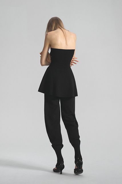 Топ-бандо приталенного силуэта с расширенной по низу юбкой-баской. Связан из тонкого эластичного трикотажа на вискозной основе. Верхний край спинки и талия дополнительно провязаны спандексом для лучшей фиксации.Состав: 80% вискоза, 20% шерсть