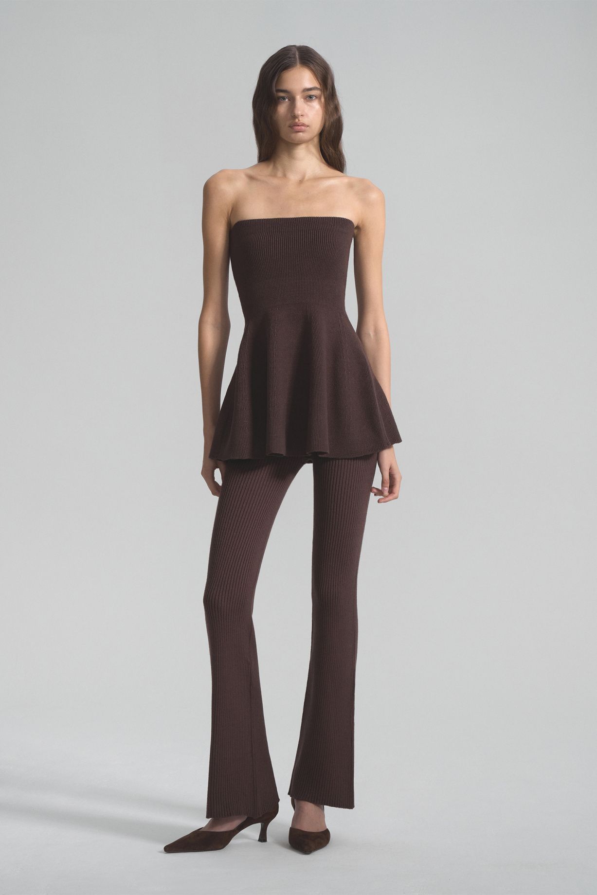 Топ-бандо приталенного силуэта с расширенной по низу юбкой-баской. Связан из тонкого эластичного трикотажа на вискозной основе. Верхний край спинки и талия дополнительно провязаны спандексом для лучшей фиксации.Состав: 80% вискоза, 20% шерсть