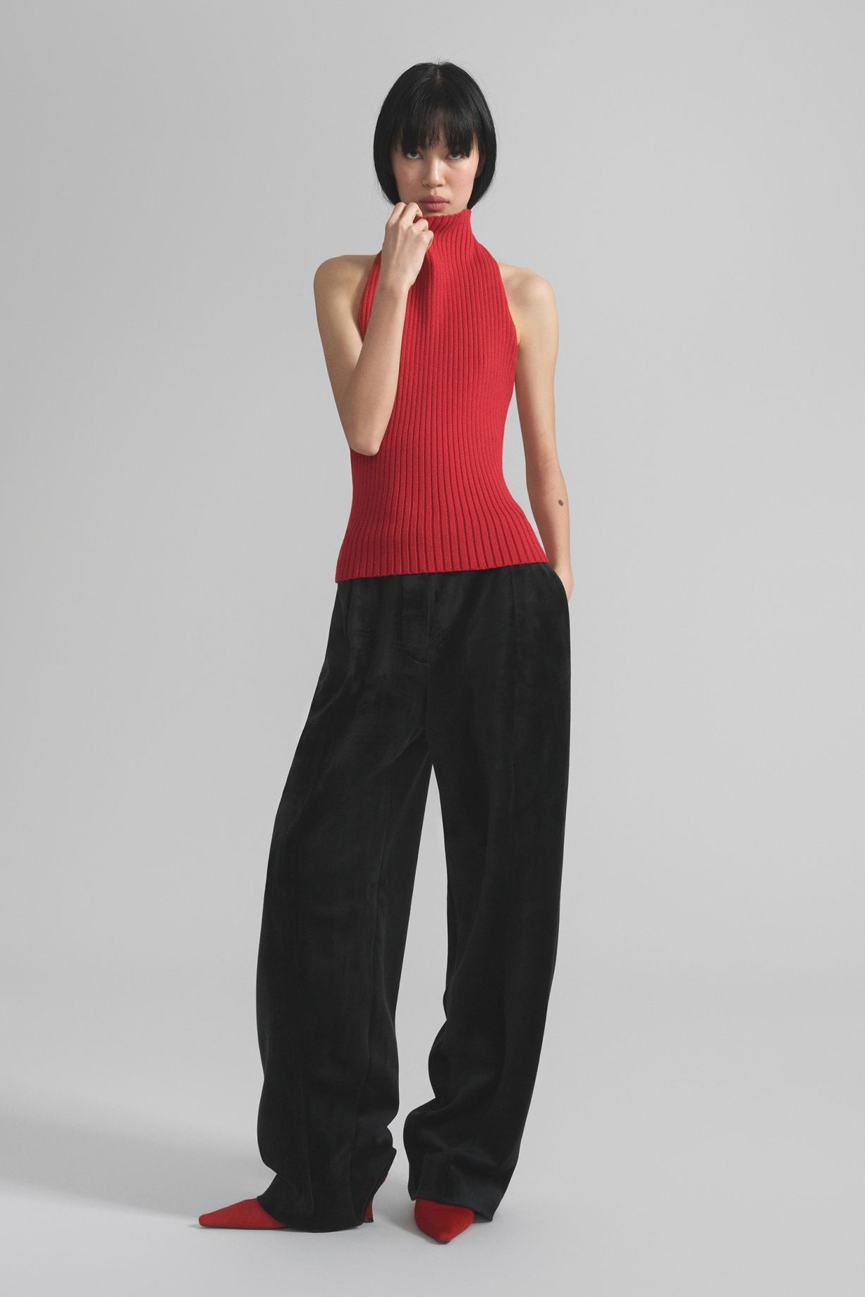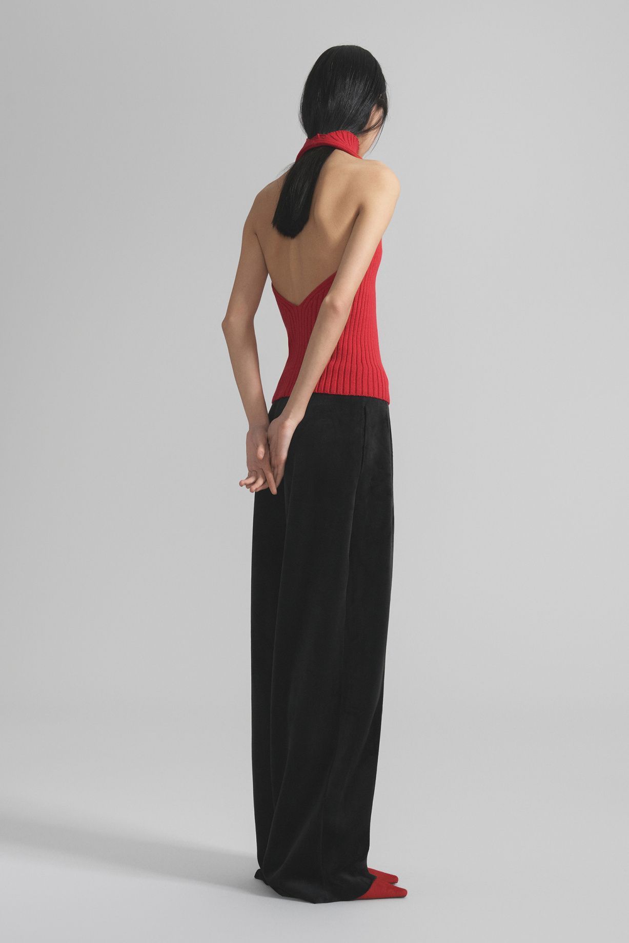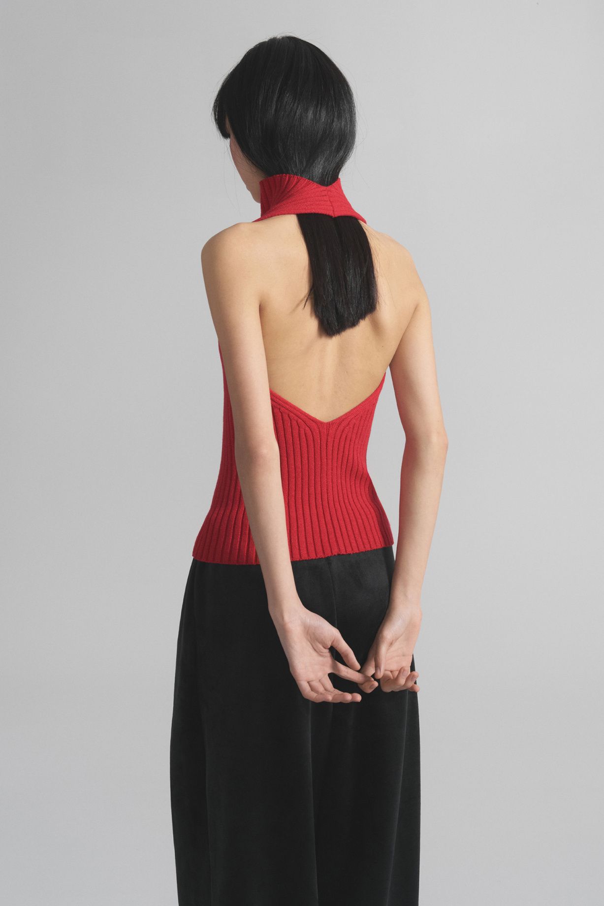 Топ из плотного трикотажа с добавлением шерсти. Модель выполнена из одной детали с цельновязаным воротником-стойкой. Глубокий вырез на спине плавно уходит от плеч вниз, создавая деликатный контраст со структурой изделия. Эластичная и плотная фактура обеспечивает комфортную посадку.