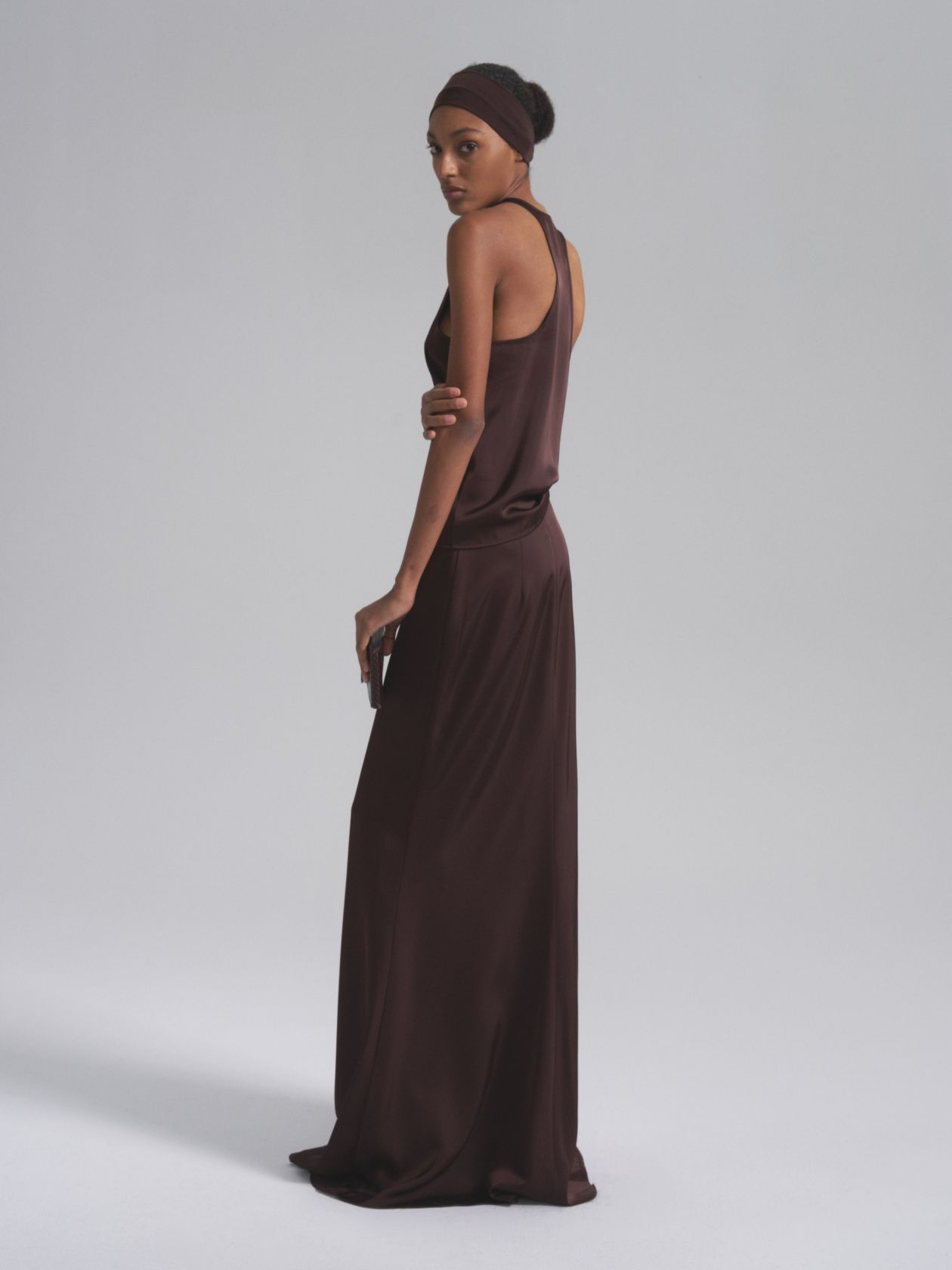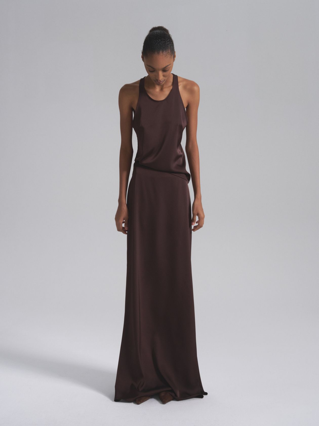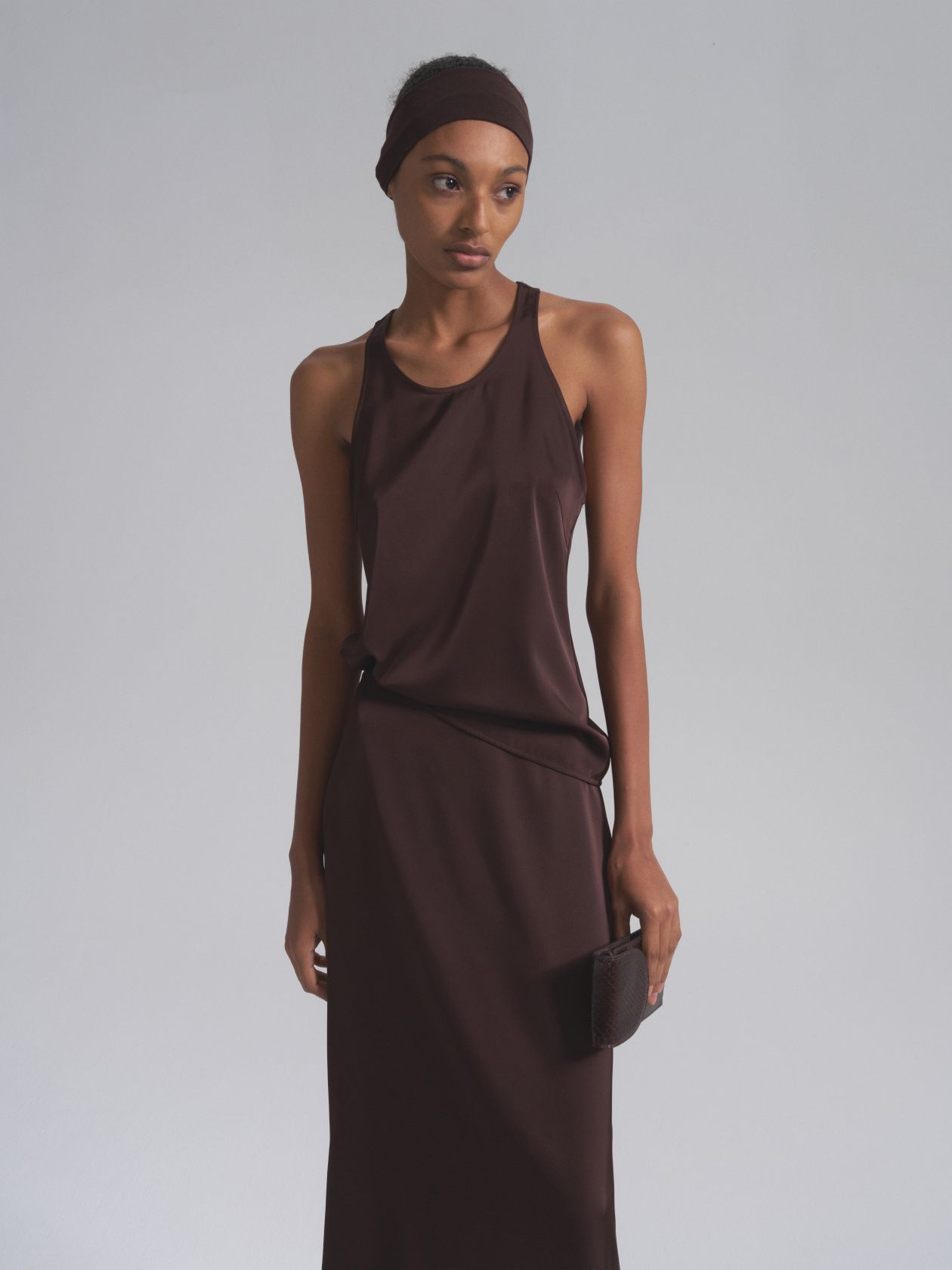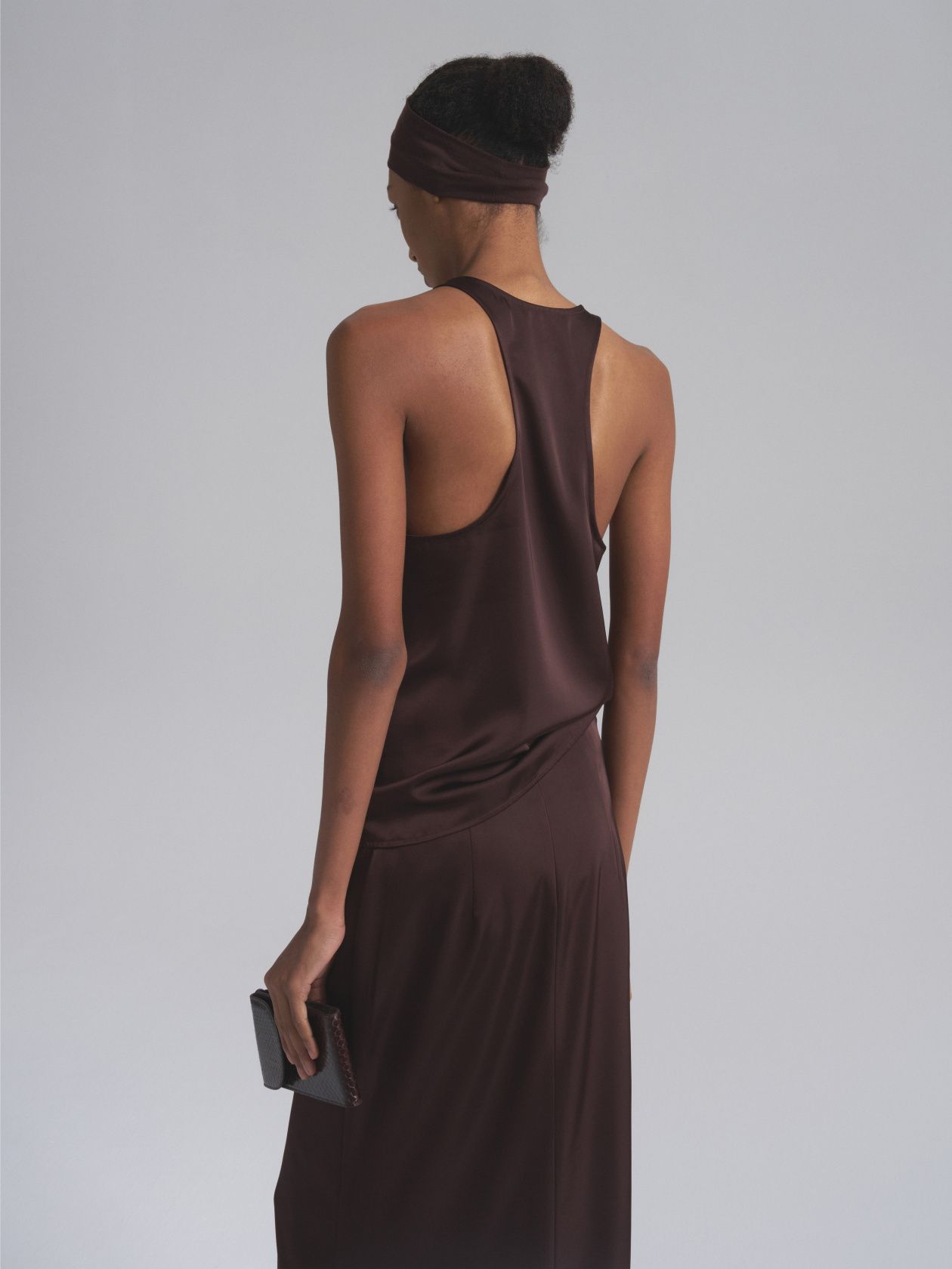 Классическая майка-топ с легким сатиновым блеском. Минималистичный дизайн подчеркивает линию плеч и ключиц за счет открытой проймы. Модель дополнит любой повседневный и вечерний образ, став идеальной основой вашего базового гардероба.