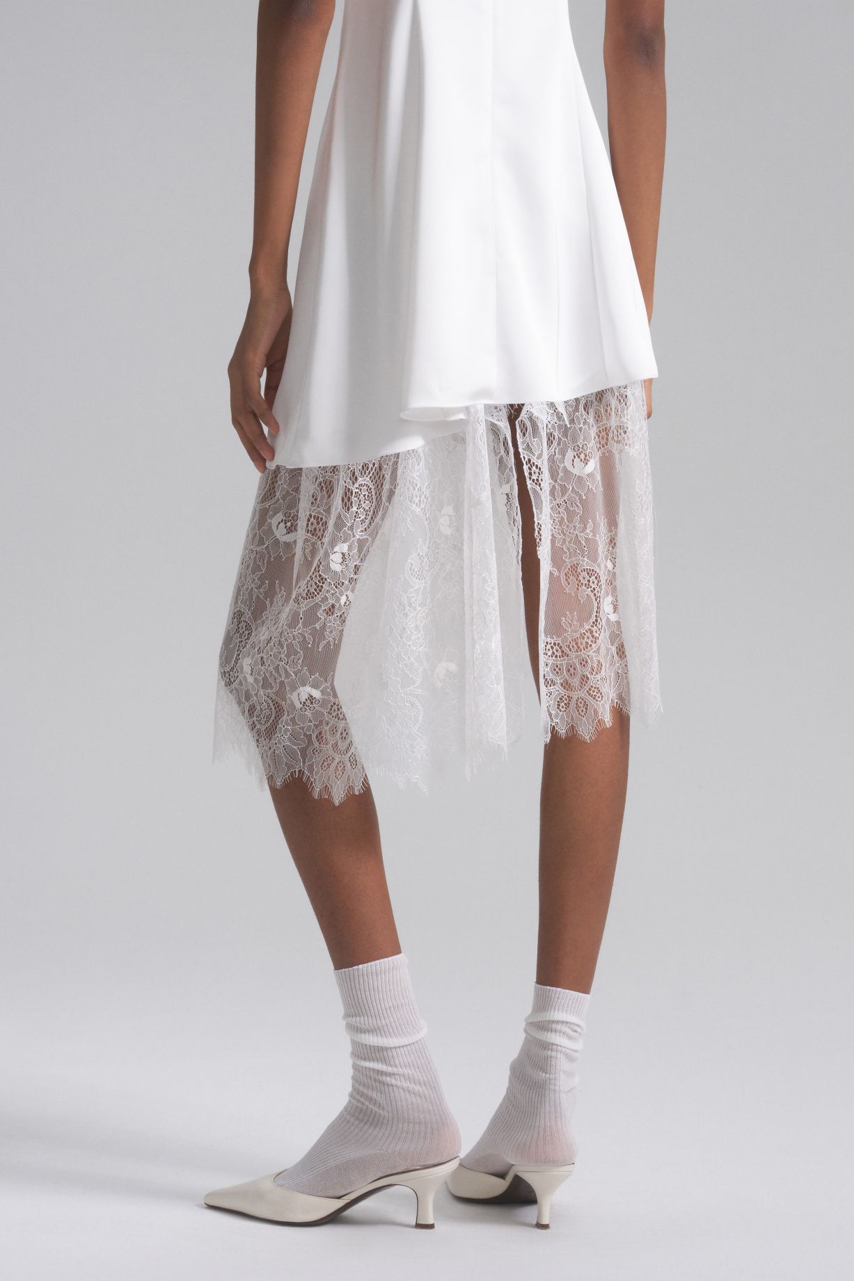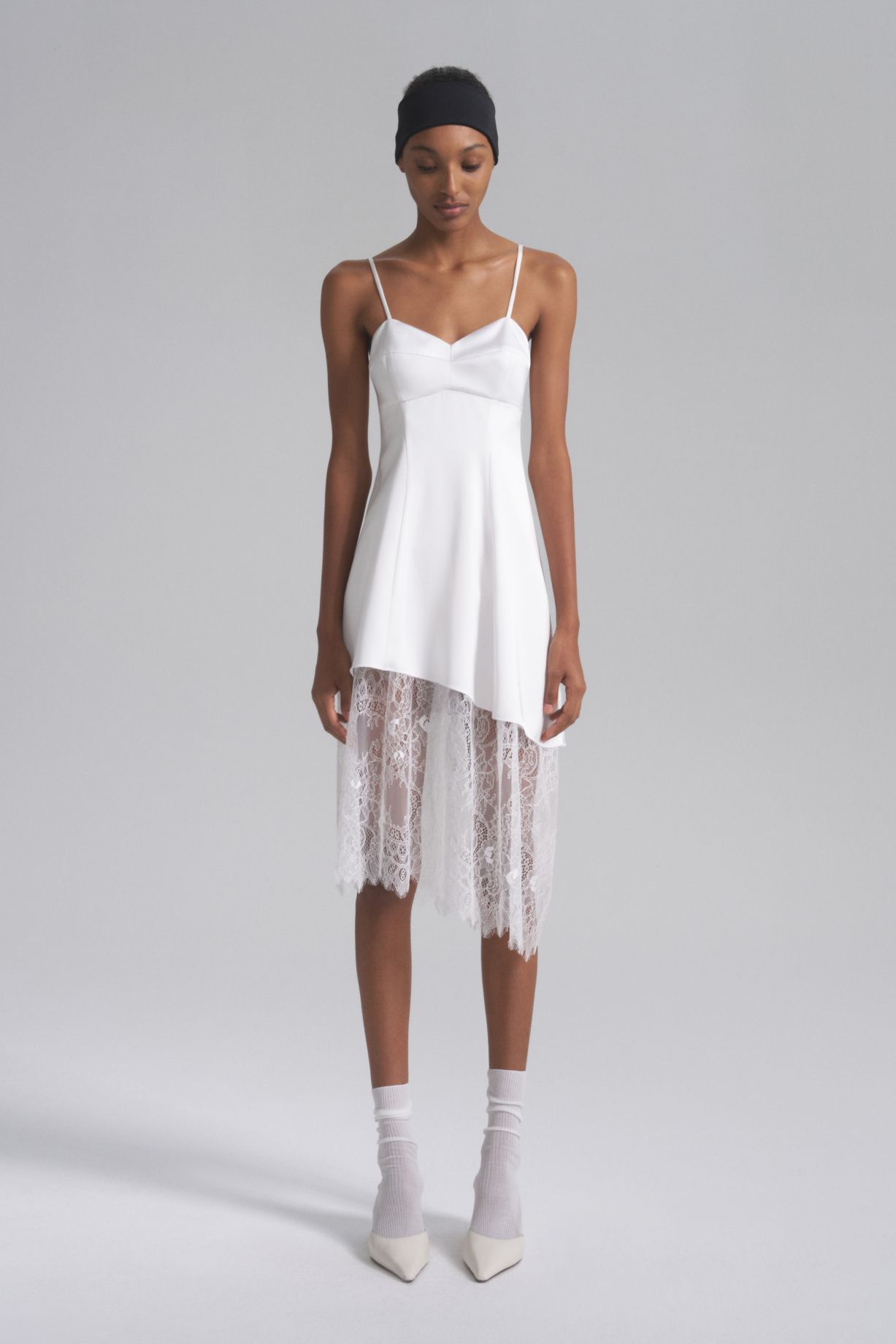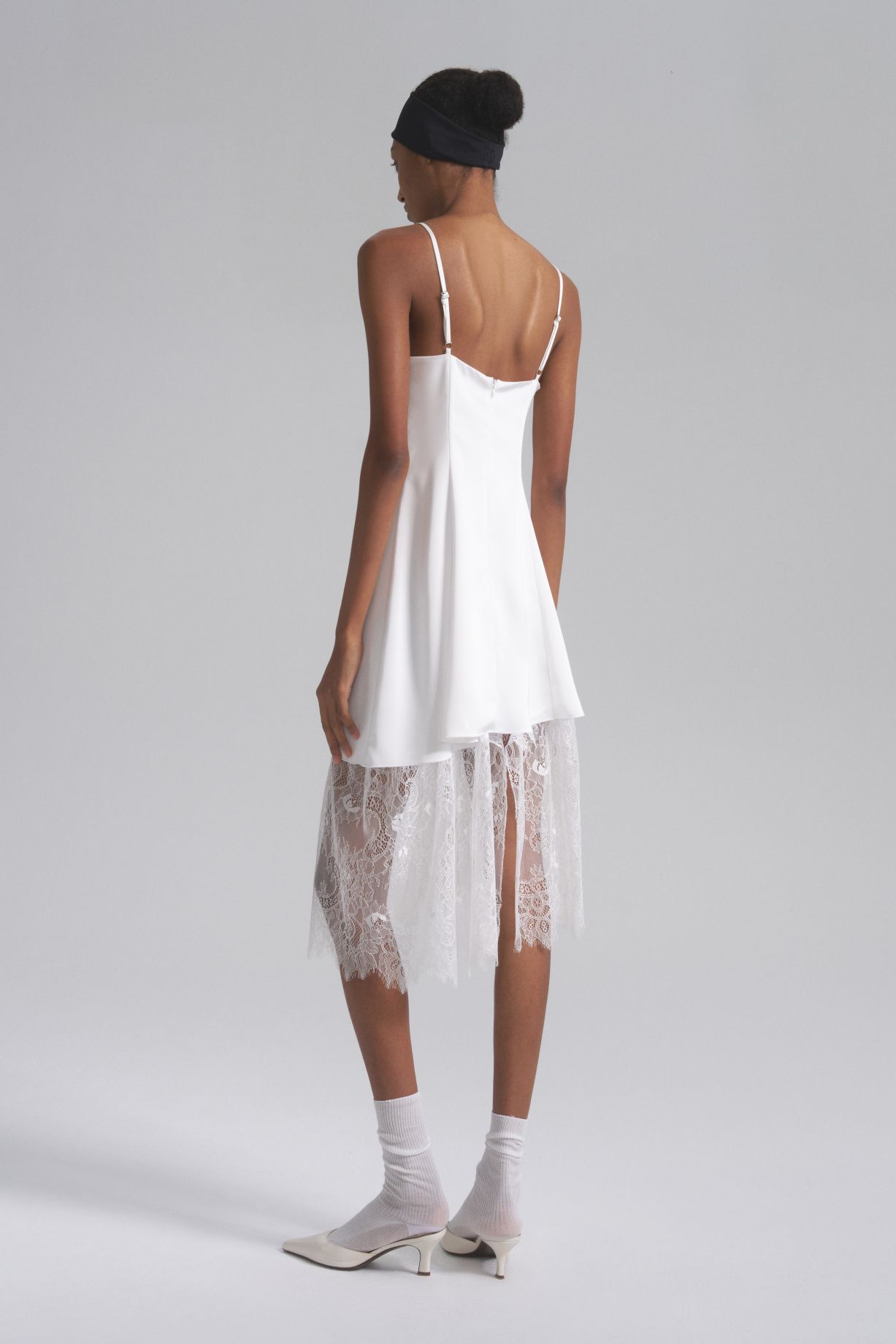 Асимметричное платье с декоративным кружевом из мягкого шелка. Выполнено по принципу классической сорочки на тонких регулируемых бретелях. Модель имеет мягкую корсетную основу, которая моделирует фигуру и визуально сужает талию. По низу платья проходит кружевная отделка. На спине застежка на потайную молнию.