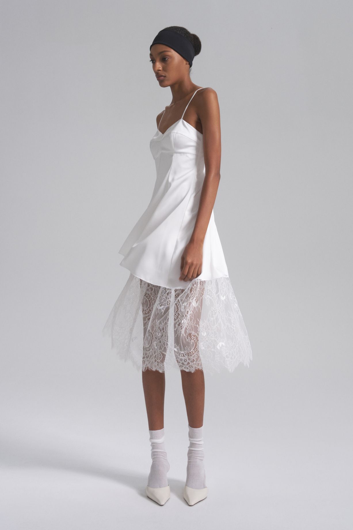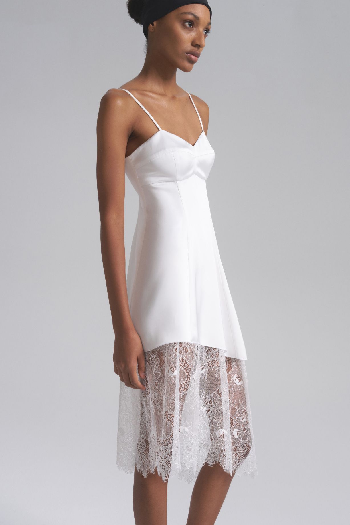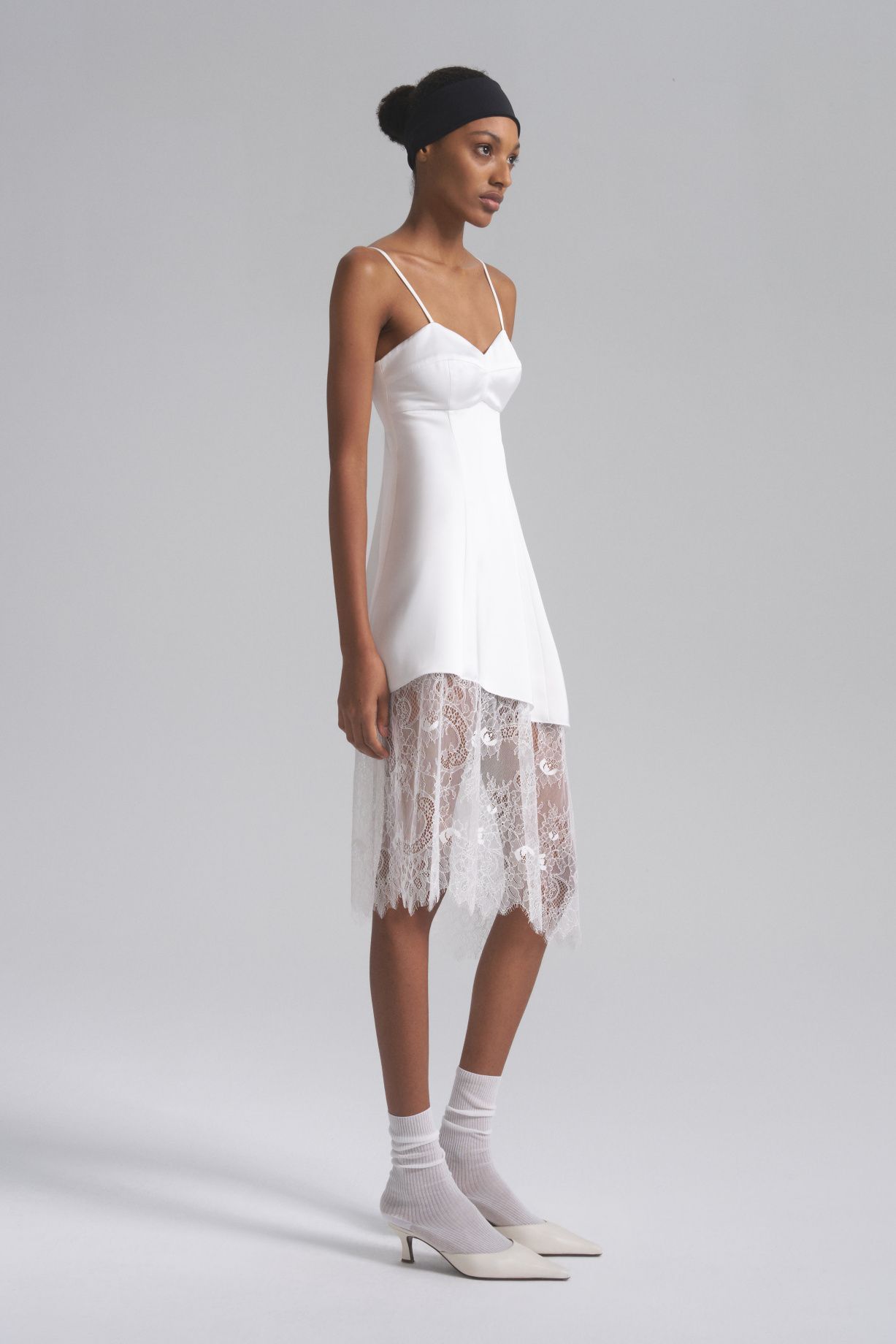 Асимметричное платье с декоративным кружевом из мягкого шелка. Выполнено по принципу классической сорочки на тонких регулируемых бретелях. Модель имеет мягкую корсетную основу, которая моделирует фигуру и визуально сужает талию. По низу платья проходит кружевная отделка. На спине застежка на потайную молнию.