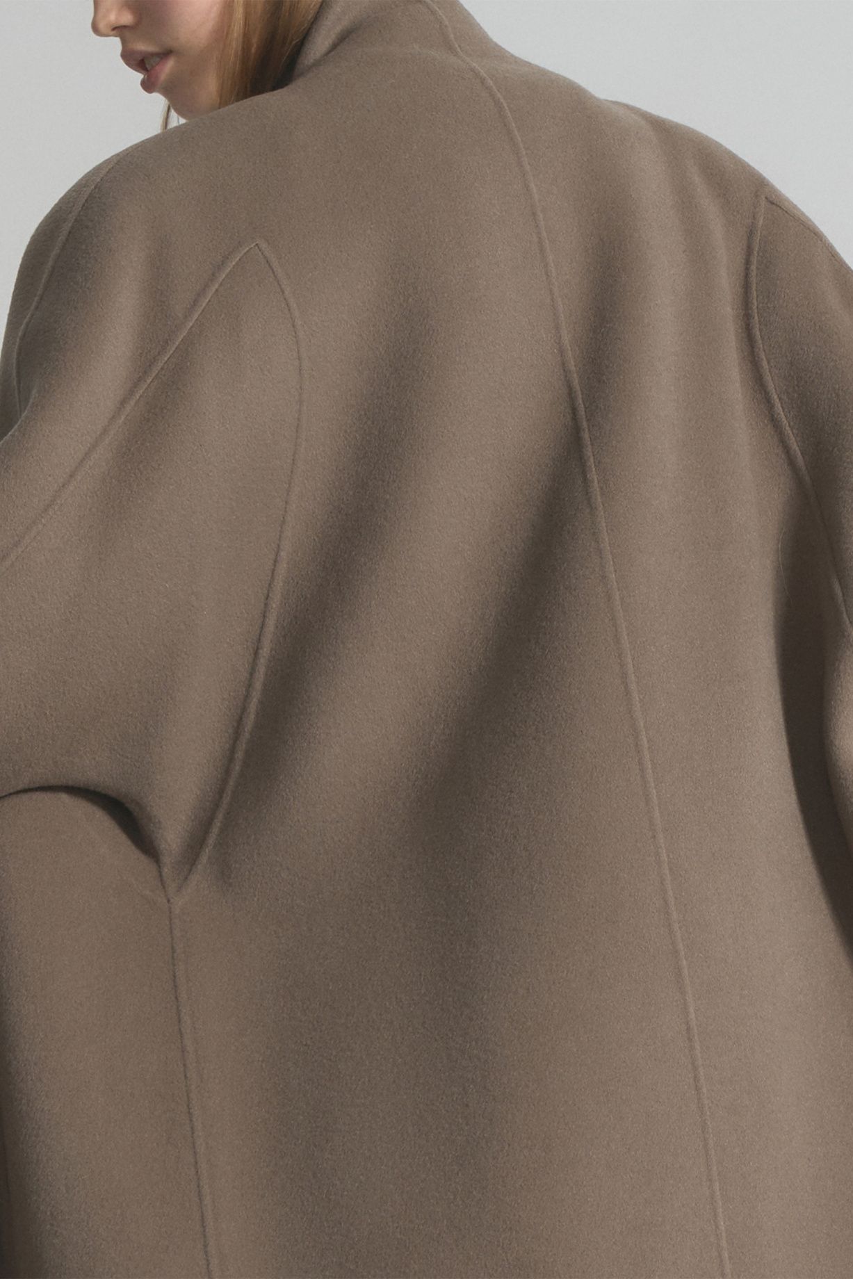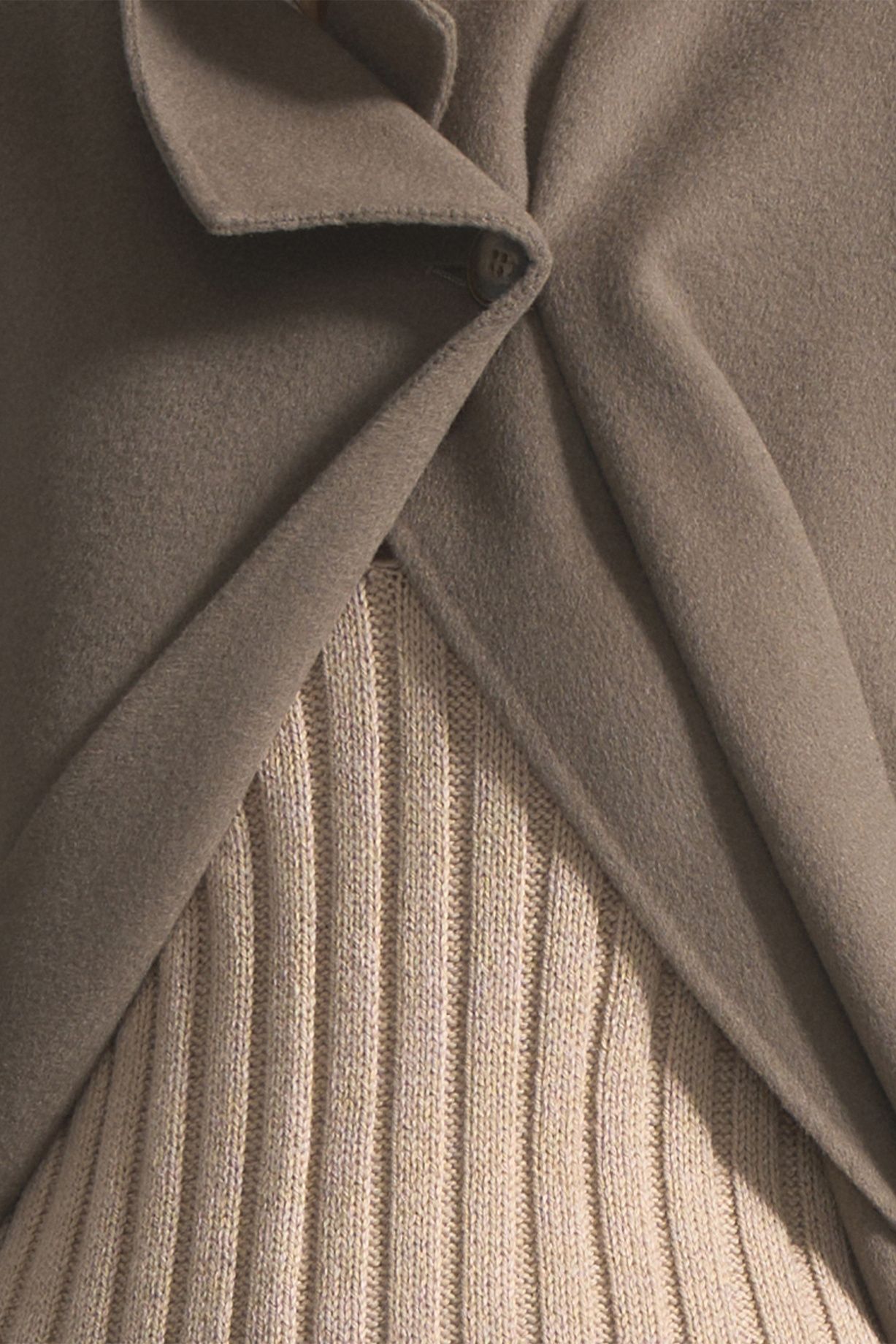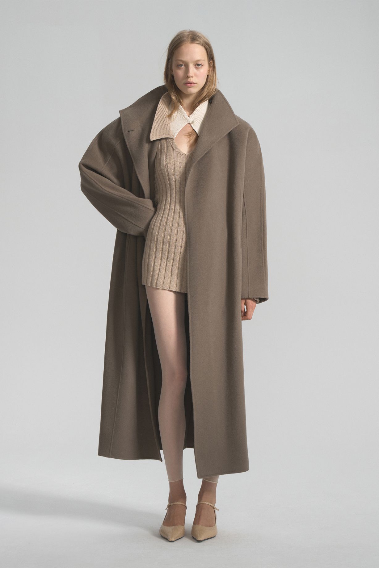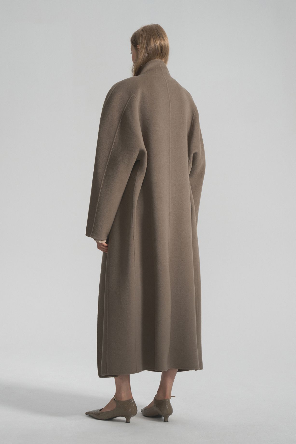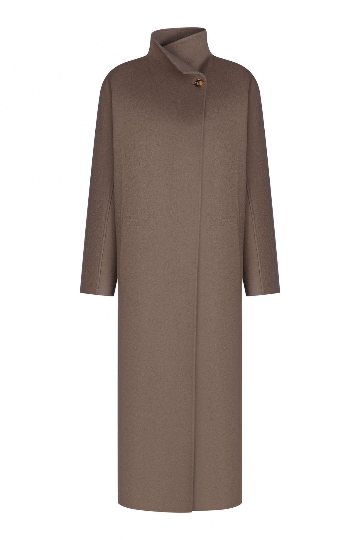 Объемное длинное пальто из кашемира и шерсти австралийского мериноса, спущенное плечо, воротник-стойка, рукава реглан. Выполнен два слоя, ткань соединена между собой незаметными швами по технологии double face, позволяя обойтись без подкладки.Состав: 90% шерсть, 10% кашемир