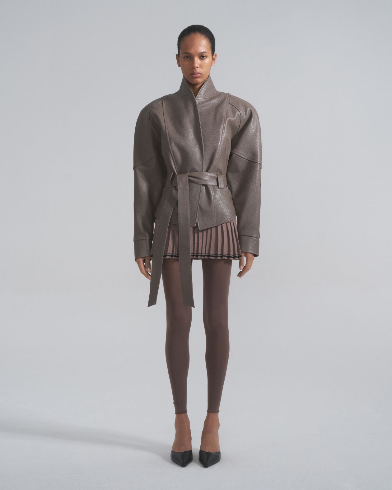 Приталенный жакет ручной работы из натуральной кожи премиального качества с поясом на талии. Объемные рукава с манжетой, воротник-стойка, обтянутая кожей пуговица.Состав: 100% натуральная кожа, подкладка 100% вискоза