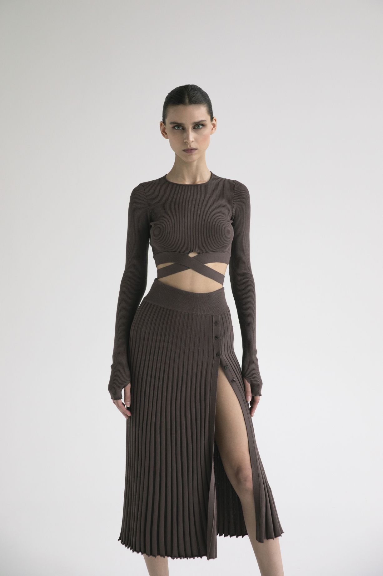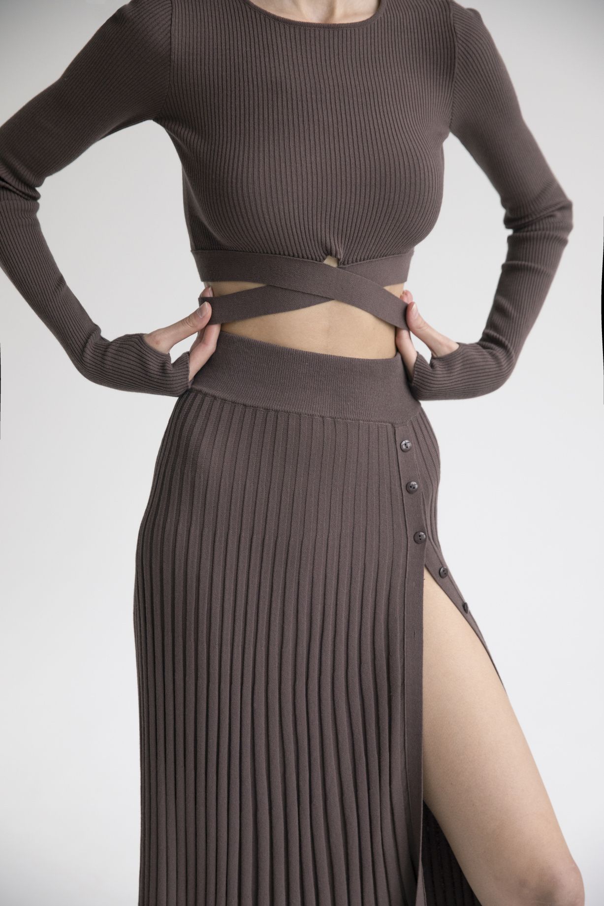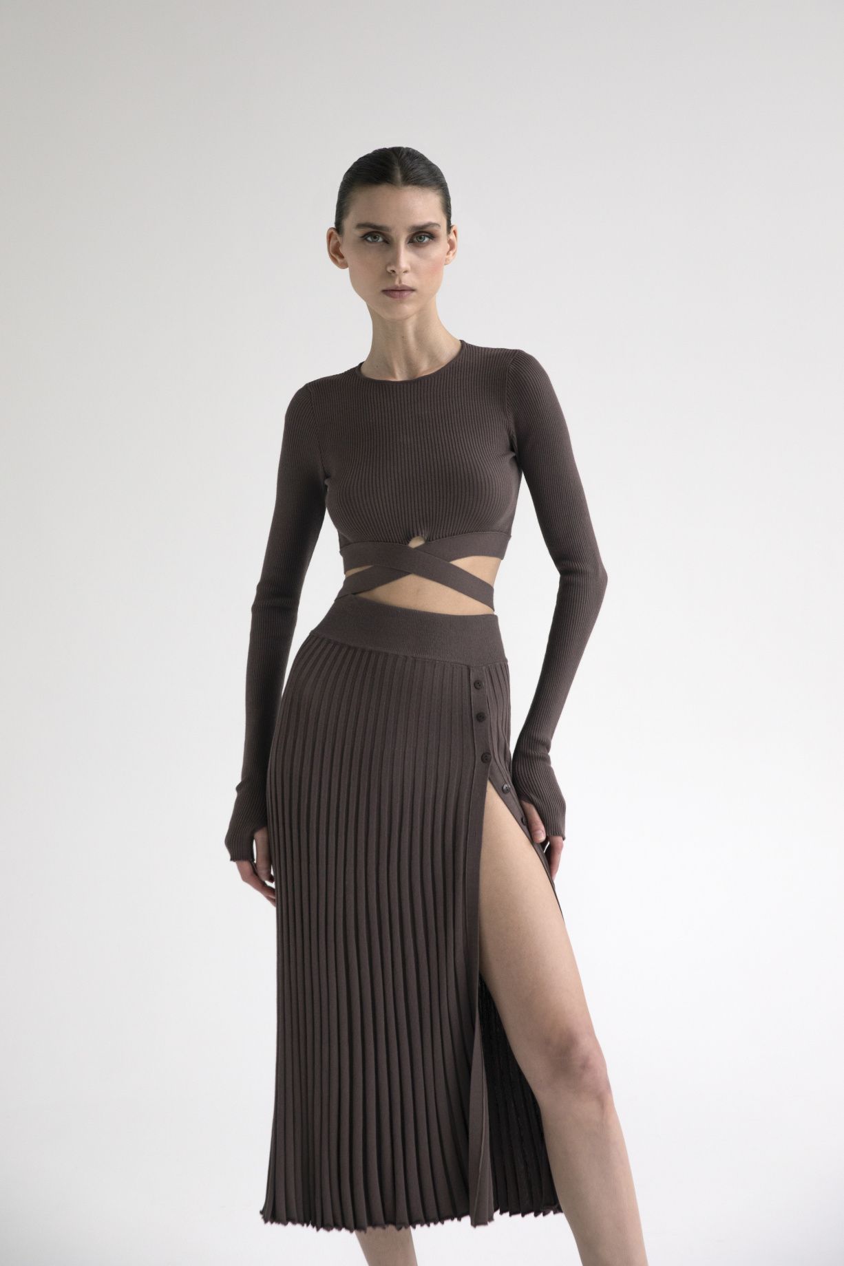 Длинная юбка-плиссе с застежкой на пуговицы длины макси из премиальной итальянской пряжи.Состав: 91% вискоза, 9% эластан