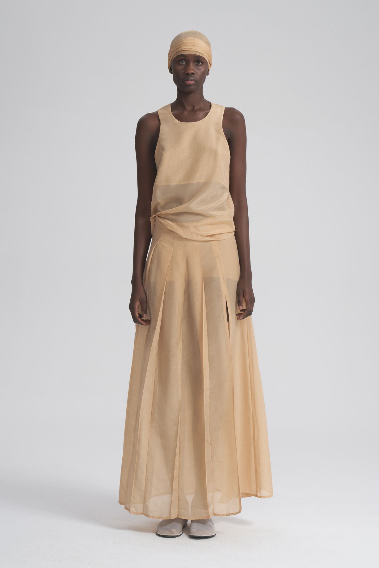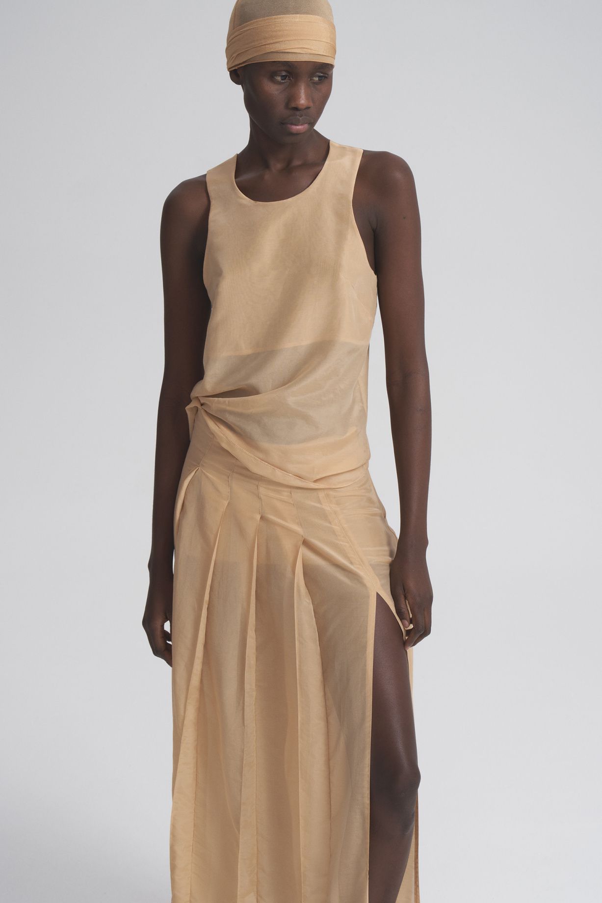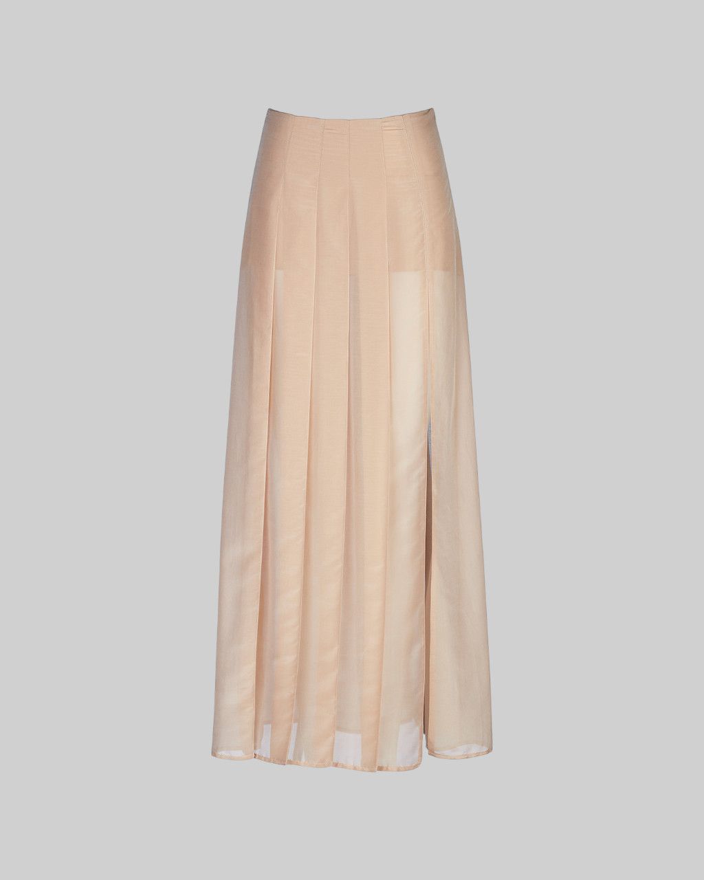 Юбка со складками из полупрозрачного хлопка и шелка окутывает, как вуаль, с разрезом.Состав: 70% хлопок, 30% шелк