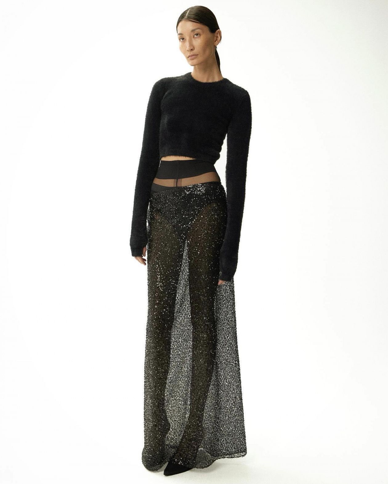 Юбка макси с пайетками станет ярким и элегантным дополнением вашего гардероба. Выполненная из 100% переработанного полиэстера, она обеспечивает легкость и прочность. Полупрозрачная ткань и блестящие пайетки создают роскошный и завораживающий вид, идеально подходящий для вечерних мероприятий и особых случаев. Носите её с блузками или топами из нашей коллекции для создания гармоничного и завершенного образа.