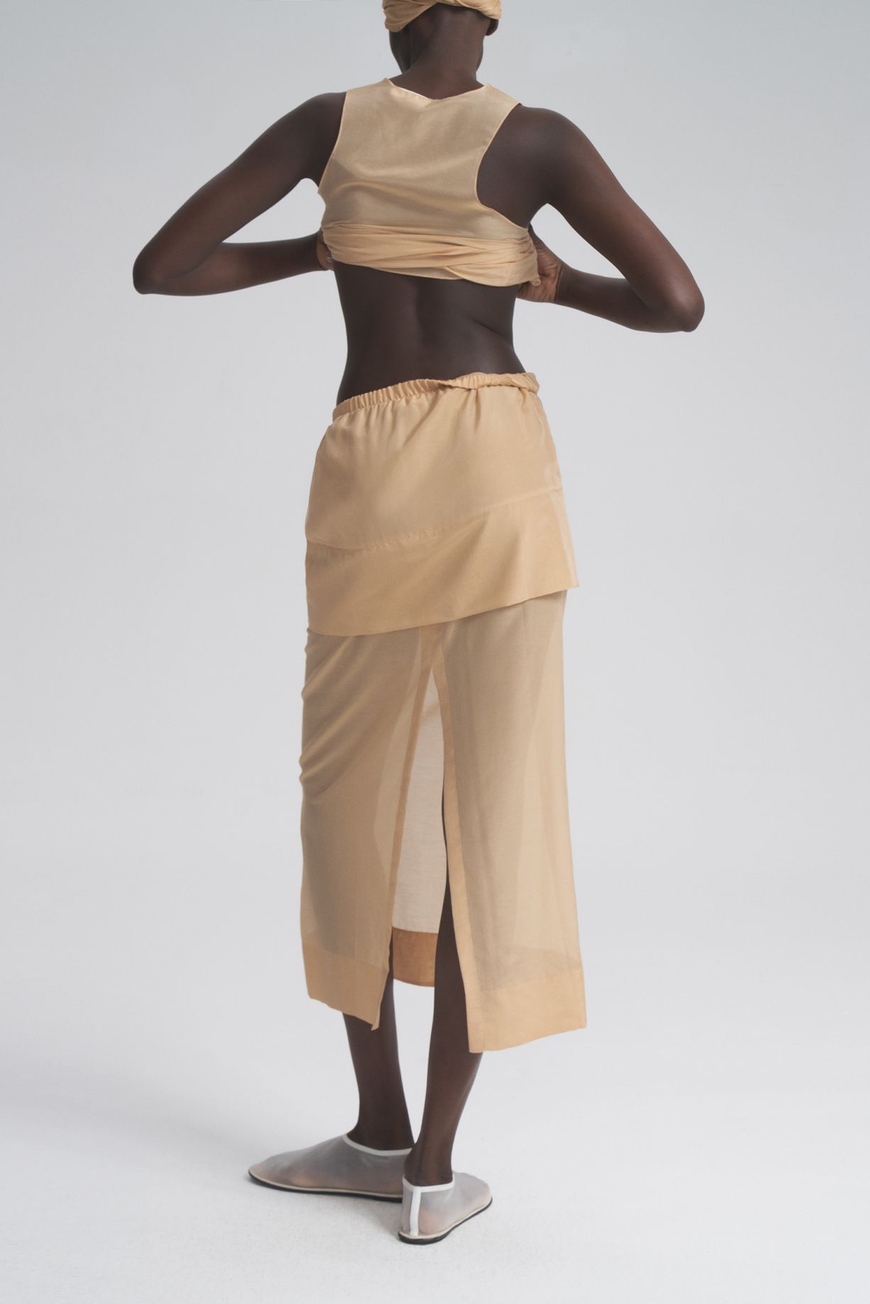 Юбка из полупрозрачного хлопка и шелка окутывает, как вуаль, прямого кроя, с подкладкой до линии бедер.Состав: 70% хлопок, 30% шелк